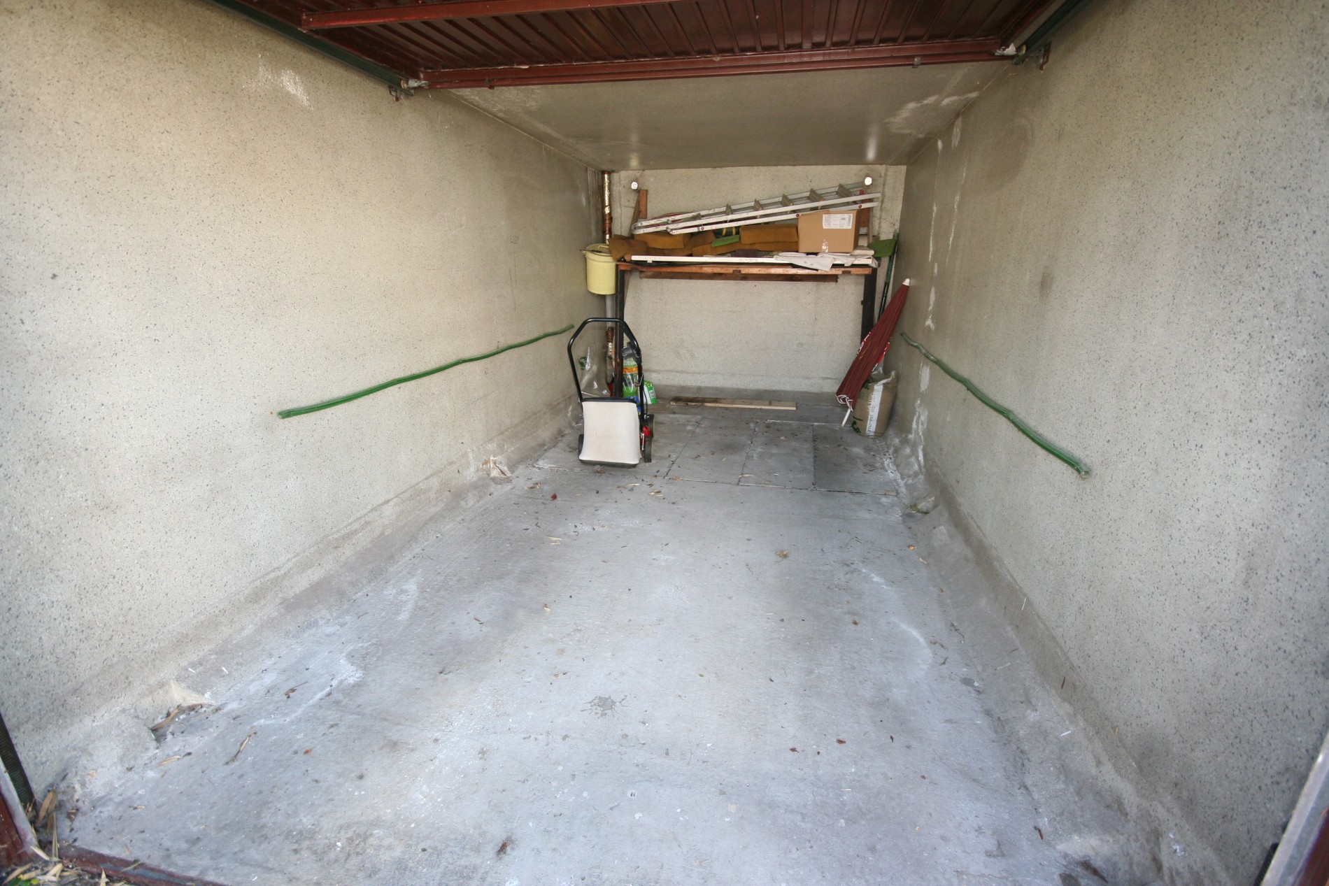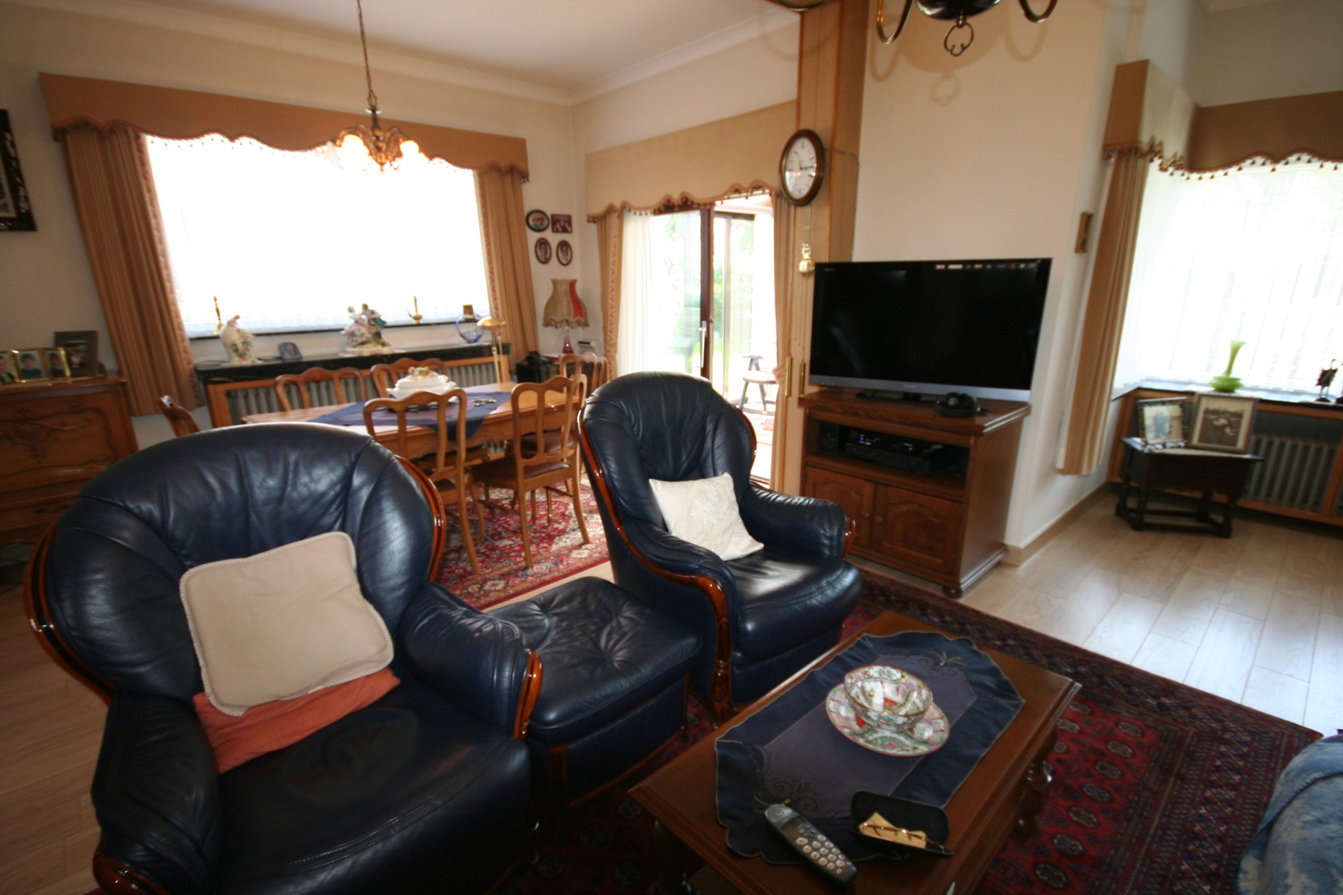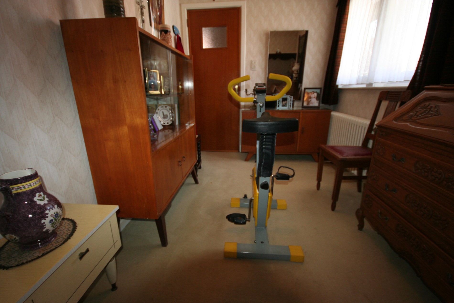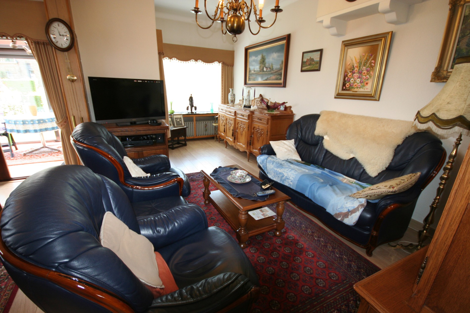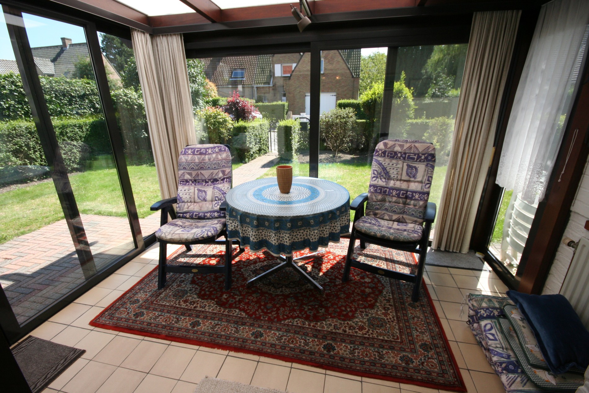 a) beneden: inkomhall + vestiairekast (trap in beuk),- toilet met w.c. + lavabo,- living (27 m²),- aansluitende veranda (3,50 x 2,65),- vernieuwde keuken (3,20 x 3,15) voorzien van L-vormige keukenblok (in wit-grijs gecérusseerd volle eik) + ingebouwde dubbele inox afwasbak, dampkap, elektrisch kookfornuis (ceramische kookplaat), en frigo,- keldergat (met elektrische installatie + teller),- voorraadkelder,- wasplaats met nieuwe H.R.+ wandgenerator (Thermonate Bulex), afgietbak, aansluiting voor was- & droogautomaat, en achterdeur + buitentrap (met kast + aardgasteller),- mooi en zonnige achtertuintje,- oprit,- garage (5,30 x 2,70) met metalen kantelpoort,- zonnig zijtuintje met châlet-tuinhuisje,- zonneterras,- en zonnig voortuintje ;