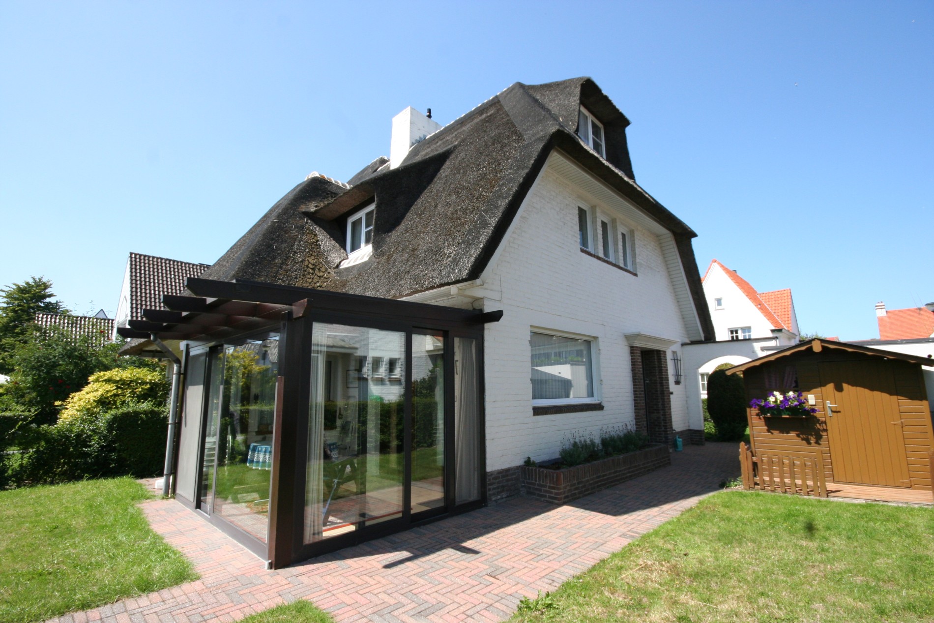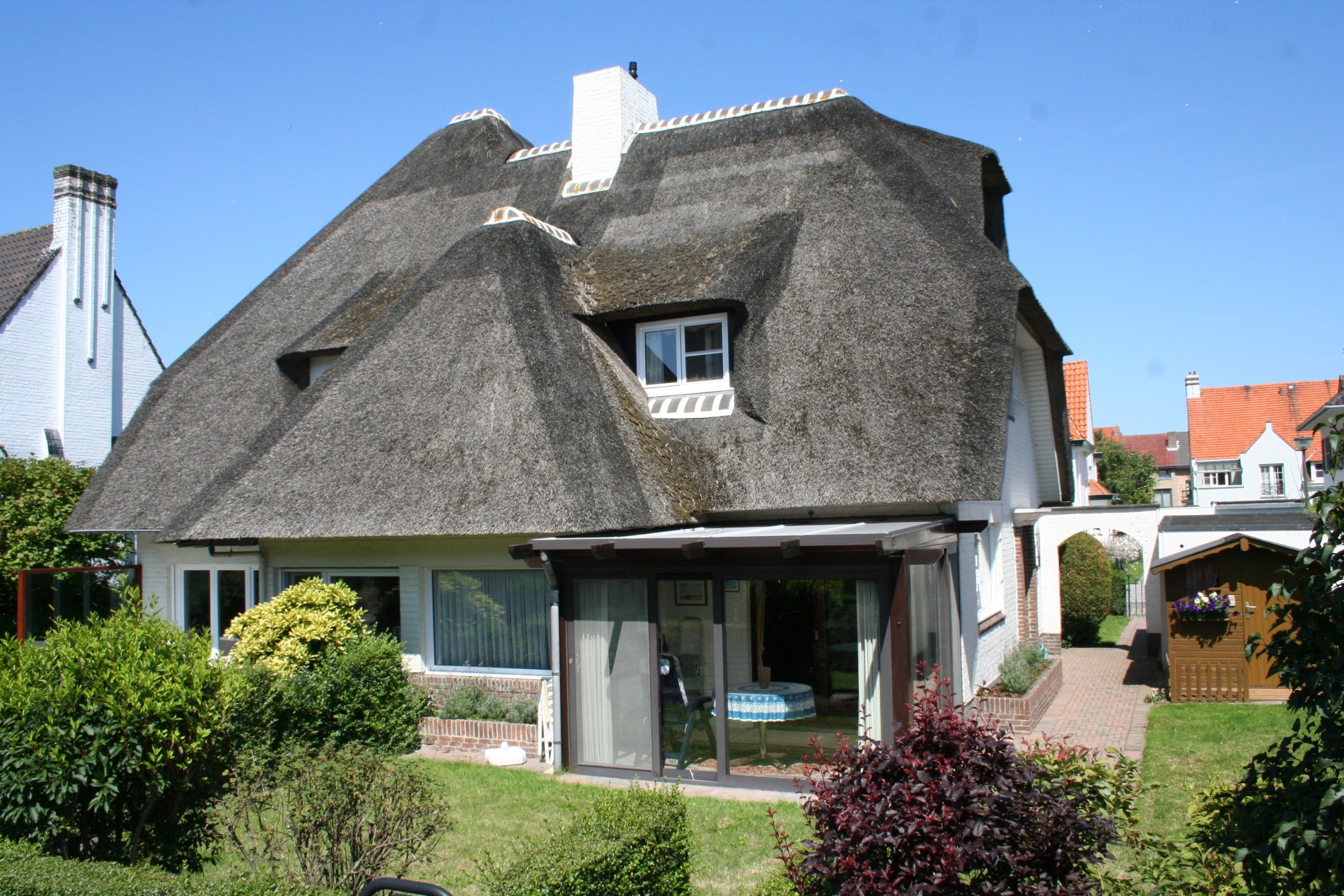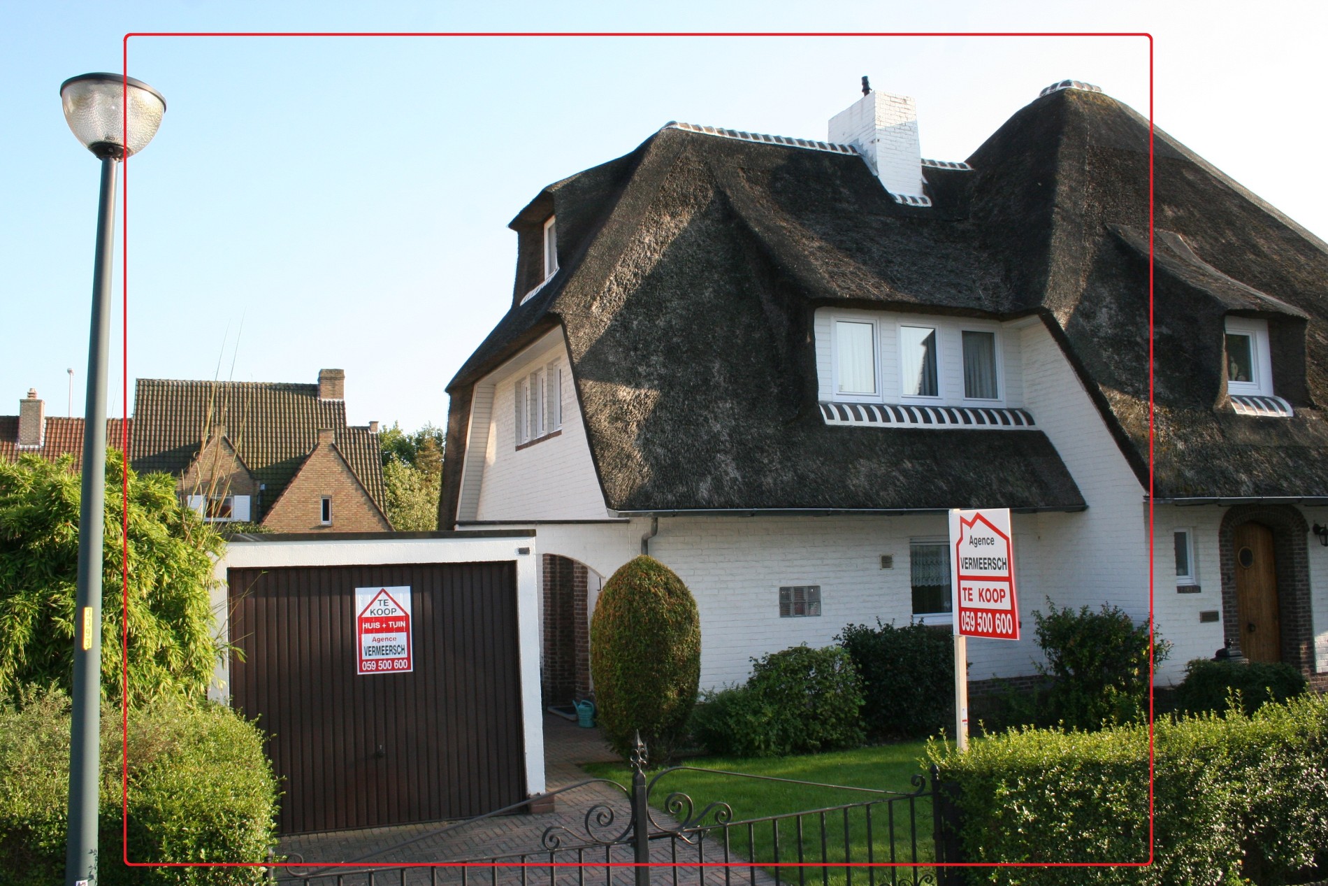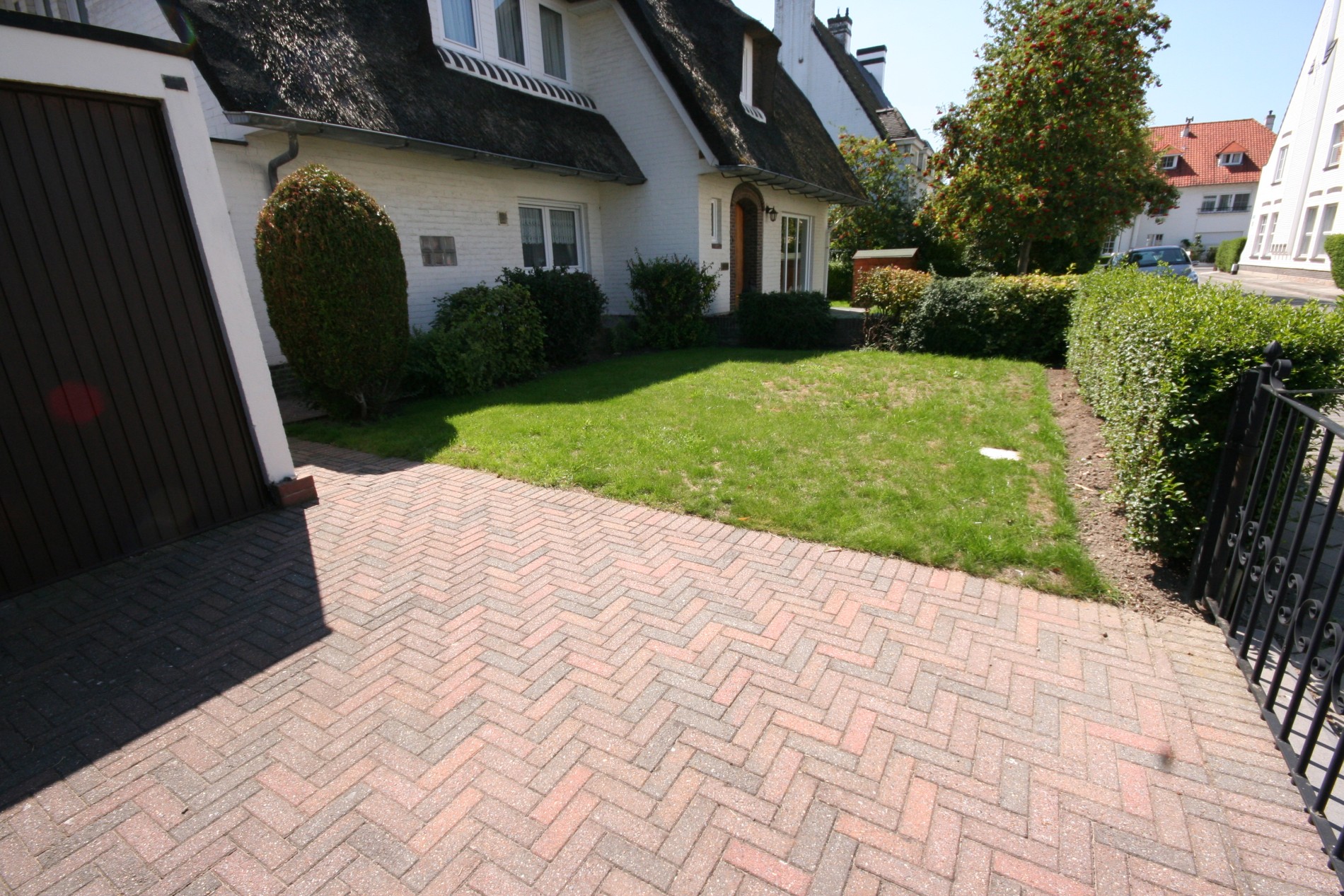 Riante en perfect onderhouden ééngezinswoning in cottage-stijl, stevig en op traditionele wijze gebouwd in 1957, op een perceel bouwgrond van 11m breed op 25m diep. De woning is 6m breed en 10m diep. De bebouwde oppervlakte bedraagt: 77m², de benutbare oppervlakte = 165m², en de volume = 672m³. Verzorgde buitengevels, uitgevoerd in (wit geschilderd) bak-steen + onderplint in donker-bruine gevelbrieken. De voorgevel is zuid-gericht, de zijgevel (kant inkomhall) is oostgericht, en de achtergevel is westgericht. Verzorgd & vernieuwd buitenschrijnwerk in witte kunststof (witte PVC). De meeste ramen zijn voorzien van dubbele beglazing & PVC-rolluiken. Prachtige strooiendak (goed geïsoleerd), met sierlijke dakvensters in zuid-, oost-, & westdakvlak. Stevige kapconstructie, uitgevoerd in Oregonhout. Zinken dakgoten en dito afleidingen. Zonneterras, oprit, en voetpad belegd met betonnen klinkers. Zonnige tuin (gazon + diverse struiken & boompjes * buxushaag op de perceelgrenzen), met houten tuinhuisje-châlet. Mooie (nieuwe) binnendeuren (in Franse eik). Ceramieke tegelvloeren in de hall, w.c., keuken, veranda,en kelder. Nieuw eiken laminaat-parket in de living. Novylon op de verdieping. De schuine wanden en plafond op de zolderkamer zijn afgewerkt met decawaldplaten en werden geïsoleerd. Vergunde veranda, in een constructie van gelakte aluminium, en voorzien van dubbele beglazing. Rustieke smeedijzeren toegangshekken (a/d Nachtegalenlaan) en smeedijzeren inrijpoort (a/d Meiboomlaan).