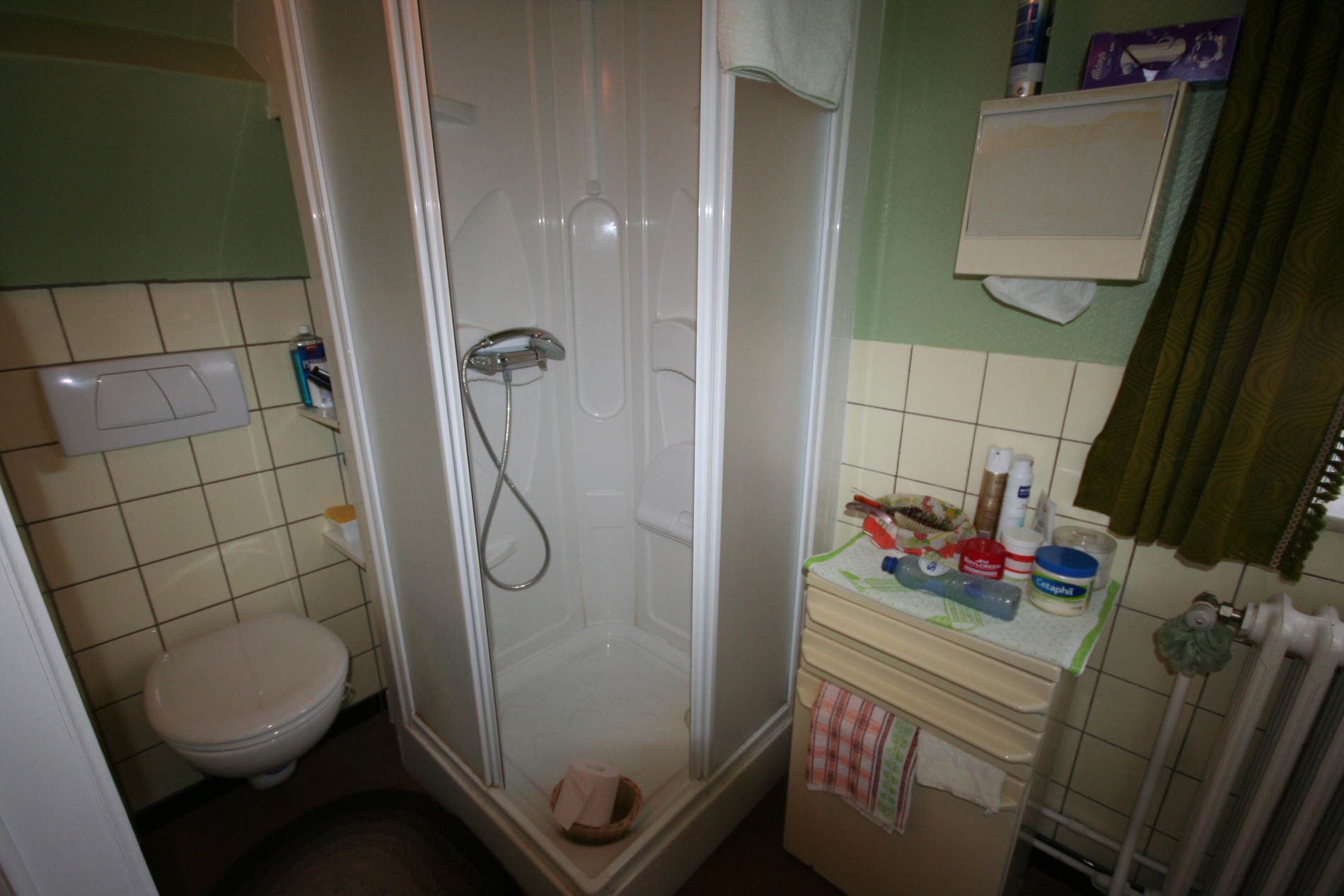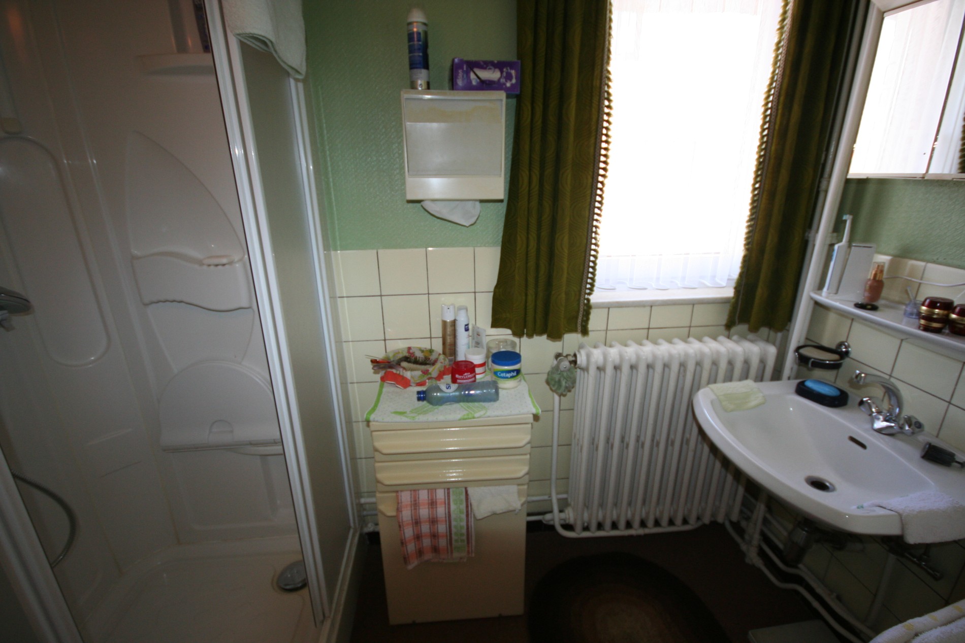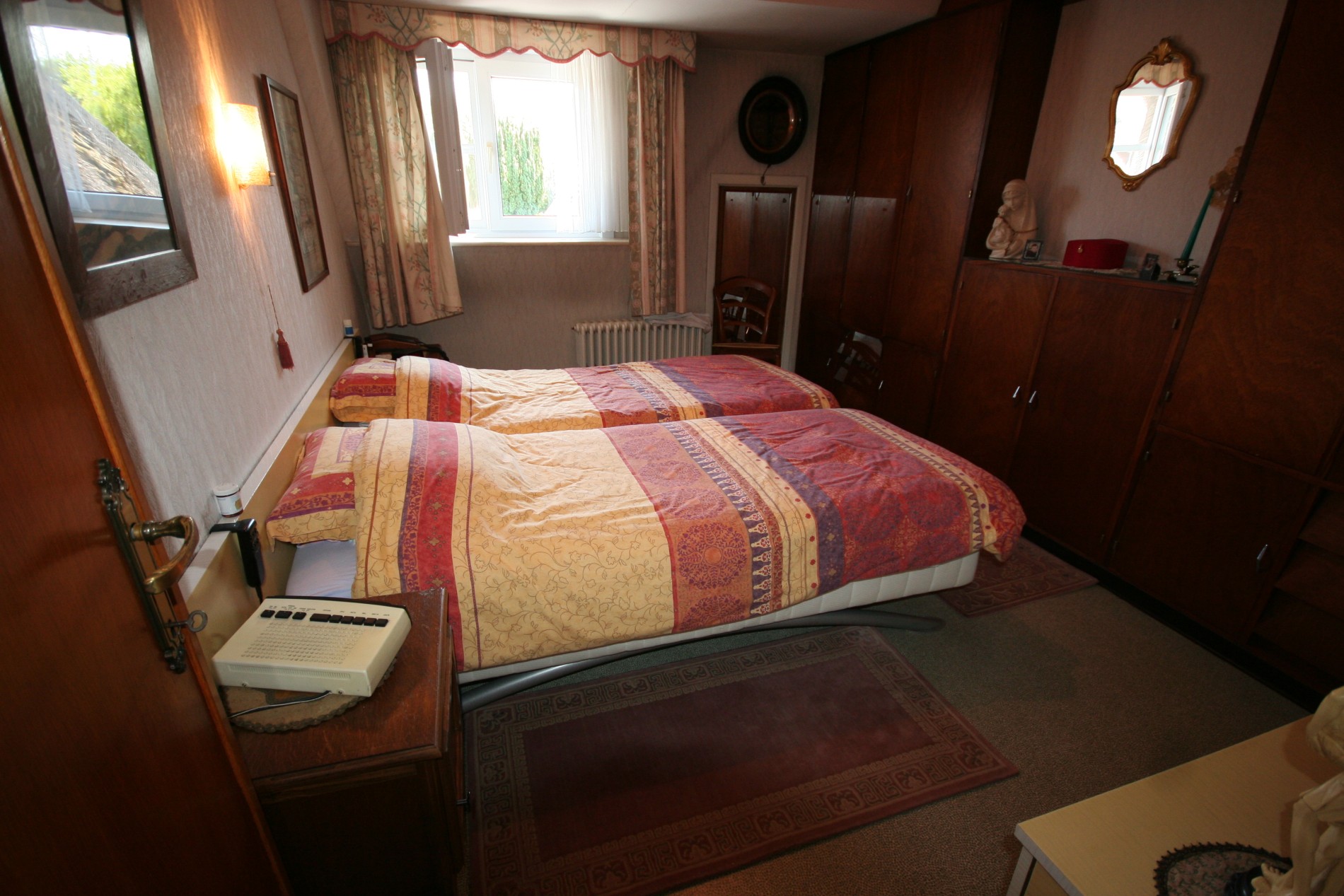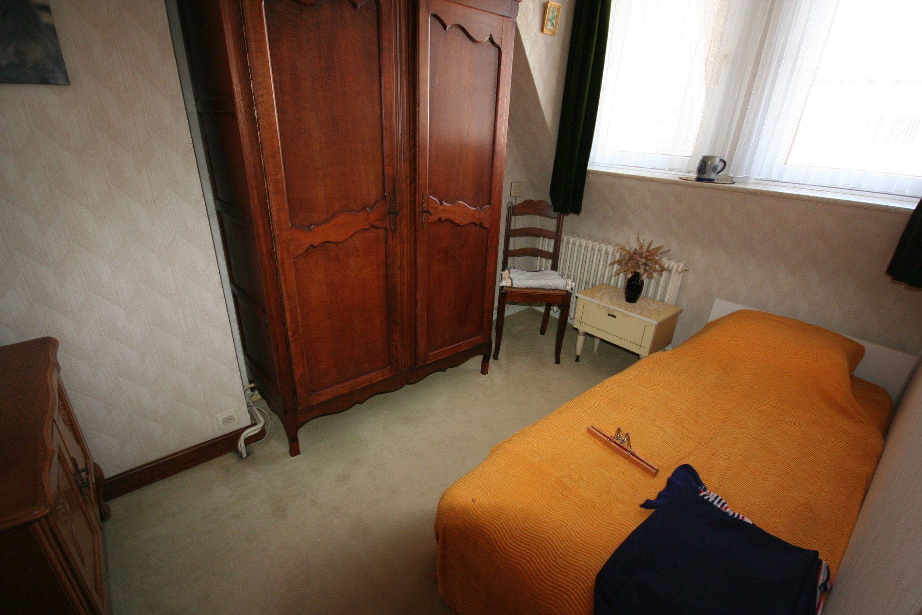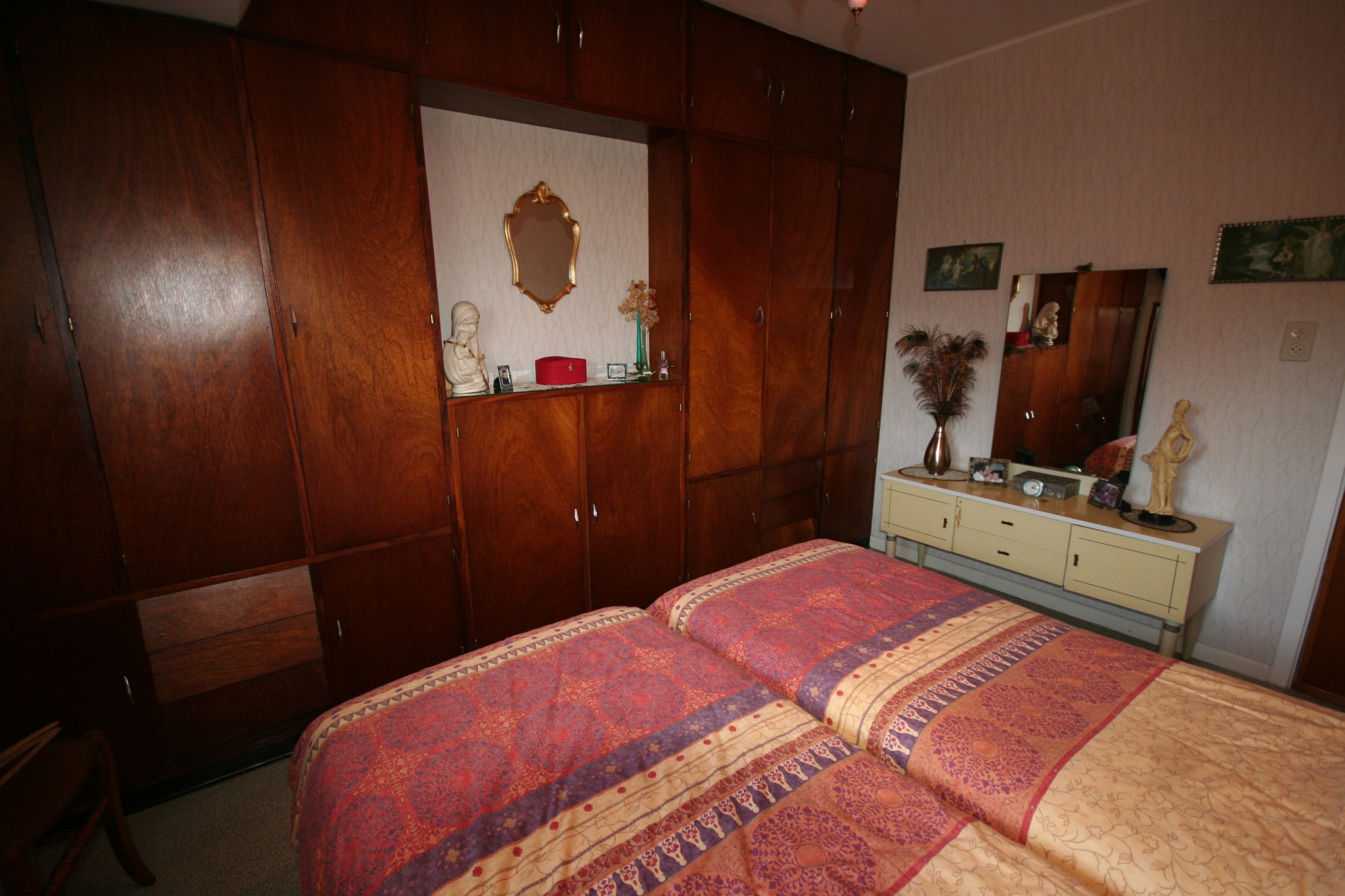 b) verdiepingen: overloop (+ vaste houten zoldertrap),- voor-slaapkamer (3,40 x 3,20) + met ingemaakte kasten + zolderkast,- hoek-slaapkamer (3,20 x 2,20),- achter-slaapkamer (3,15 x 2,10),- badkamer met hang-w.c., douche, en lavabo (witte faiënce),- en mansardekamer met lavabo.