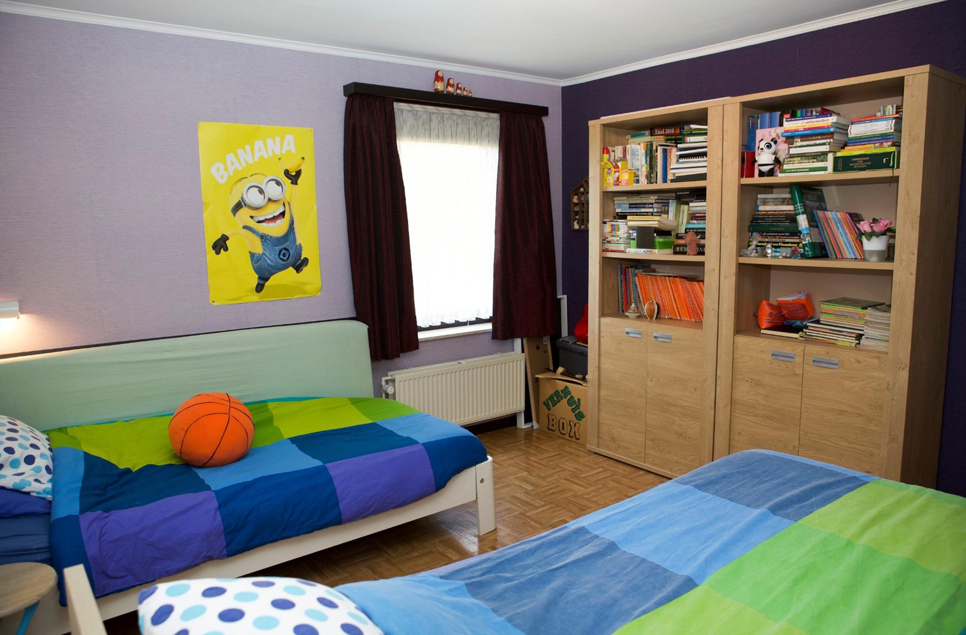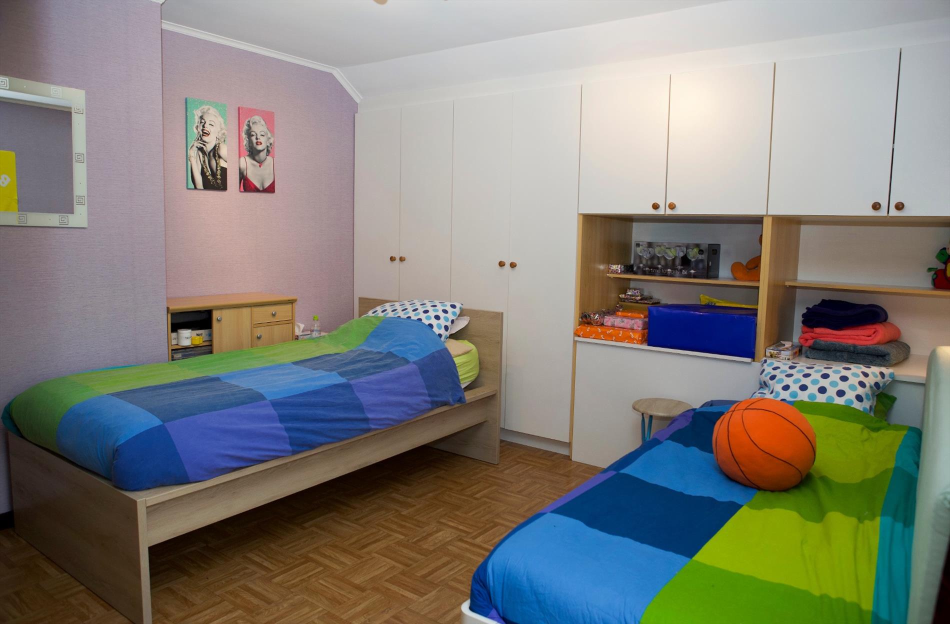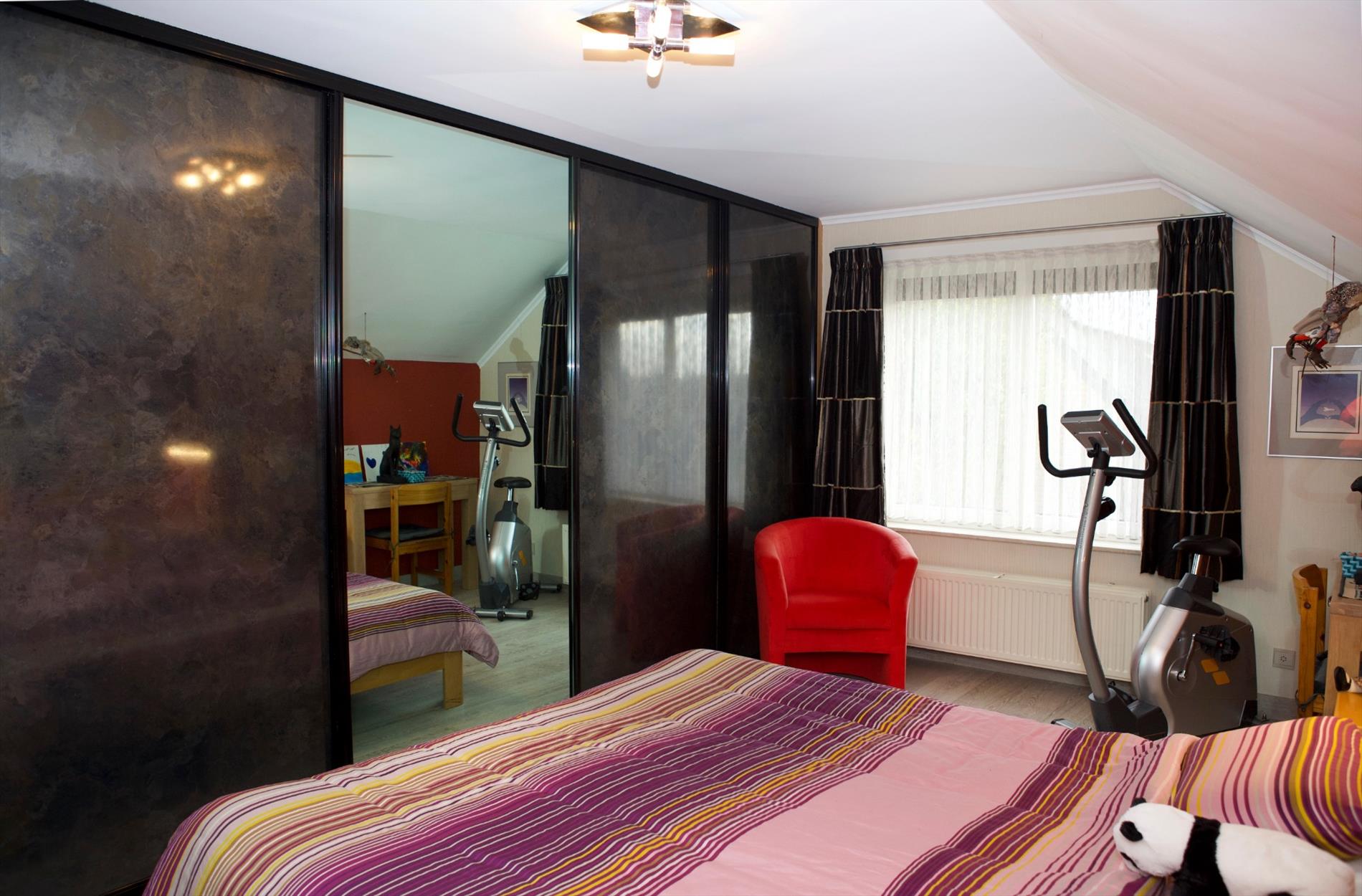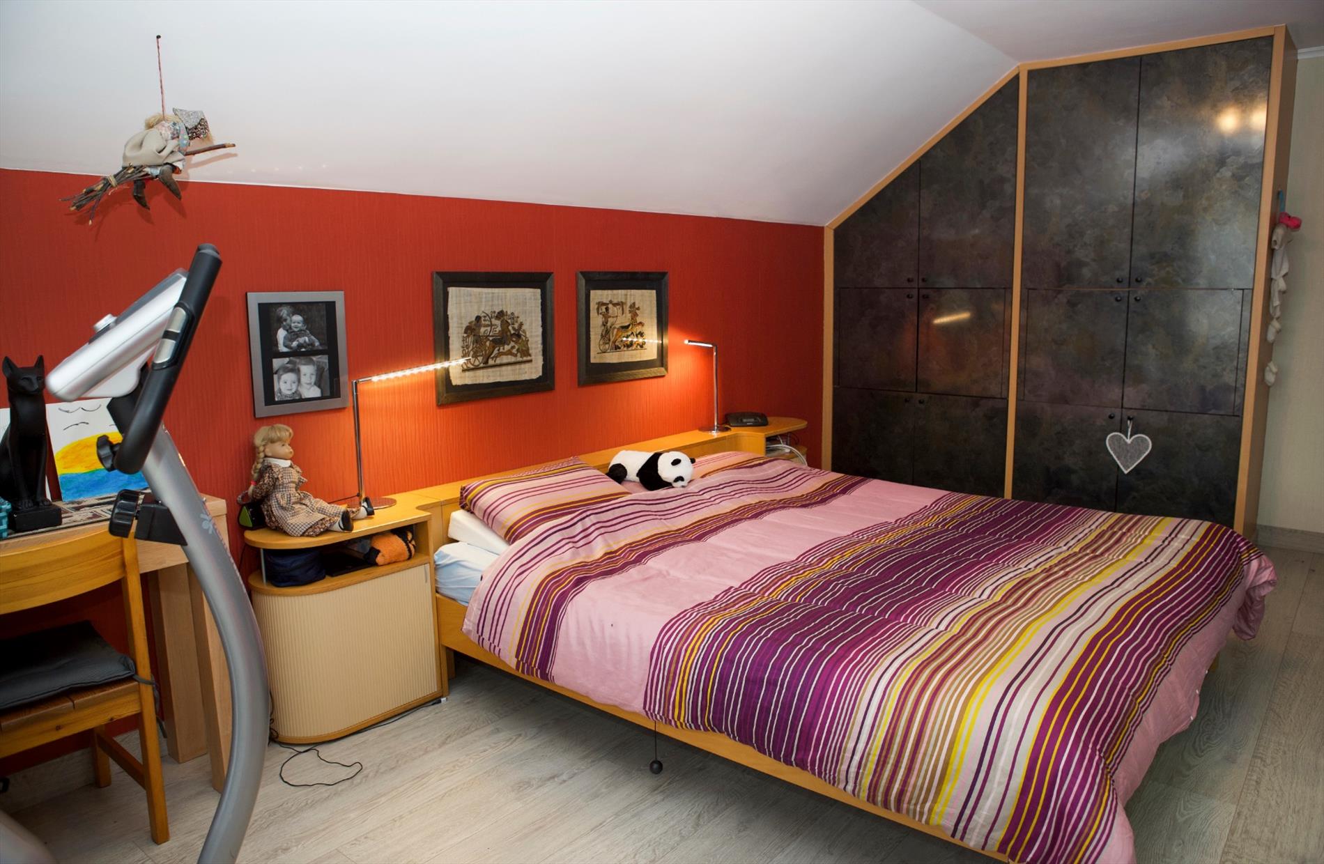b) 1ste & zolderverdieping: nachthall (3,45 x 3,40) + zolderluik & houten trap,- slaapkamer 1 (4,10 x 3,85) + aanbouwkasten,- master-bedroom (5,40 x 2,96) + dressings- TV- en bureaukast,- badkamer (3,86 x 2,45) met douche, hang-w.c., en toiletmeubel + 2 inbouwde lavabo’s (velux-raam * laminaat-plafond + inbouwspotjes),- 2 kinderkamers (resp.: 3,50 x 2,75 en 3,50 x 2,50) + aanbouwkasten,- en zolderberging.