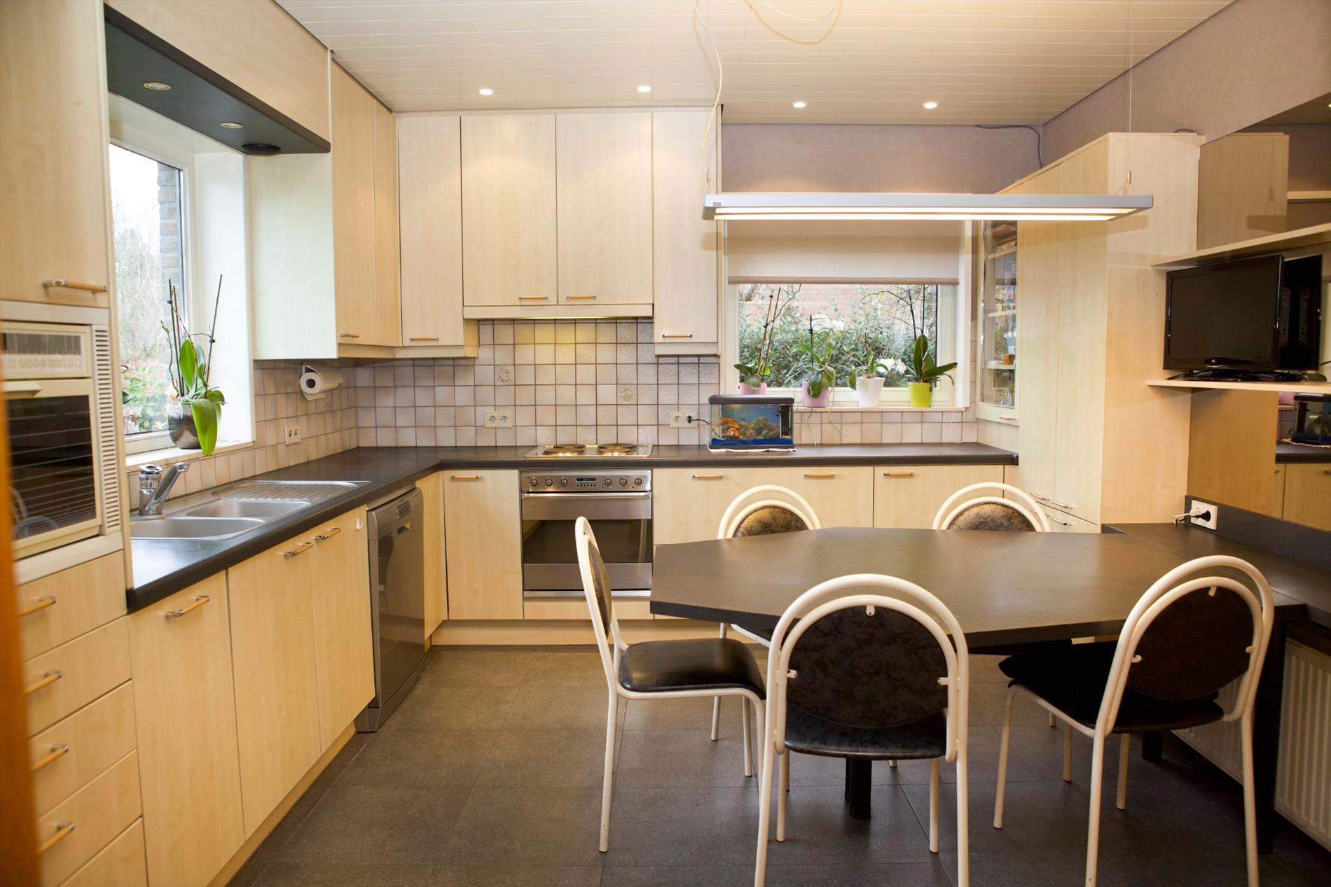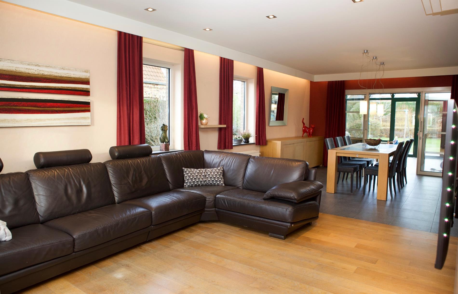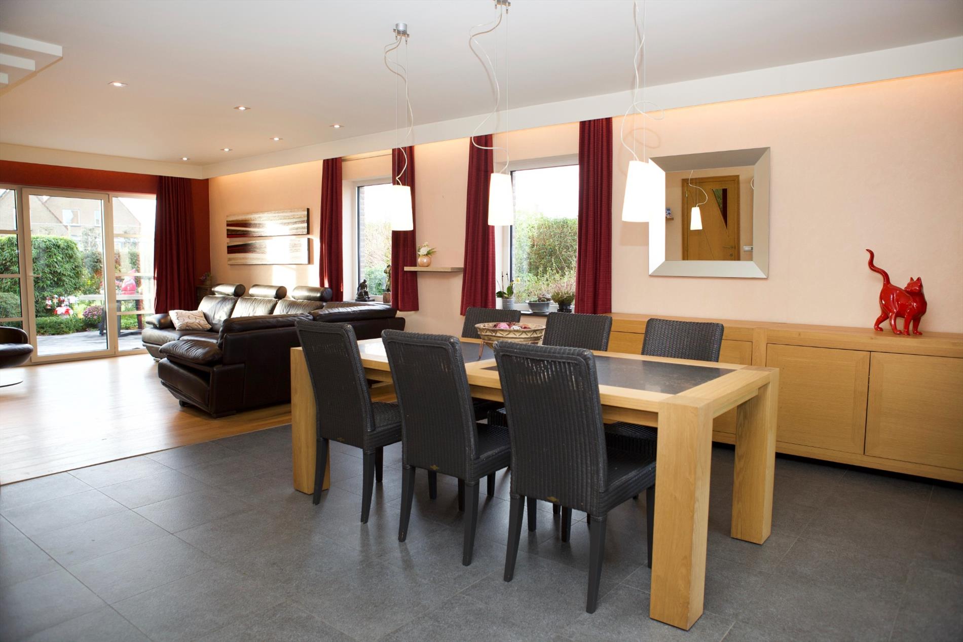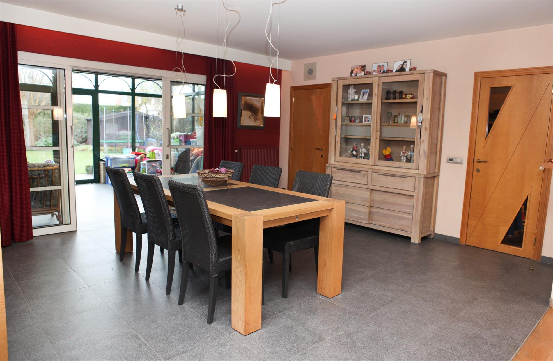 OMVATTENDE : a) gelijkvloers: portiek (2,40 x 1,50),- inkomhall (4 x 2,50),- traphall (2,85 x 1,50) + trap in beuk,- toilet met w.c. + lavabo,- luchtige living (42 m²) met eetplaats en salon (plafond + inbouwspotjes),- ingerichte bureau (2,75 x 1,80) + ingemaakte kasten,- veranda (5,20 x 4 * plafond + inbouwspotjes),- keuken (4,20 x 3,86) met L-vormige keukenblok (onder- en bovenkasten in es-meubelplaat) + aanbouwtafel, en ingebouwde elektrische kookplaat, dampkap, oven, microgolfoven, vaatwas, frigo, en dubbele inox afwasbak (laminaat-plafond + inbouwspotjes),- stookplaats met H.R.+ mazoutgenerator,- garage (22,50 m²) met fietsenstalling + 2 meranti kantelpoorten + zijdeur, hydrofoor (regenwater), afgietbak, aansluiting voor was- en droogautomaat, en water- en elektriciteitstellers ;
