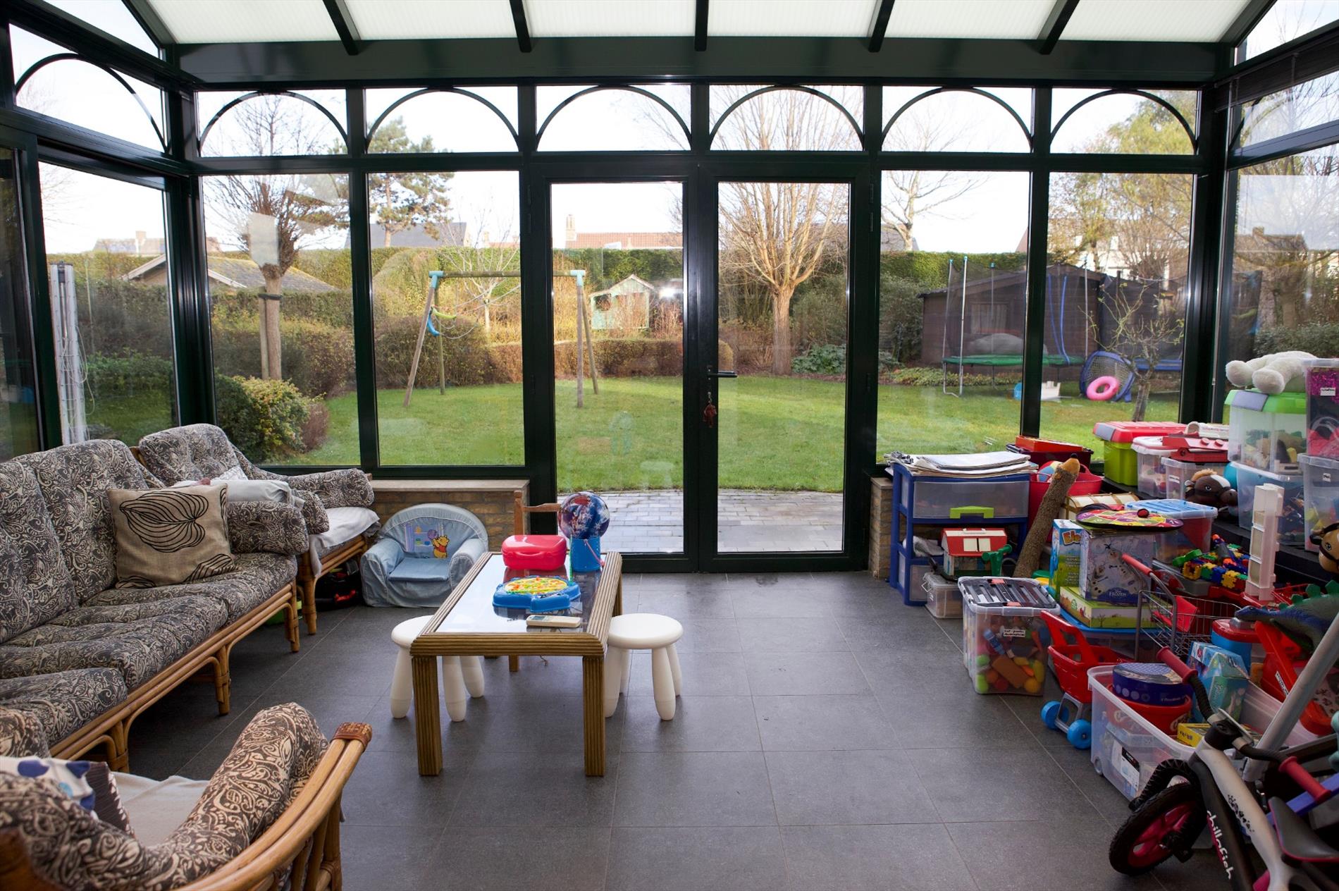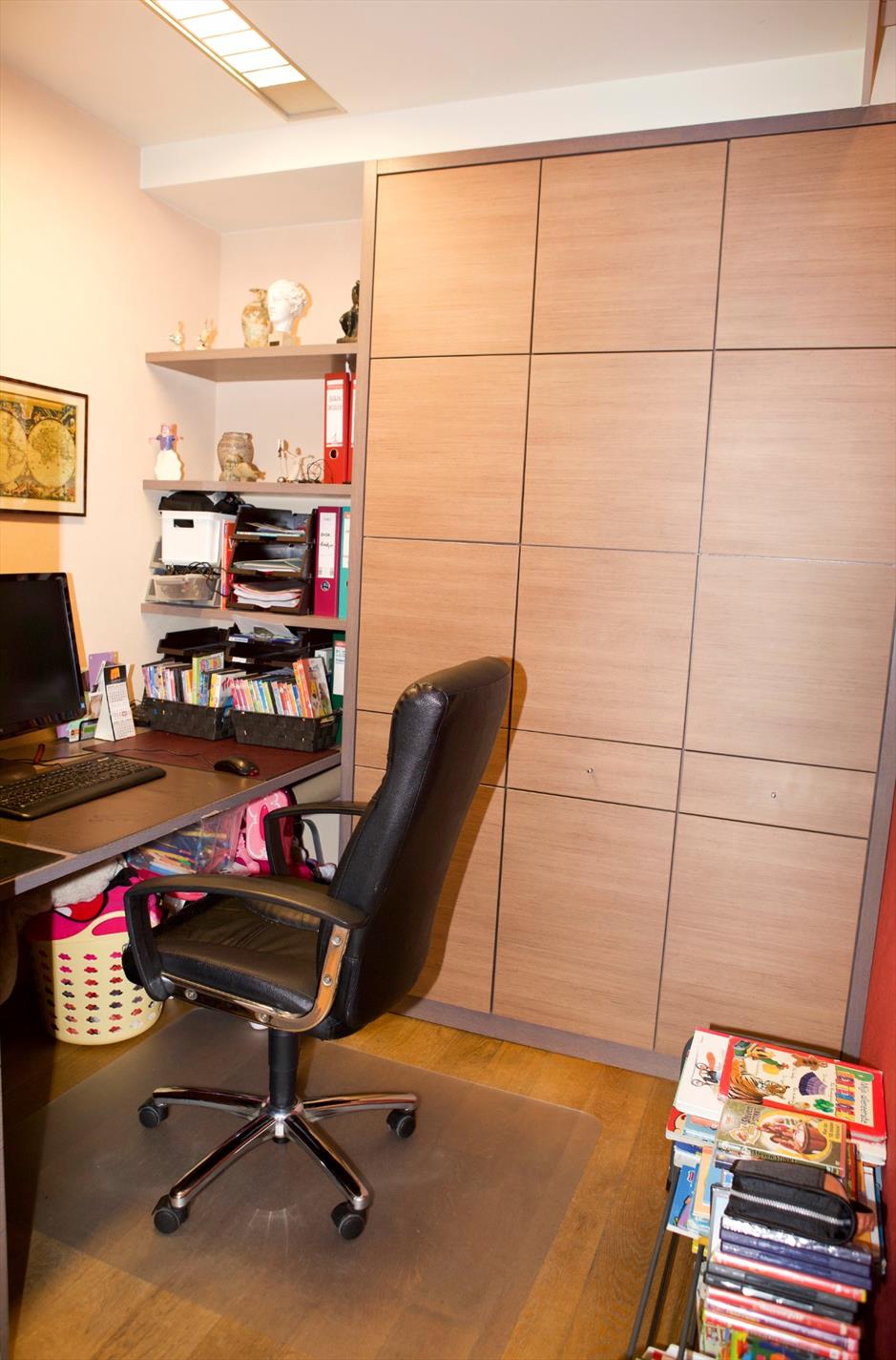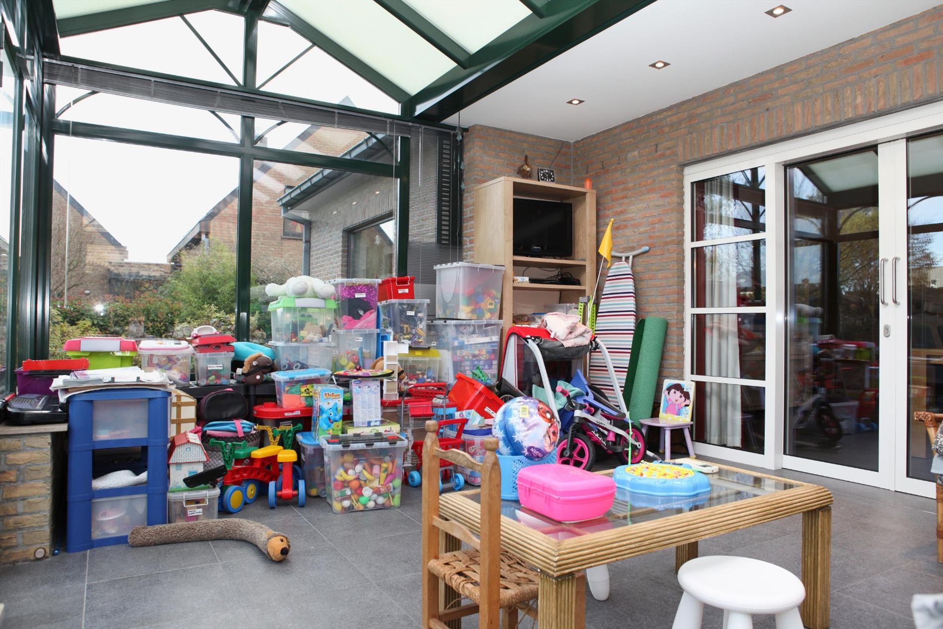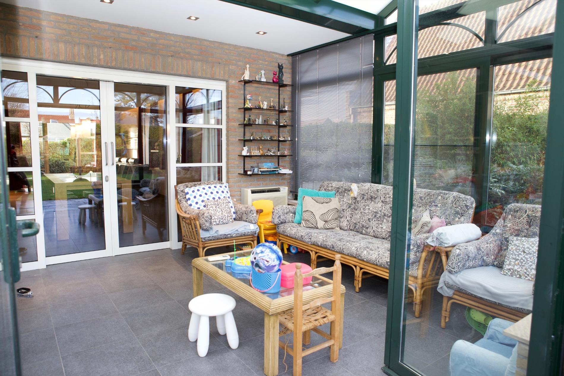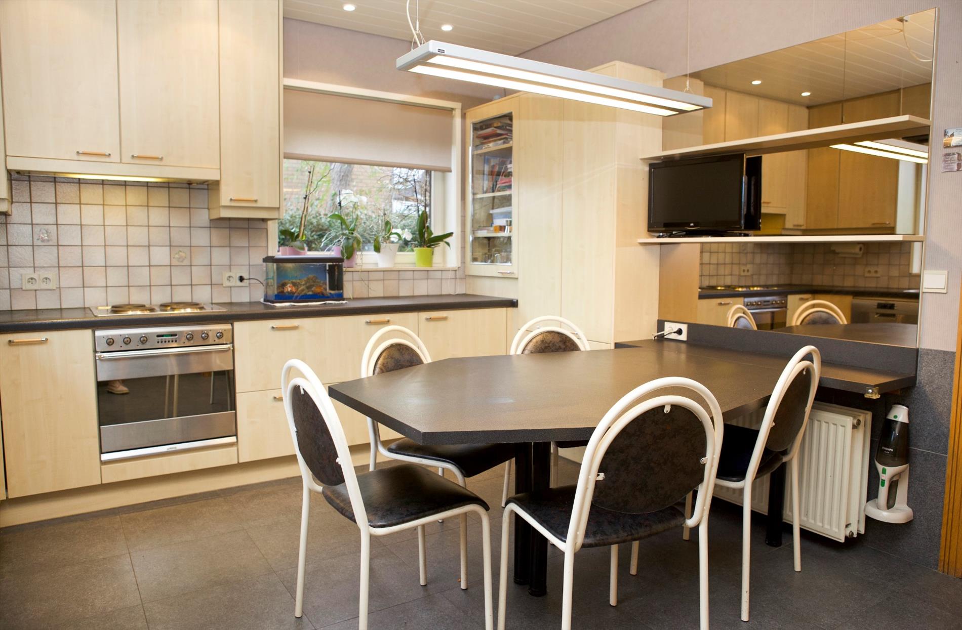 OMVATTENDE : a) gelijkvloers: portiek (2,40 x 1,50),- inkomhall (4 x 2,50),- traphall (2,85 x 1,50) + trap in beuk,- toilet met w.c. + lavabo,- luchtige living (42 m²) met eetplaats en salon (plafond + inbouwspotjes),- ingerichte bureau (2,75 x 1,80) + ingemaakte kasten,- veranda (5,20 x 4 * plafond + inbouwspotjes),- keuken (4,20 x 3,86) met L-vormige keukenblok (onder- en bovenkasten in es-meubelplaat) + aanbouwtafel, en ingebouwde elektrische kookplaat, dampkap, oven, microgolfoven, vaatwas, frigo, en dubbele inox afwasbak (laminaat-plafond + inbouwspotjes),- stookplaats met H.R.+ mazoutgenerator,- garage (22,50 m²) met fietsenstalling + 2 meranti kantelpoorten + zijdeur, hydrofoor (regenwater), afgietbak, aansluiting voor was- en droogautomaat, en water- en elektriciteitstellers ;