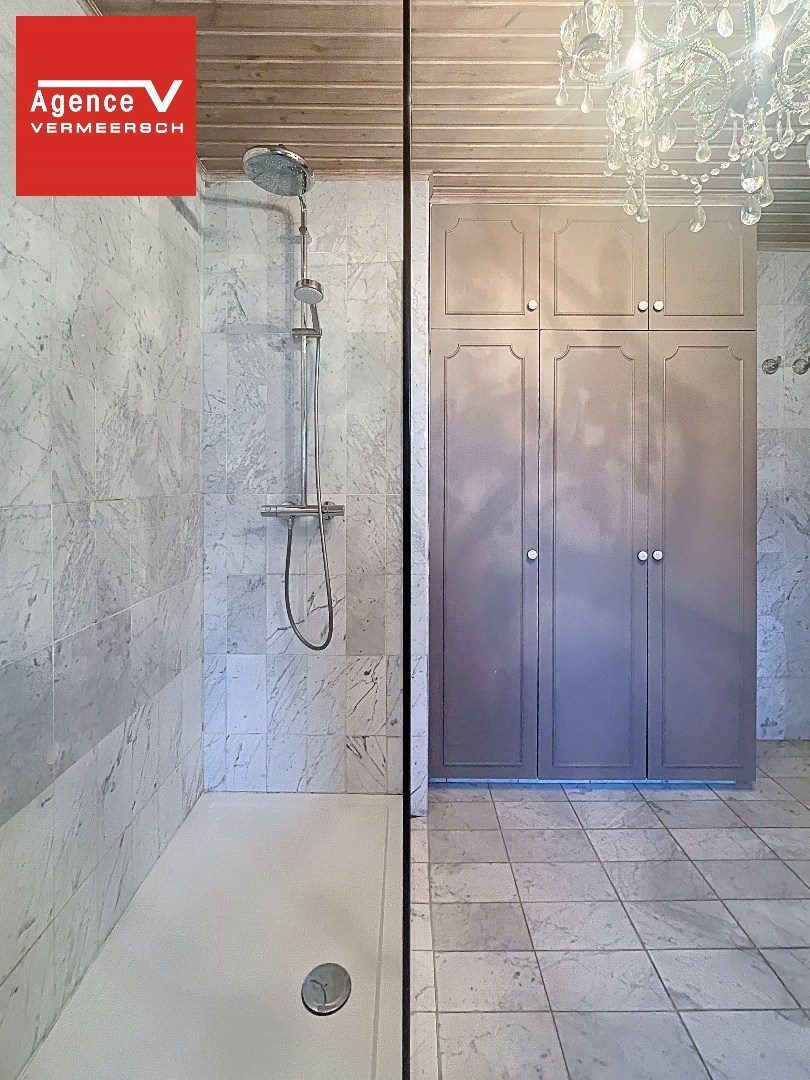 De indeling van de villa is als volgt: Ruime lichtrijke inkom dit door de mooie vide met een hoogte van meer dan 4m wat voor een instant gevoel van ruimte zorgt - ruime vestiaire - gastentoilet - op de beneden verdieping is een eerste slaapkamer (of mogelijkheid tot bureel) - luxueuze keuken met eiland (22.75m²) vanwaar u toegang hebt tot een uiterst ruime eetkamer met aansluitend zithoek (55m²) met mooie openhaard, vanuit elke hoek van deze woning hebt u een mooi zicht op de fantastische verzorgde tuin - boven bevindt zich nog een sublieme dressing (oorspronkelijk slaapkamer), badkamer met inloopdouche en 2 lavabo meubels, boven bevinden zich nog 2 ruime slaaapkamers.