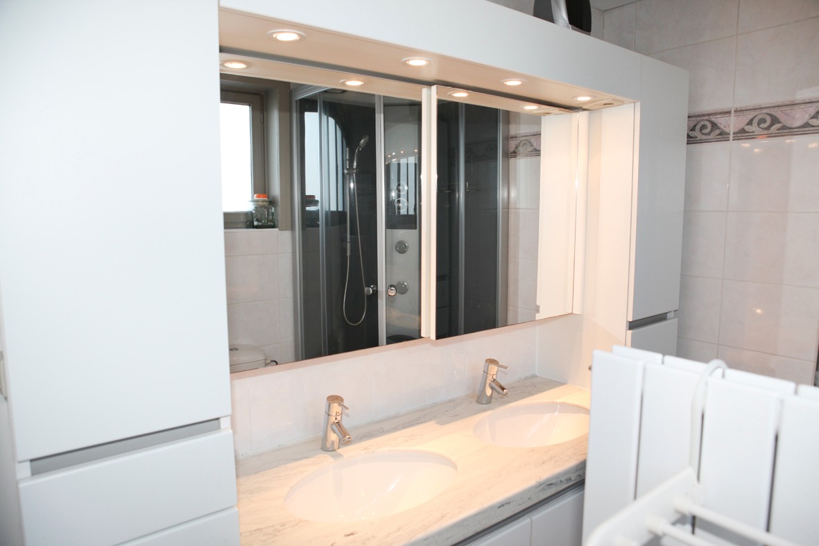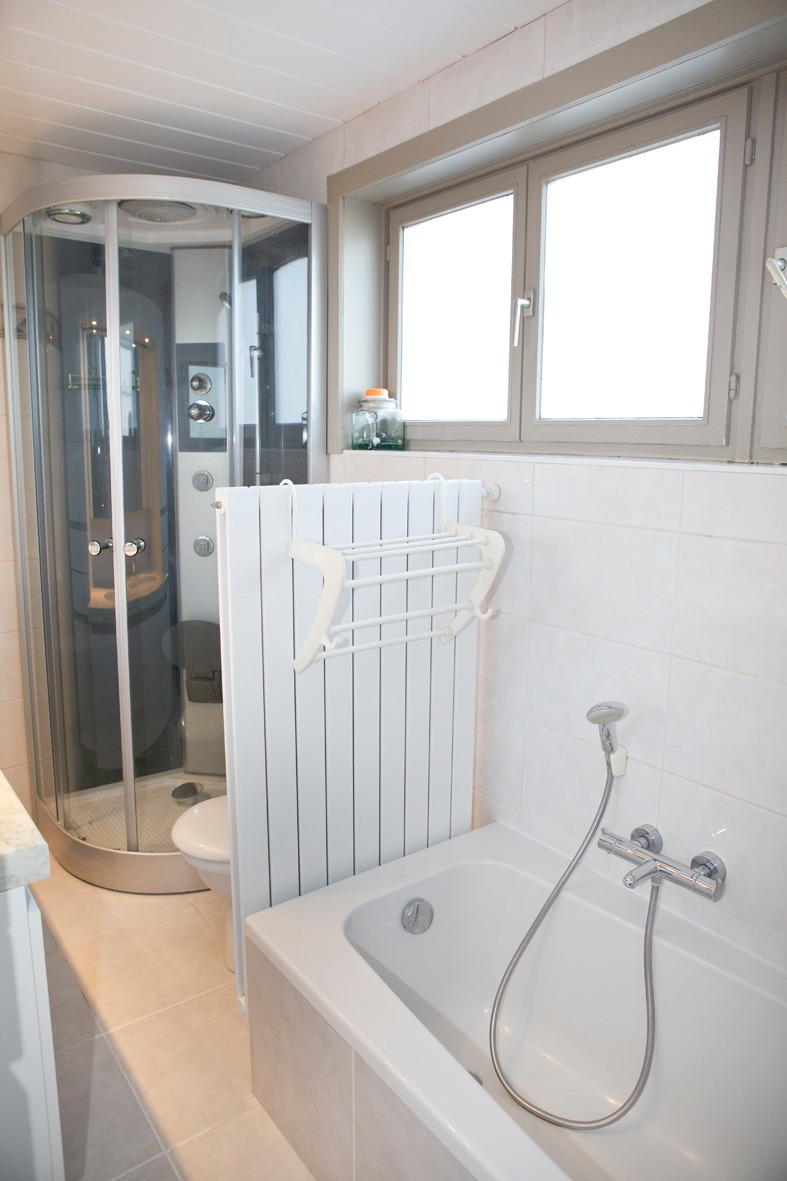 b) 1ste & zolderverdiep: overloop (+ zolderluik ),- grote voor- en achterslaapkamer (resp. 4,64 x 4,40 * 4,65 x 3,90),- vernieuwde badkamer (3,30 x 1,80) met ligbad, complete douchecabine, toiletmeubel + 2 ingebouwde lavabo’s, en wc,- berging,- nieuw ingerichte zolderkamer (34 m²),- en berging (nieuwe Vaillant HR+ wand-aardgas-generator).