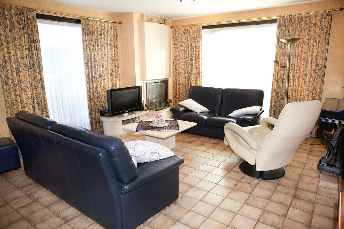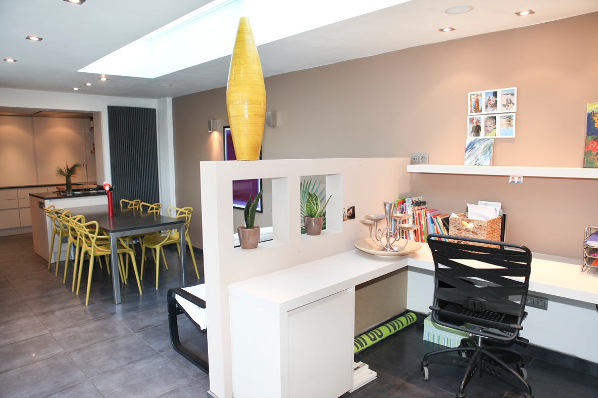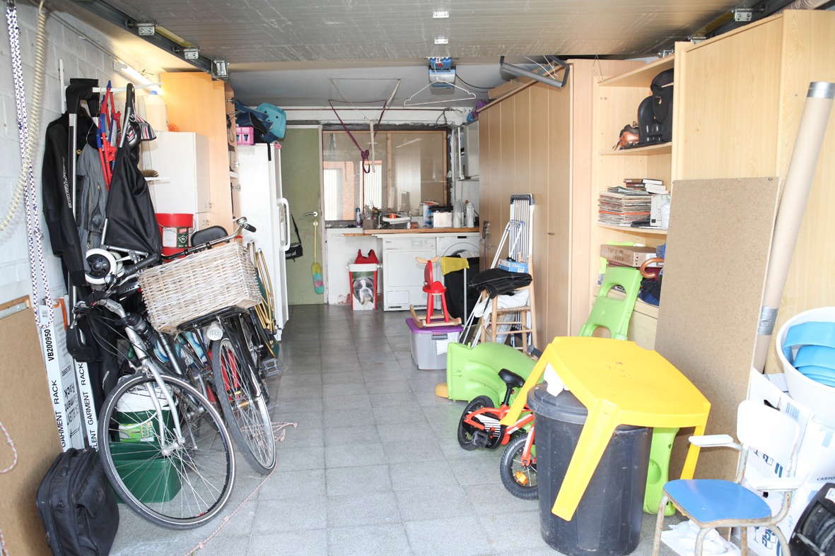 a) gelijkvloers: inkom- & traphal met vestiaire (+ ingemaakte kasten) en marmeren trap,- toilet (met wc + lavabo),- ruime & luchtige living (8,40 x 4,65) met marmeren sierschouw (+ inbouwcassette-openhaard op aardgas * beige tegelvloer),- schitterend ingerichte leefkeuken-eetplaats-bureau (9,80 x 3,31 + grote lichtkoepel) met moderne U-vormige keukenblok (voorzien van onder- en bovenkasten in witte meubelplaat) + ingebouwde kookplaat (op aardgas), grote dampkap, vaatwasautomaat en dubbele inox afwasbak ; * 2de keukenblok (met diverse kasten in meubelplaat lichte eik) met ingebouwde expresso, heteluchtoven, combi-microgolfoven, koelkast en diepvries (toestellen van AEG) en bureauruimte met L-vormige bureau-inrichting (+ ingemaakte kasten),- garage (6,55 x 2,27) met sectionale poort (geautomatiseerd), diverse wandkasten en aansluiting voor was- & droogautomaat (anti-vet tegelvloer),- groot & zonnig zonneterras-tuin (deels bankirai & betonnen klinkers, * met fonteintje + diverse bloemperken),- parking (voor meerdere wagens),- en voortuintje + voetpad (belegd met betonklinkers) ;