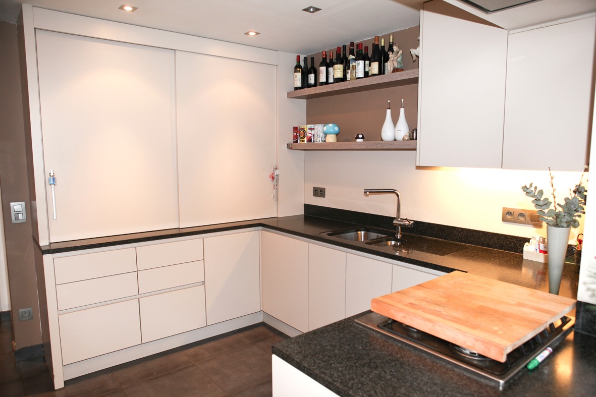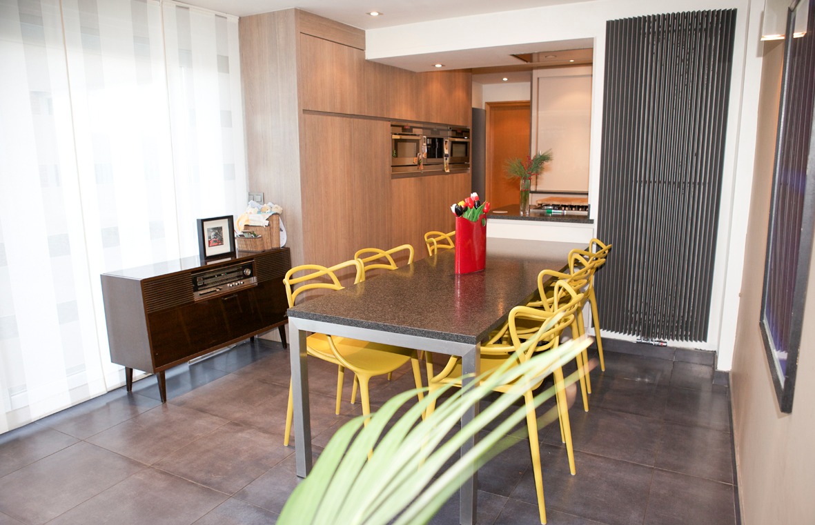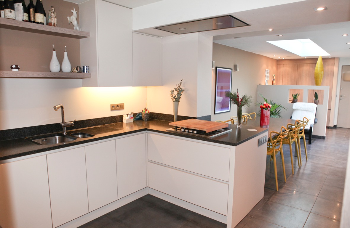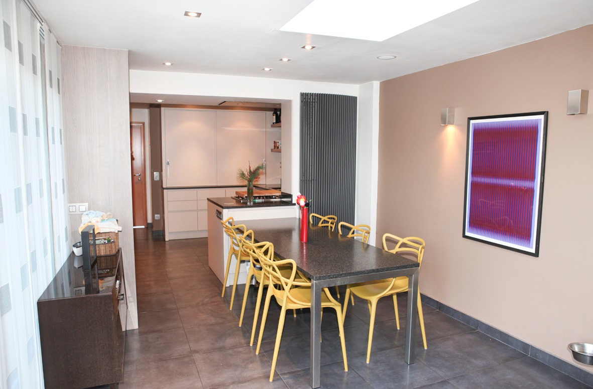 a) gelijkvloers: inkom- & traphal met vestiaire (+ ingemaakte kasten) en marmeren trap,- toilet (met wc + lavabo),- ruime & luchtige living (8,40 x 4,65) met marmeren sierschouw (+ inbouwcassette-openhaard op aardgas * beige tegelvloer),- schitterend ingerichte leefkeuken-eetplaats-bureau (9,80 x 3,31 + grote lichtkoepel) met moderne U-vormige keukenblok (voorzien van onder- en bovenkasten in witte meubelplaat) + ingebouwde kookplaat (op aardgas), grote dampkap, vaatwasautomaat en dubbele inox afwasbak ; * 2de keukenblok (met diverse kasten in meubelplaat lichte eik) met ingebouwde expresso, heteluchtoven, combi-microgolfoven, koelkast en diepvries (toestellen van AEG) en bureauruimte met L-vormige bureau-inrichting (+ ingemaakte kasten),- garage (6,55 x 2,27) met sectionale poort (geautomatiseerd), diverse wandkasten en aansluiting voor was- & droogautomaat (anti-vet tegelvloer),- groot & zonnig zonneterras-tuin (deels bankirai & betonnen klinkers, * met fonteintje + diverse bloemperken),- parking (voor meerdere wagens),- en voortuintje + voetpad (belegd met betonklinkers) ;