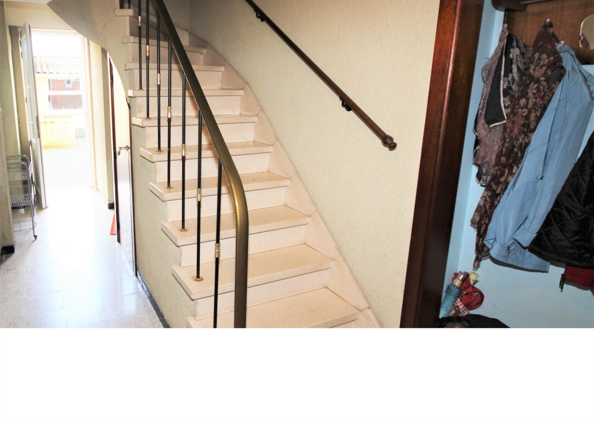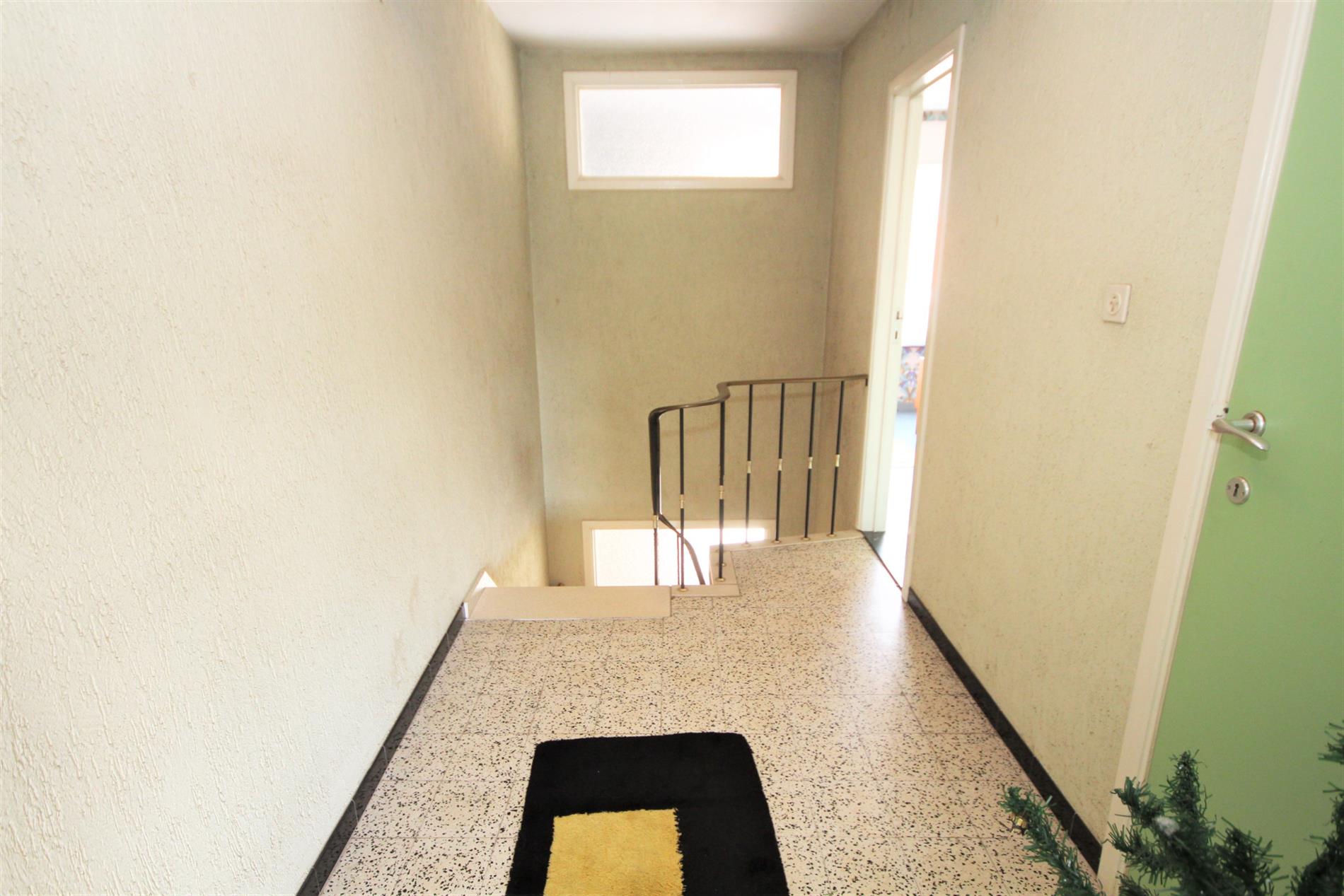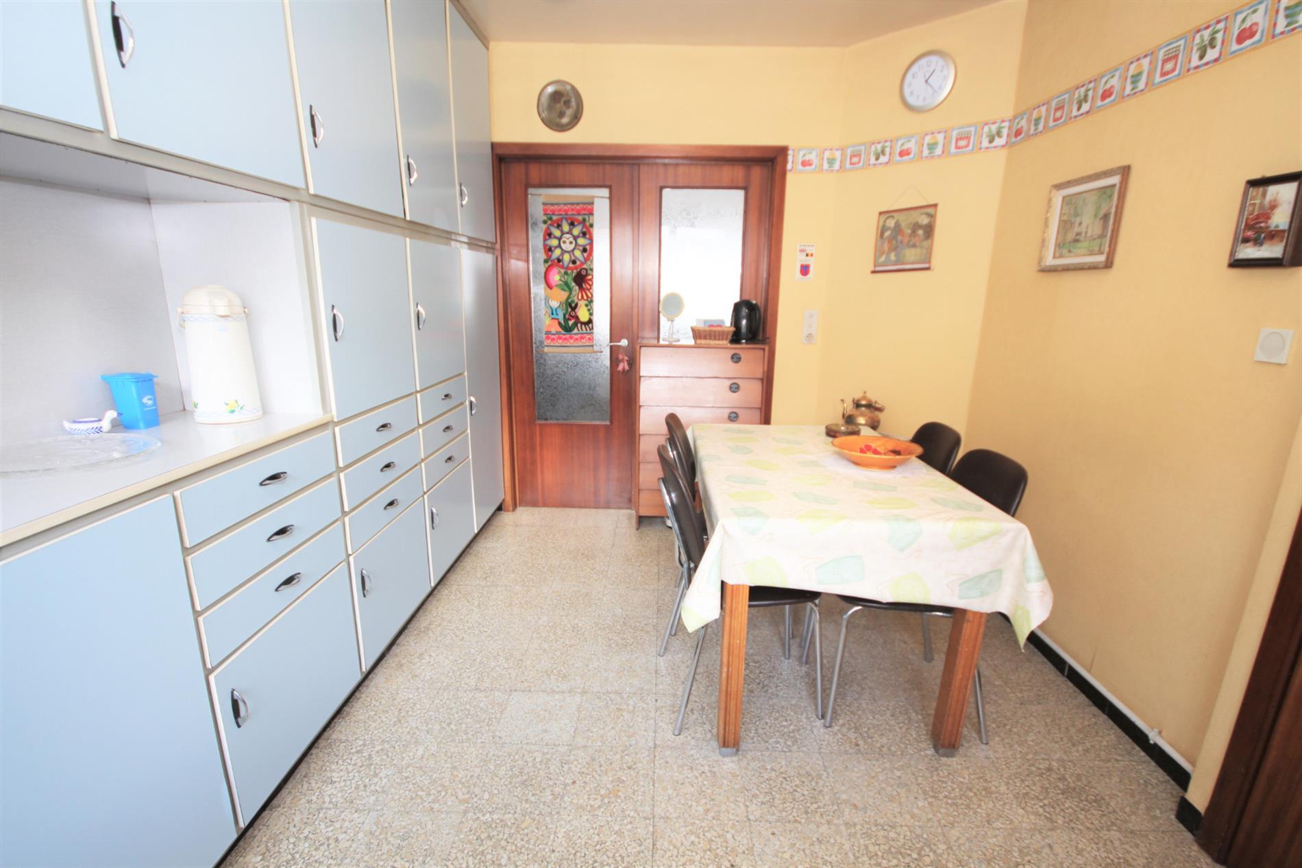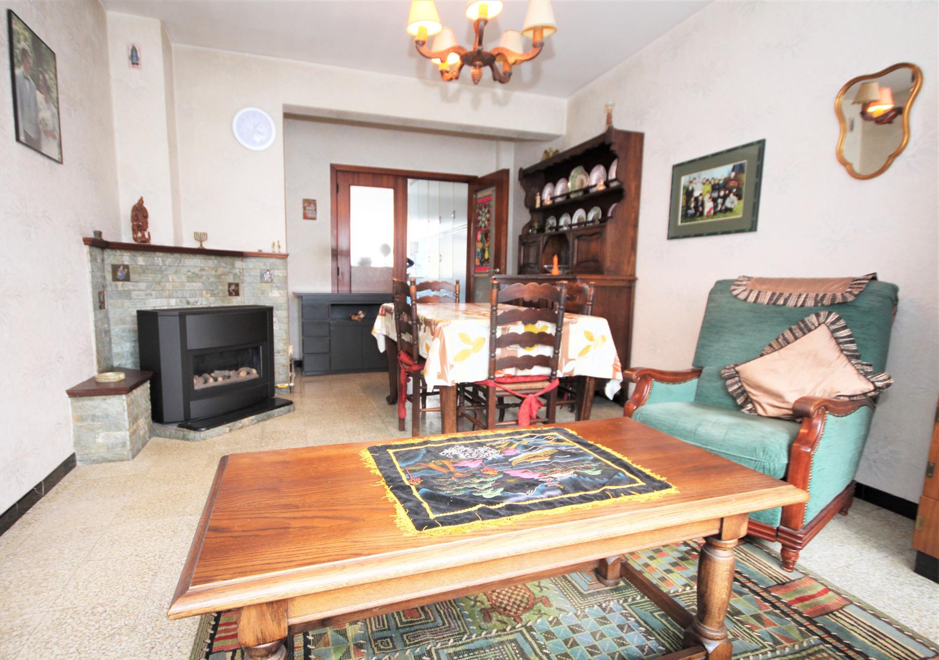 -Gelijkvloerse verdieping met : hal met trap in granito, vestiaire (teller), keldertje en nieuwe achterdeur in meranthi met dubbele beglazing,- woonkamer (6 x 3,50) met schouw, recente gaskachel + dubbele deur,- ruime leefkeuken (4,15 x 23,90) met kasten in panolux, gaskookplaat, gaskachel en regenwaterpomp,- toilet,- koer (10,08 x 5,20),- achterhuis (3,50 x 4,80) ;