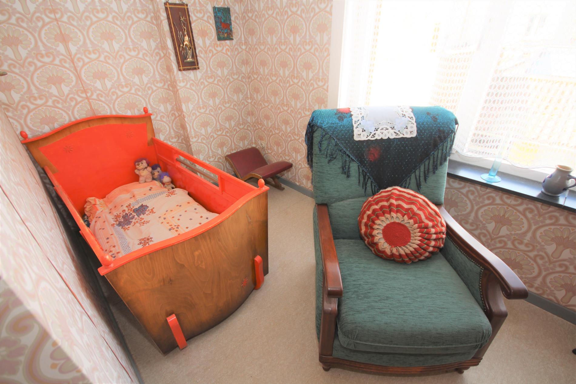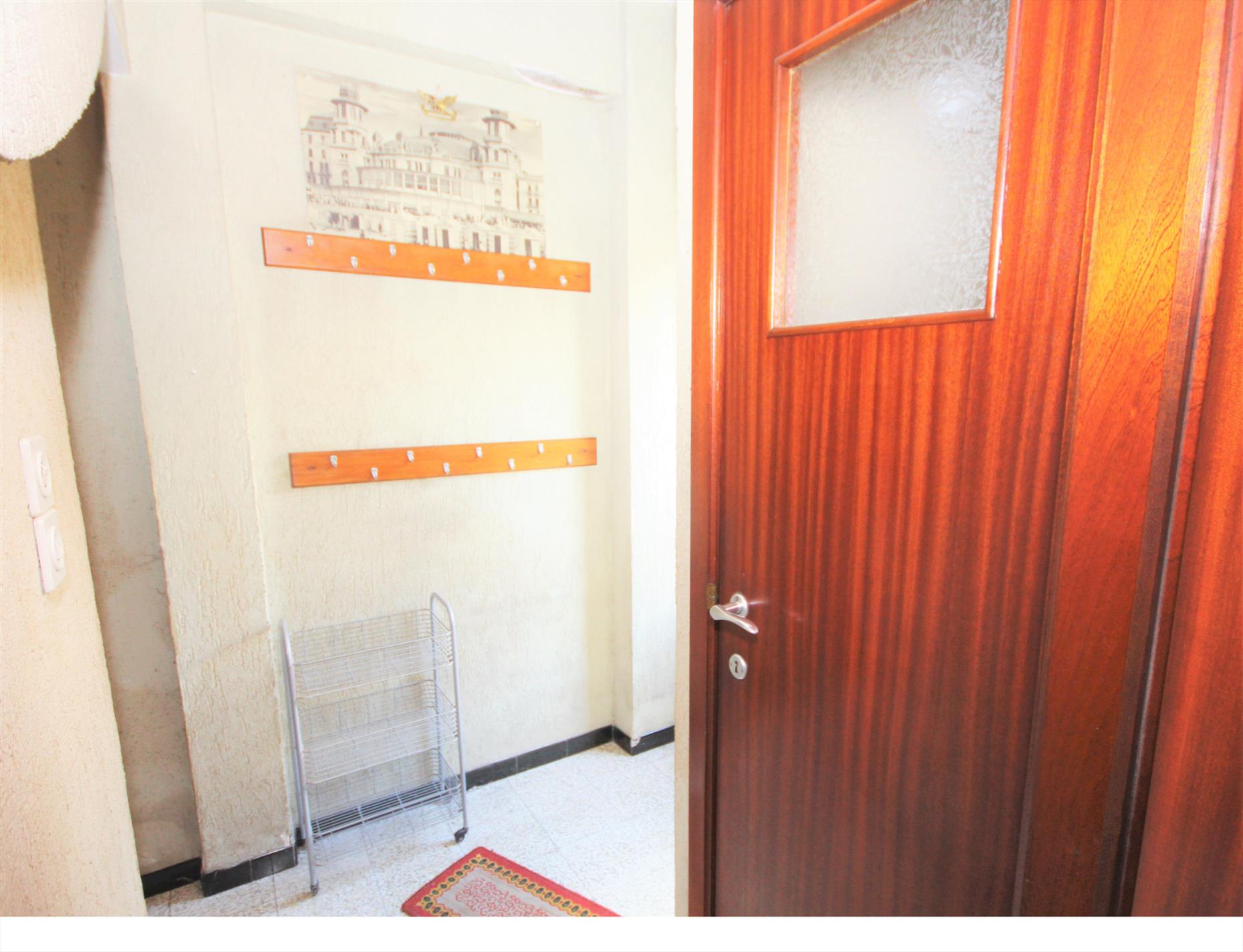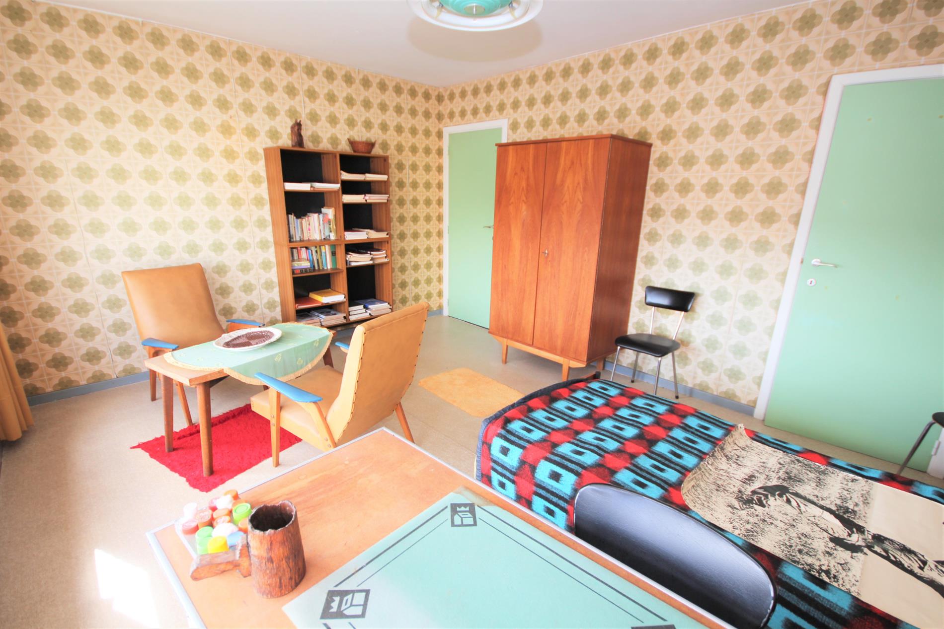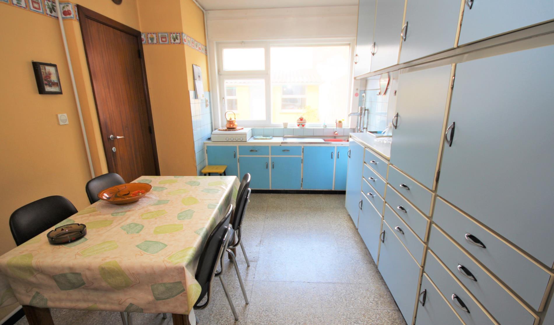 -Gelijkvloerse verdieping met : hal met trap in granito, vestiaire (teller), keldertje en nieuwe achterdeur in meranthi met dubbele beglazing,- woonkamer (6 x 3,50) met schouw, recente gaskachel + dubbele deur,- ruime leefkeuken (4,15 x 23,90) met kasten in panolux, gaskookplaat, gaskachel en regenwaterpomp,- toilet,- koer (10,08 x 5,20),- achterhuis (3,50 x 4,80) ;