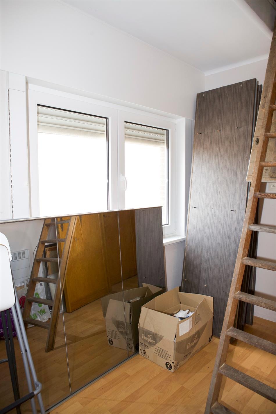 b) 1ste & zolderverdieping: overloop,- bureau (2 x 1,75),- voor-slaapkamer (4,09 x 3,38) met plafond + inbouwspotjes,- achter-slaapkamer (4,10 x 3,51),- 2de achterkamer (3 x 2) met zolderluik + houten schuiftrap,- en grote zolderruimte met voldoende plaats om 2 slaapkamers te maken).