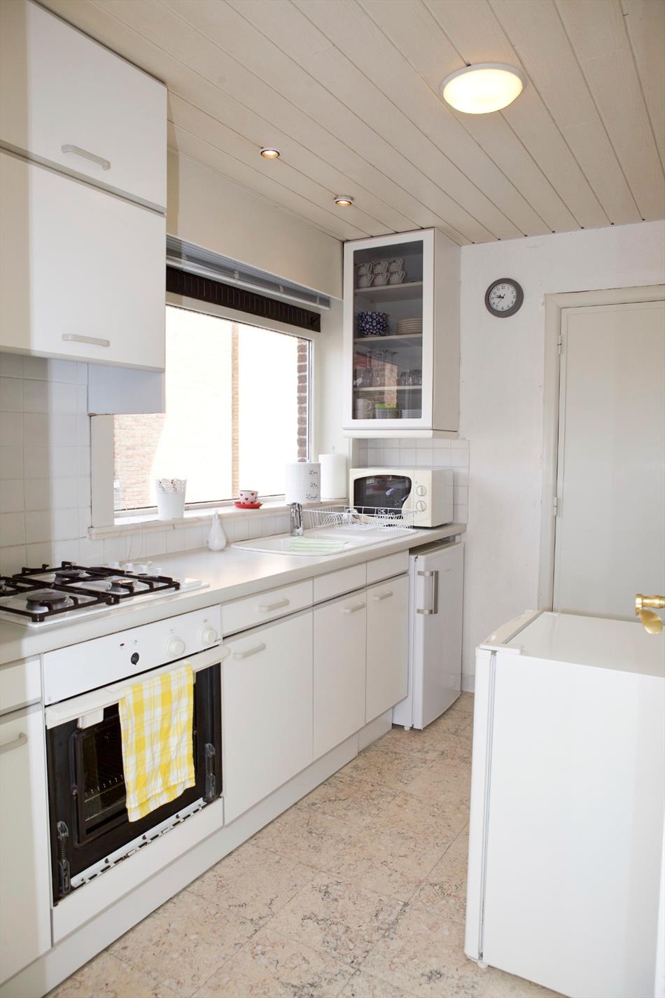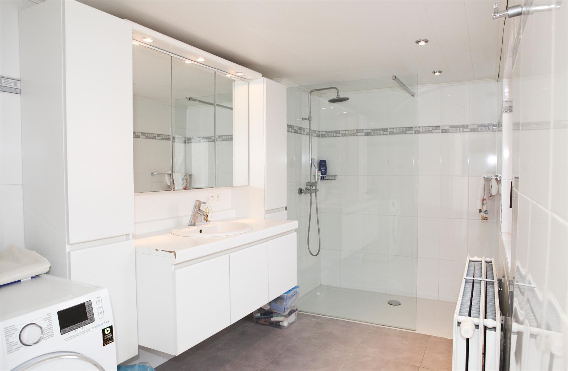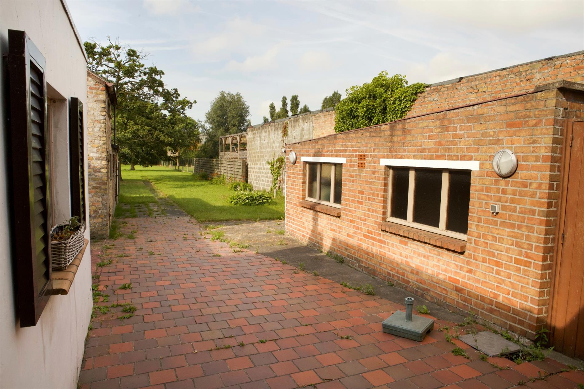 a) gelijkvloers: portiek,- inkom- & traphall (nieuwe voordeur + glaswerk * beuken trap),- voorraadkelder met tellers van water & elektriciteit * nieuwe zekeringskast,- living ( 8,37 x 3,52) ,- keuken (3 x 2) met keukenblok (onder- & bovenkasten in witte meubelplaat) + ingebouwde spoelbak, gas-kookplaat + oven, frigo, en dampkap (laminaatplafond + inbouwspotjes * witte faience),- nieuwe veranda (3,97 x 2,88),- toilet met hang-w.c. en lavabo (witte faience),- berging +warmtepomp,- nieuwe badkamer (3,60 x 1,97) met inloopdouche (+ glazen wand), toiletmeubel + inbouw-lavabo, aansluiting voor was- & droogautomaat (witte faience * laminaatplafond + inbouwspotjes),- zonnige koer-terras,- losstaande garage (6,10 x 3),- lange oprit (20 x 3),- stalling-duivenkot (7,10 x 2,40),- en grote zuid gerichte tuin (93 m. diep) met diverse fruitbomen (loopt tot a/d Noordedevaart);