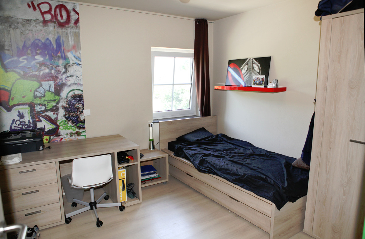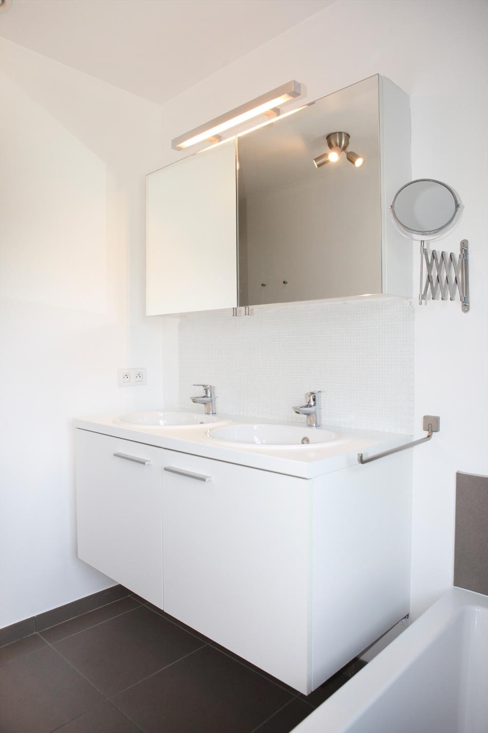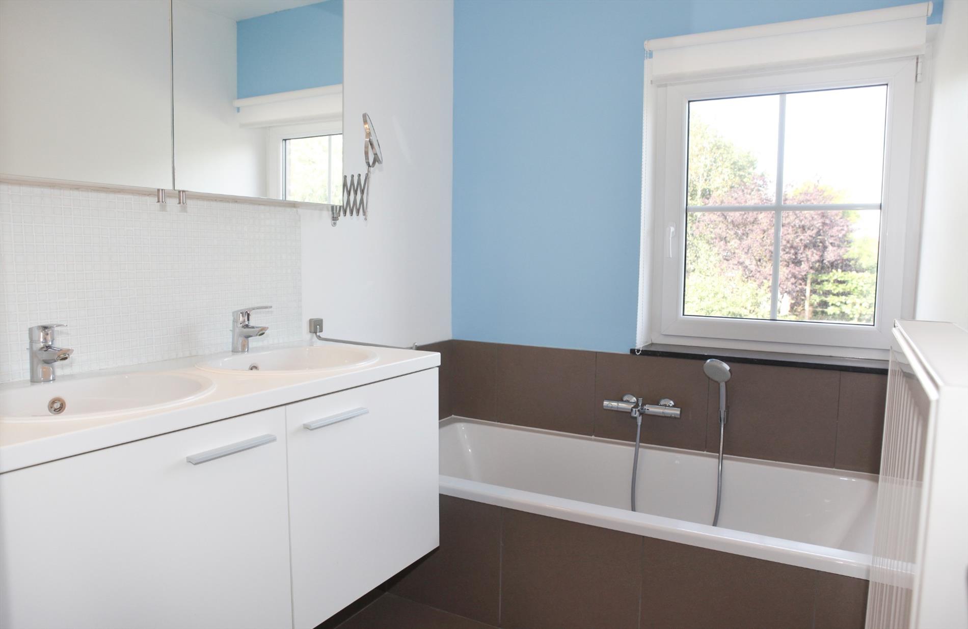 b) eerste verdieping: overloop,- badkamer (3,30 x 1,90) met toiletmeubel met dubbele lavabo, douche en ligbad,- apart toilet,- achter-slaapkamer (4,30 x 2,45)- voor-slaapkamer (3,90 x 3,10) met aansluitende bureau (1,4 x 2,10),- 2de achter-slaapkamer (3,30 x 3,15) (TV- en internetaansluiting in iedere slaapkamer);