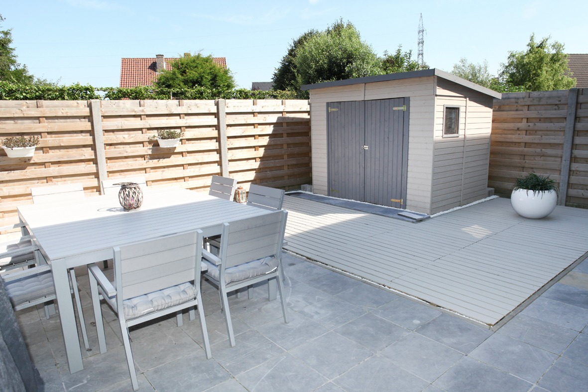 a) gelijkvloers: Inkomhal,- toilet met hang-wc en lavabo,- ruime living (30 m²),- open keuken (4,10 x 2,50) met vaste eettafel, vaatwasmachine, gaskookplaat, oven, microgolfoven, koelkast, hangdampkap en inox afwasbak,- wasplaats/berging met aansluiting voor wasmachine en droogkast, afwasbak, hydrofoor (regenwater), aardgas-wandgenerator (Junkers) en tellers van nutsvoorzieningen,- voortuin met carport,- zonnige achtertuin met terras en tuinhuis;