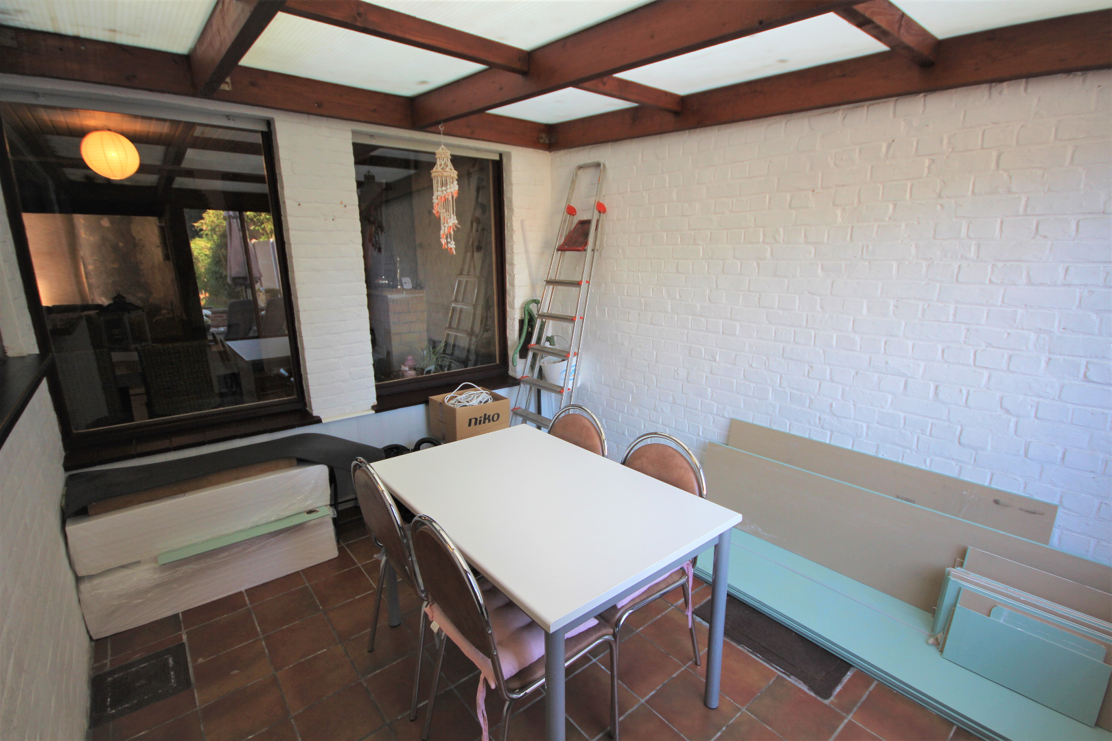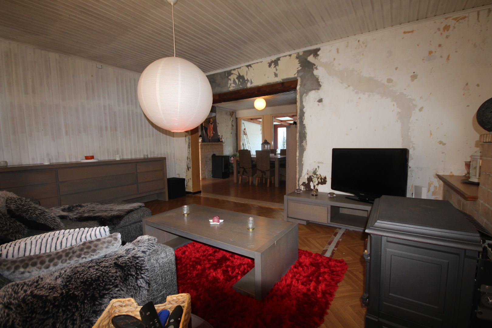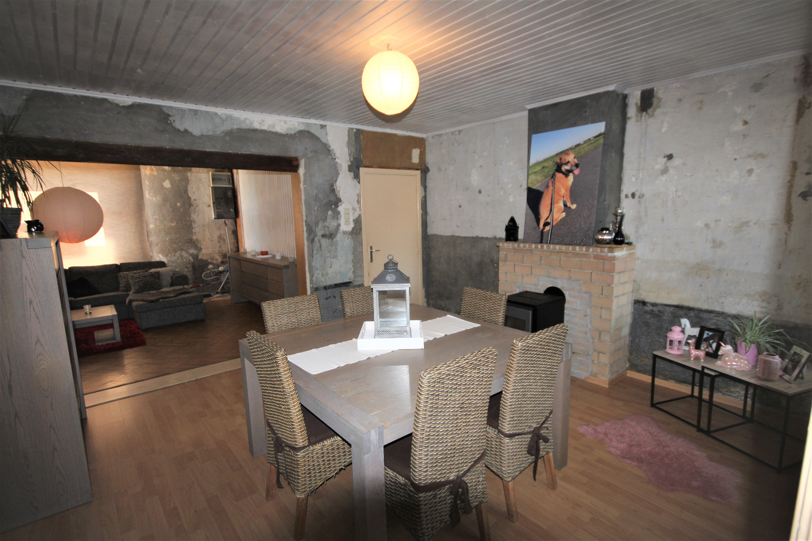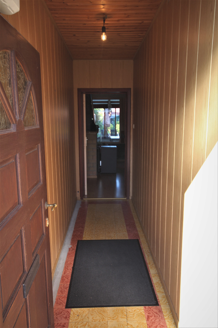 a) gelijkvloers: gang + meranti-voordeur (oude ceramieke vloer),- woonkamer (40 m²) met salon (5,40 x 4) + gemetste sierschouw & gaskachel (houten rolluik * nieuwe elektriciteitsteller & zekeringskast & waterteller),- en aansluitende eetplaats (4,39 x 4,23) + gemetste sierschouw & pelletkachel,- nieuw-ingerichte keuken (3,78 x 3,30) met L-vormige keukenblok (onder- en bovenkasten in blauwe meubelplaat) + elektrische kookplaat, dampkap, vaatwasautomaat, frigo,- en inox afwasbak (marmeren faience * nieuwe zekeringskast * grijze tegelvloer),- aansluitende badkamer met nieuwe douchecel (+ regendouchekop), en toiletmeubel + ingebouwde lavabo,- berging met hang-w.c., elektrische boiler, en aansluiting wasautomaat,- veranda (3,60 x 2,93) + regenwaterpomp,- voorraadkelder,- en vouttekamer + houten trap (nu dressing) ;