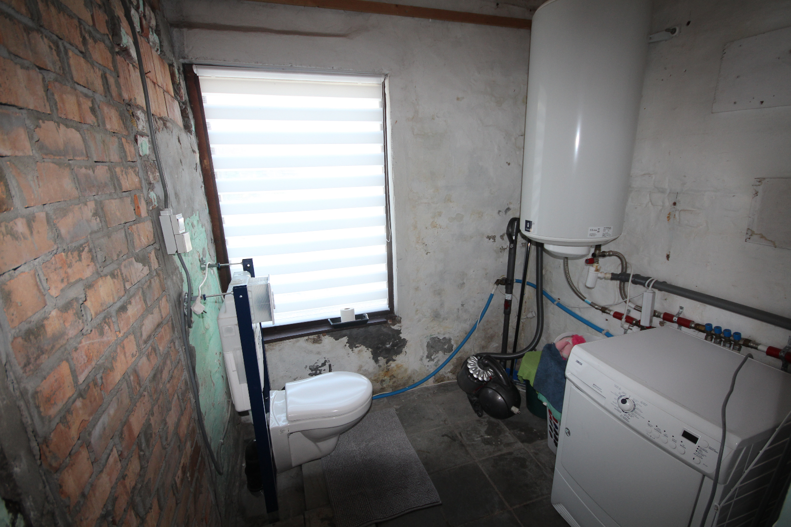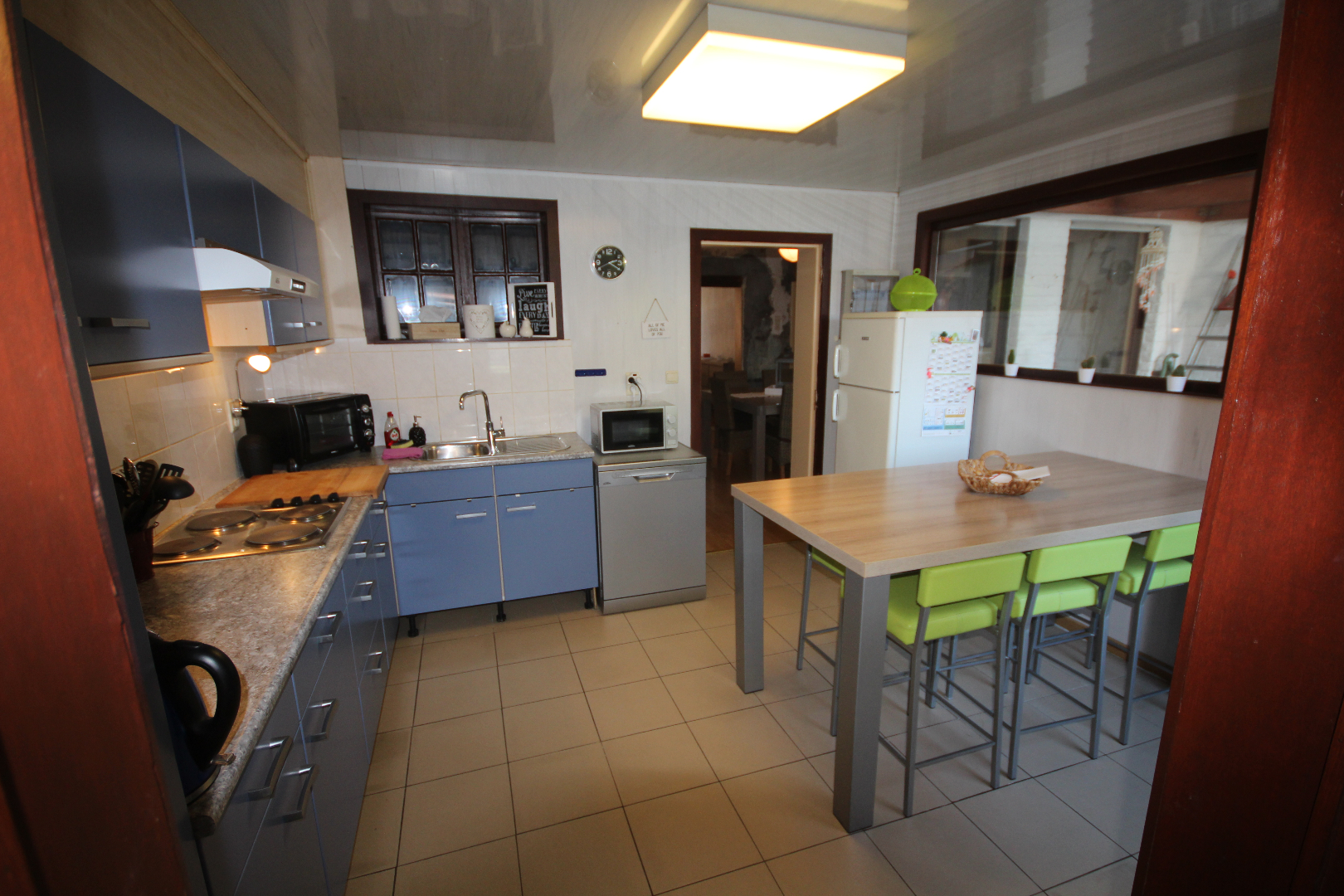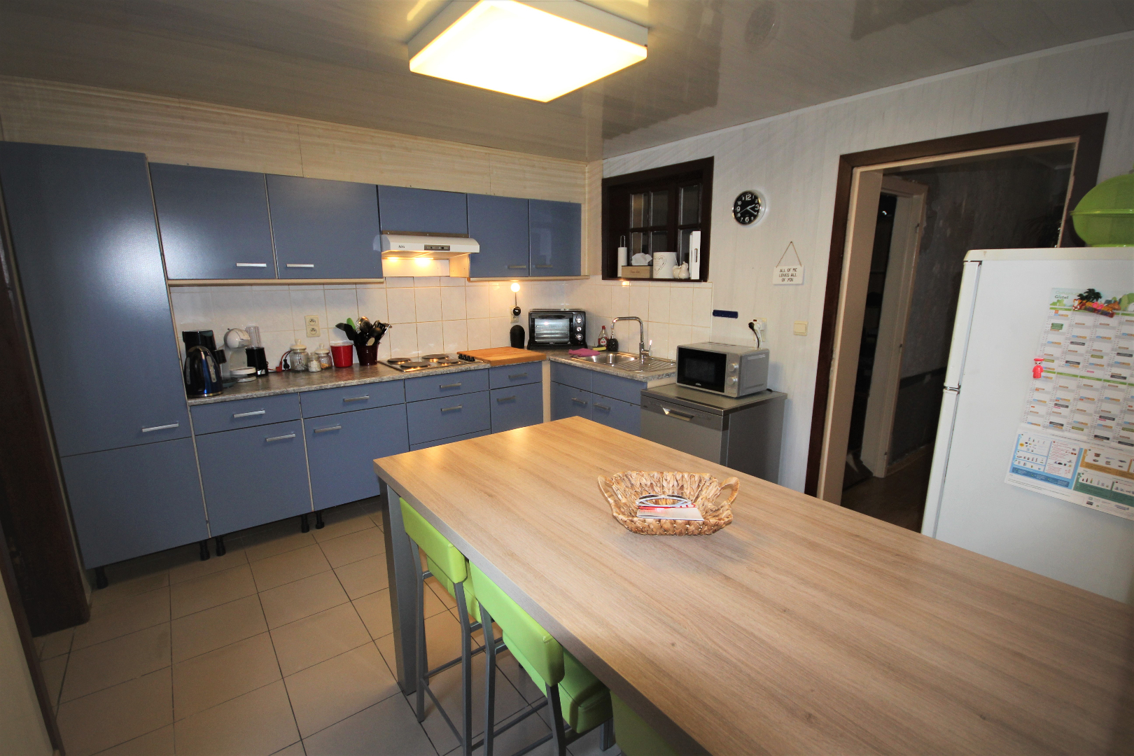 a) gelijkvloers: gang + meranti-voordeur (oude ceramieke vloer),- woonkamer (40 m²) met salon (5,40 x 4) + gemetste sierschouw & gaskachel (houten rolluik * nieuwe elektriciteitsteller & zekeringskast & waterteller),- en aansluitende eetplaats (4,39 x 4,23) + gemetste sierschouw & pelletkachel,- nieuw-ingerichte keuken (3,78 x 3,30) met L-vormige keukenblok (onder- en bovenkasten in blauwe meubelplaat) + elektrische kookplaat, dampkap, vaatwasautomaat, frigo,- en inox afwasbak (marmeren faience * nieuwe zekeringskast * grijze tegelvloer),- aansluitende badkamer met nieuwe douchecel (+ regendouchekop), en toiletmeubel + ingebouwde lavabo,- berging met hang-w.c., elektrische boiler, en aansluiting wasautomaat,- veranda (3,60 x 2,93) + regenwaterpomp,- voorraadkelder,- en vouttekamer + houten trap (nu dressing) ;