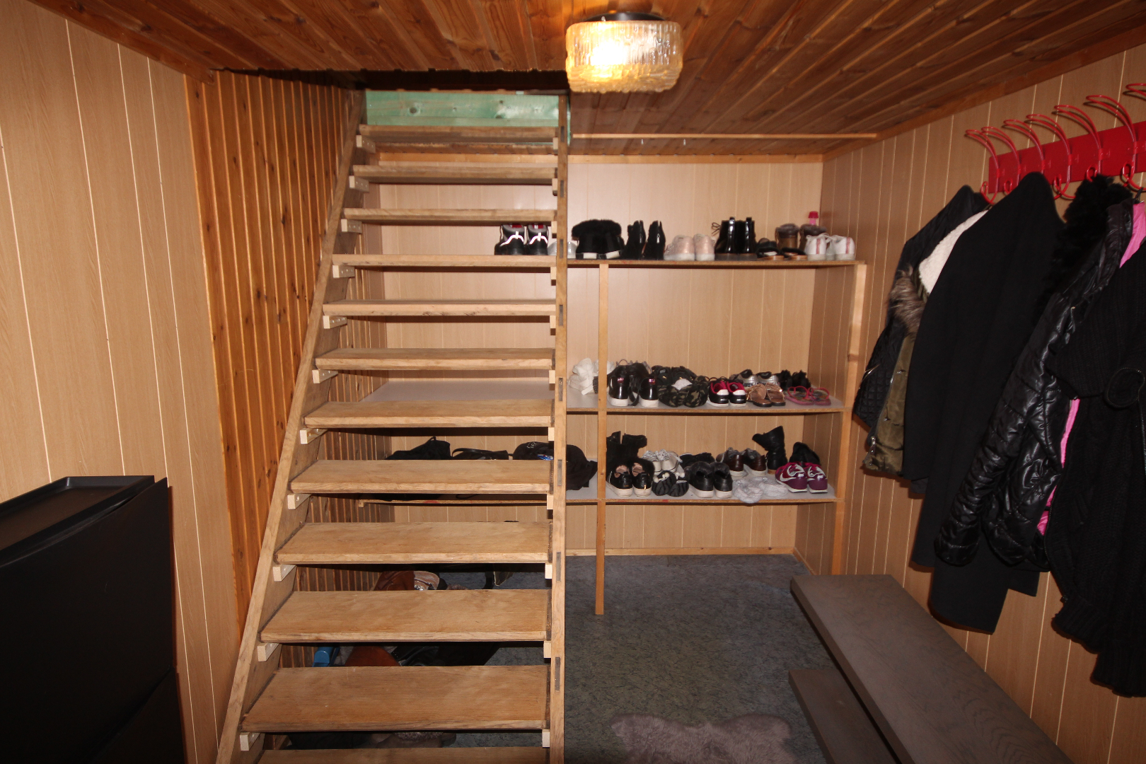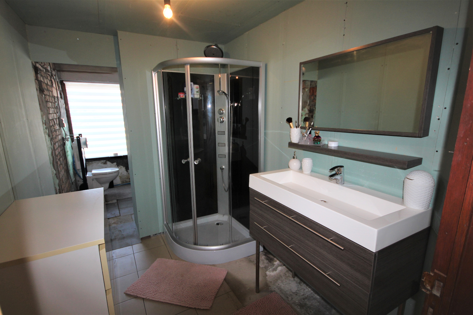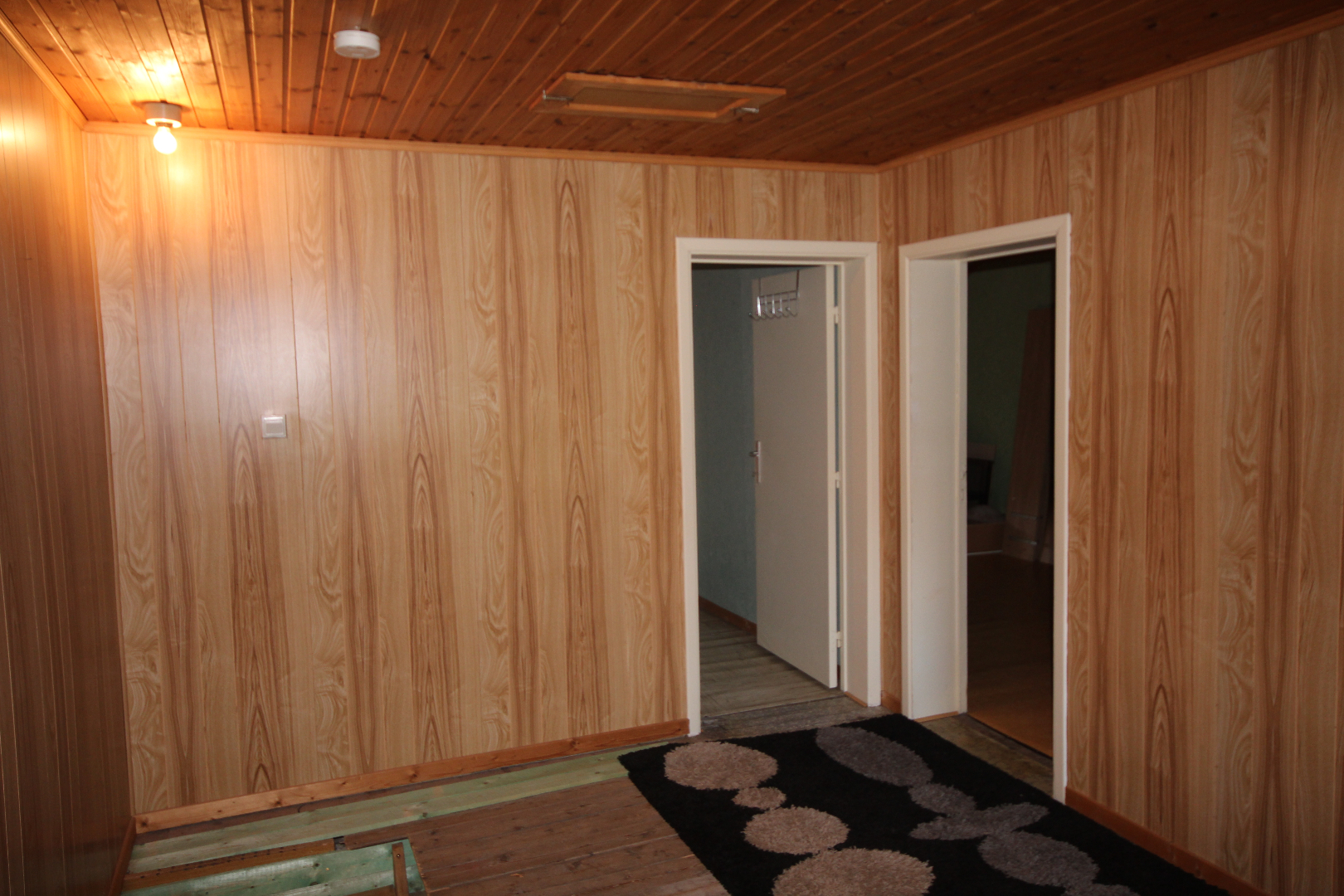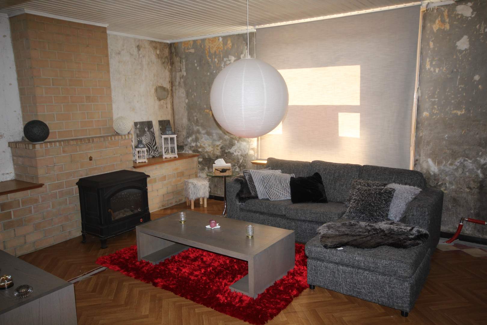 a) gelijkvloers: gang + meranti-voordeur (oude ceramieke vloer),- woonkamer (40 m²) met salon (5,40 x 4) + gemetste sierschouw & gaskachel (houten rolluik * nieuwe elektriciteitsteller & zekeringskast & waterteller),- en aansluitende eetplaats (4,39 x 4,23) + gemetste sierschouw & pelletkachel,- nieuw-ingerichte keuken (3,78 x 3,30) met L-vormige keukenblok (onder- en bovenkasten in blauwe meubelplaat) + elektrische kookplaat, dampkap, vaatwasautomaat, frigo,- en inox afwasbak (marmeren faience * nieuwe zekeringskast * grijze tegelvloer),- aansluitende badkamer met nieuwe douchecel (+ regendouchekop), en toiletmeubel + ingebouwde lavabo,- berging met hang-w.c., elektrische boiler, en aansluiting wasautomaat,- veranda (3,60 x 2,93) + regenwaterpomp,- voorraadkelder,- en vouttekamer + houten trap (nu dressing) ;