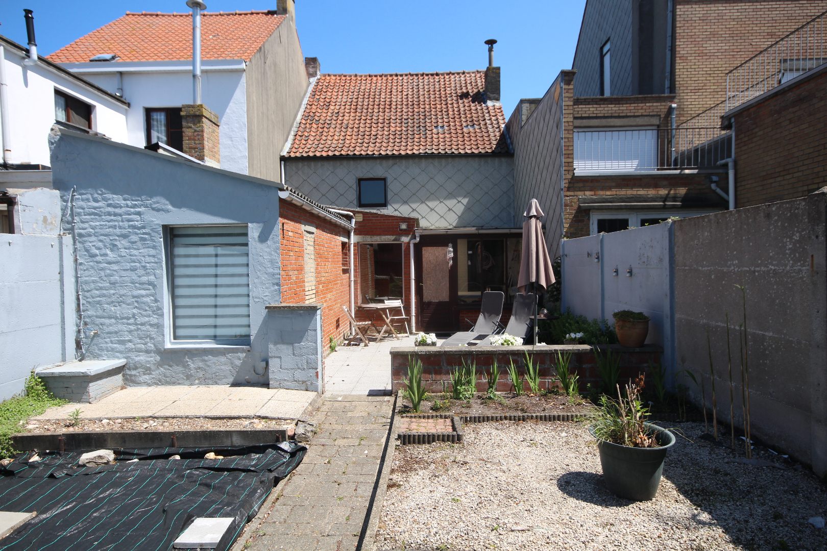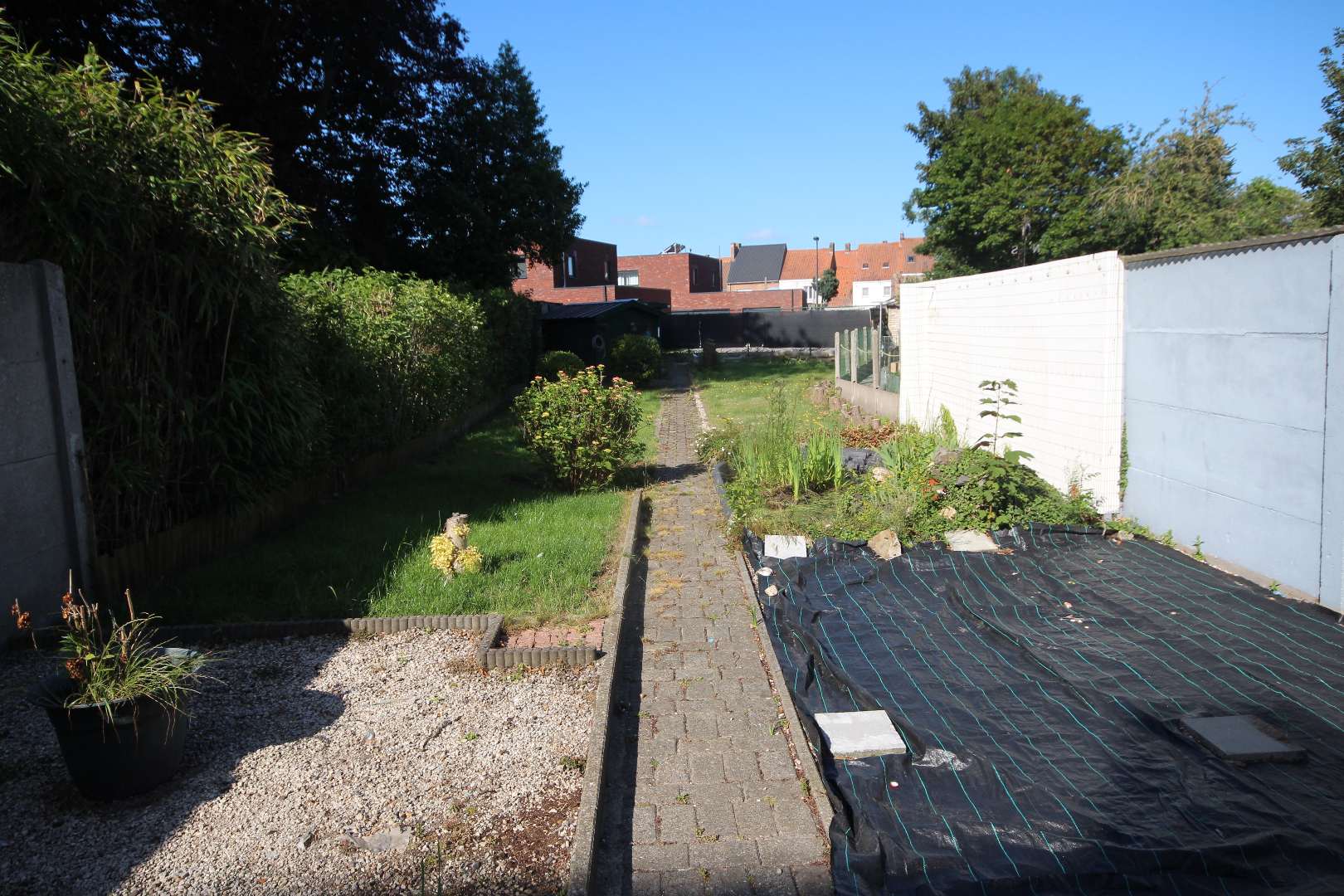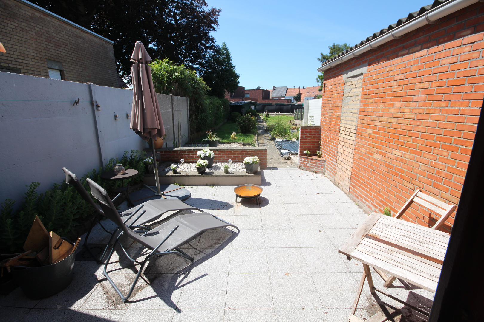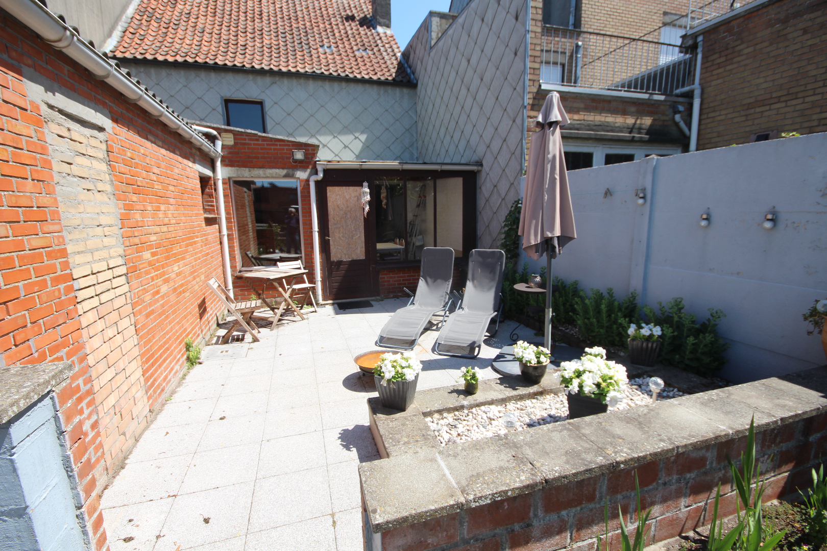 c) aanhorigheden: Zuid-west gerichte koer-terras (5,17 x 4,40),- zonnige tuin met visvijvertje, houten tuinhuis en stallingen ;