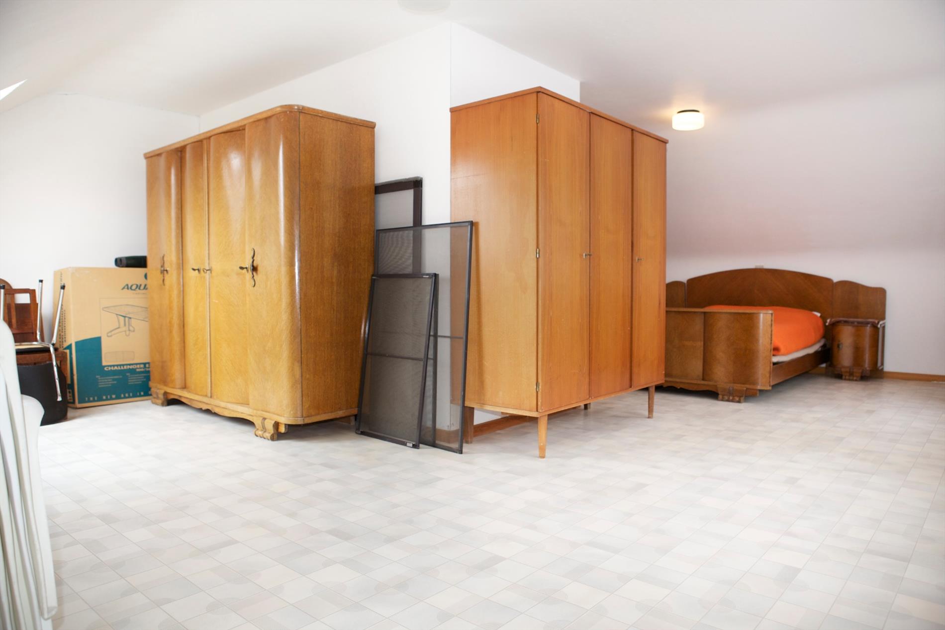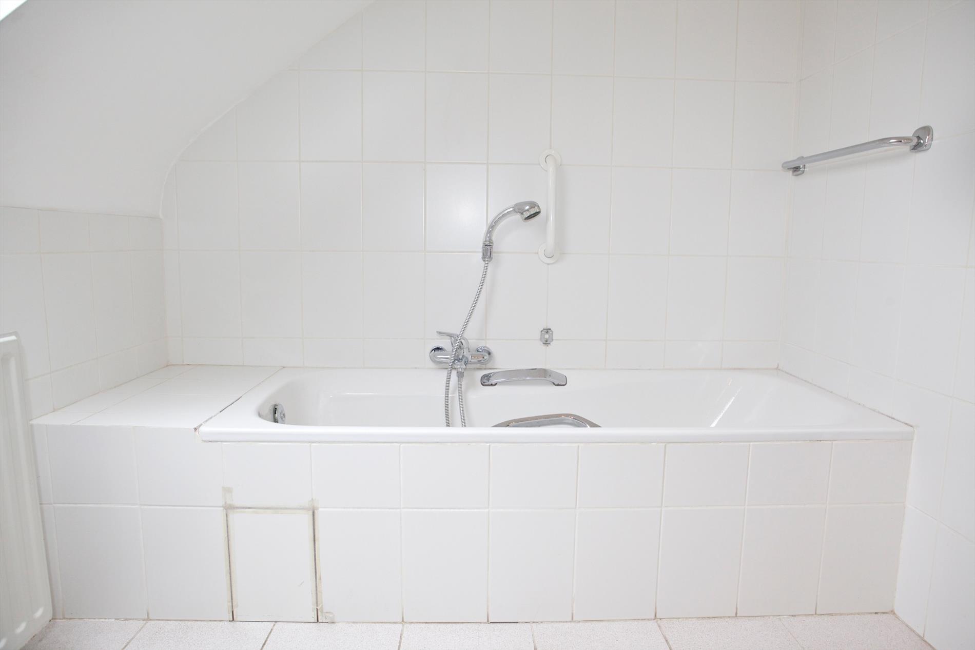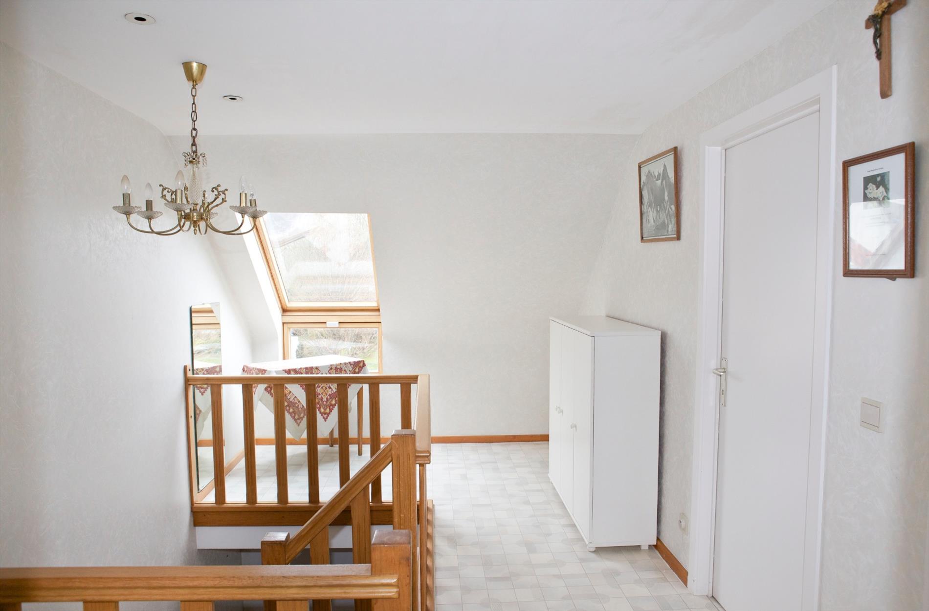 b) 1ste verdiep: overloop met groot velux- en vastraam (plafond + inbouwspotjes * ideaal plaatsje voor bureau),- voor-slaapkamer (5,30 x 3,40) + lavabo,- achter-slaapkamer (5,30 x 3,50) + lavabo,- badkamer (2,70 x 2,30) met ligbad, en toiletmeubel + ingebouwde lavabo (wit-grijze faience),- w.c. (wit-grijze faience),- stookplaats met elektrische boiler en aardgasgenerator,- dubbele slaapkamer (36 m²) met voorkamer (5,60 x 2,80) en achterkamer (20 m²) en zolder.
