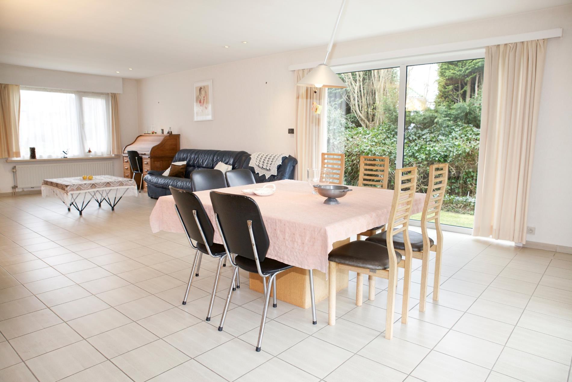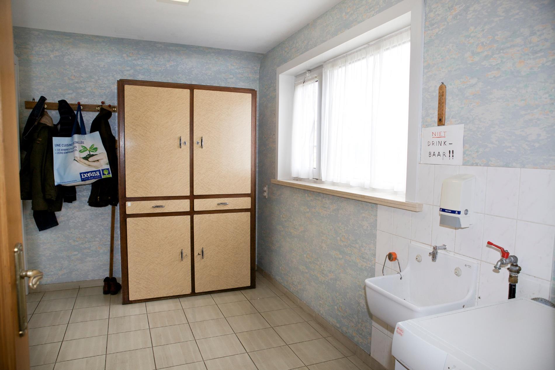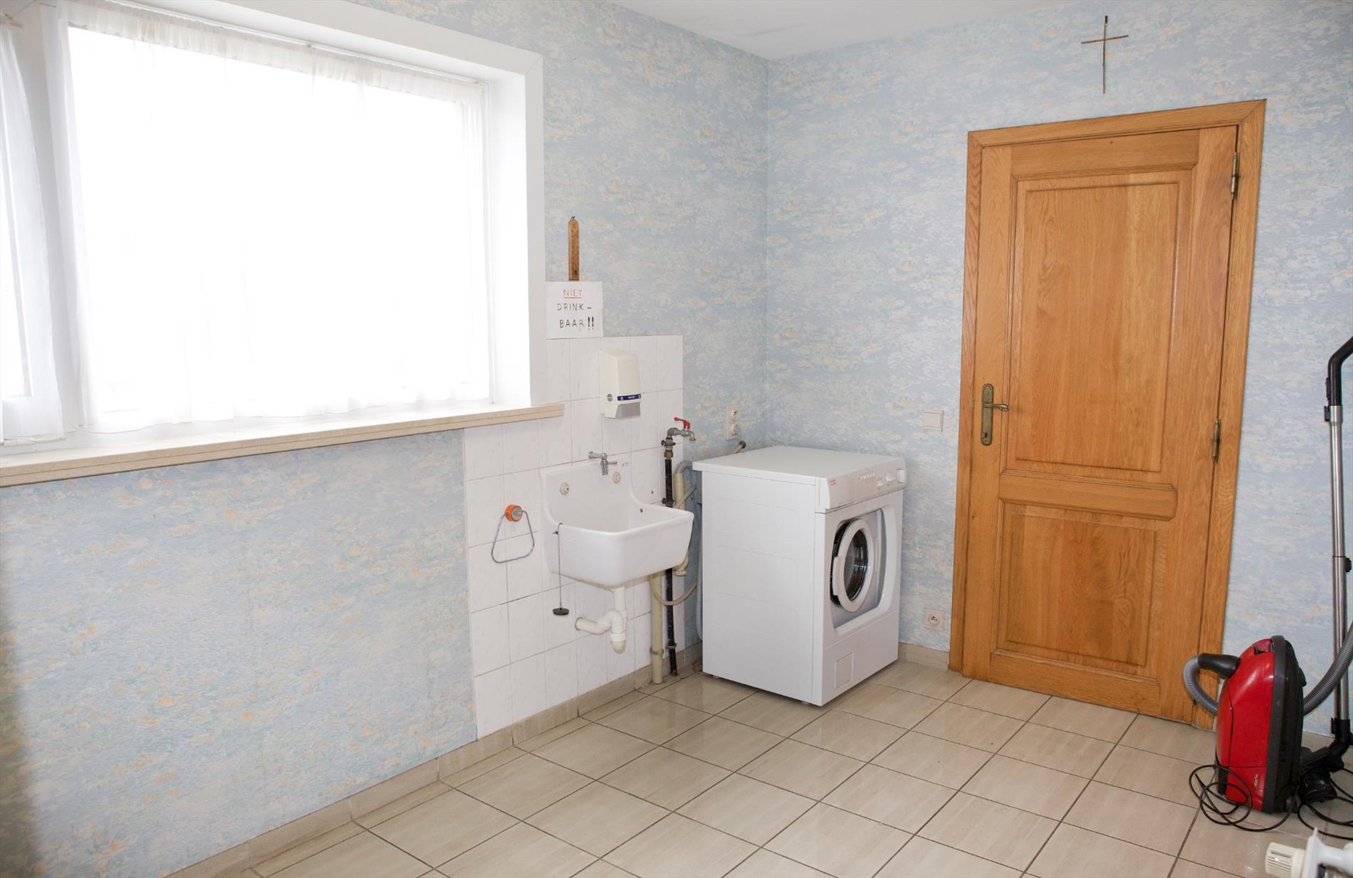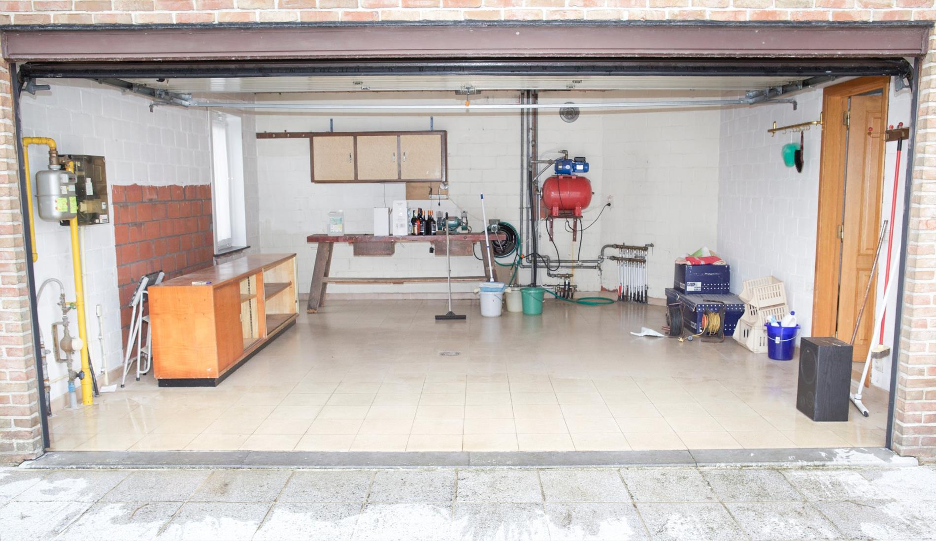 a) gelijkvloers: ruime inkom- en traphal met vestiarie en sierlijke eiken trap (+ stoellift),- w.c. + lavabo,- badkamer (1,65 x 1,40) met zitbad/douche (glazen douche-wanden * witte faience) en lavabo,- living (43 m²) met parlofoon, en terras-schuifraam,- groot zonneterras (11,10 x 2,60 * deels overdekt),- keuken (5,90 x 3,65) met terrasdeur en met 1ste keukenblok met met onder- en bovenkasten (in witte meubelplaat) + ingebouwde kookplaat, dampkap en vaatwasmachine ; en * 2de keukenblok met onder- en bovenkasten (in witte meubelplaat), + ingebouwde koelkast en oven,- wasplaats (3,90 x 2,40) met terrasdeur,- garage (5,55 x 5,30) met breedte (4,64 m.) en nieuwe elektrisch bediende sectionale poort, storkpomp (regenwater)- grote & brede oprit (5 x 4,50) met plaats voor 2 auto’s,- voor- zij- en achtertuin ;
