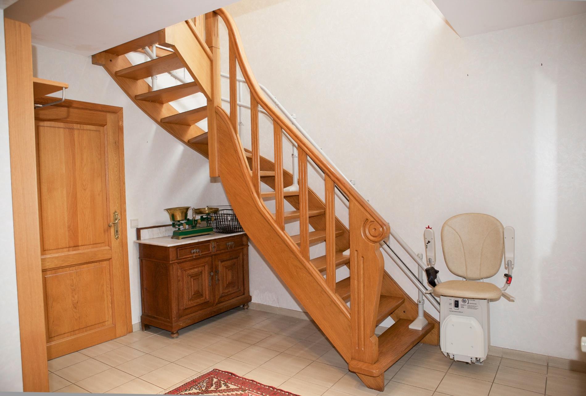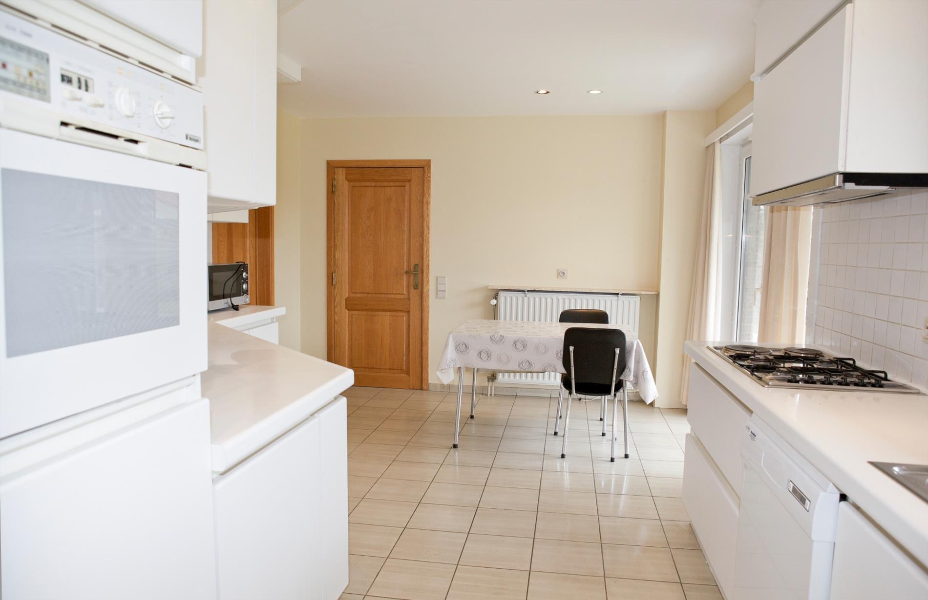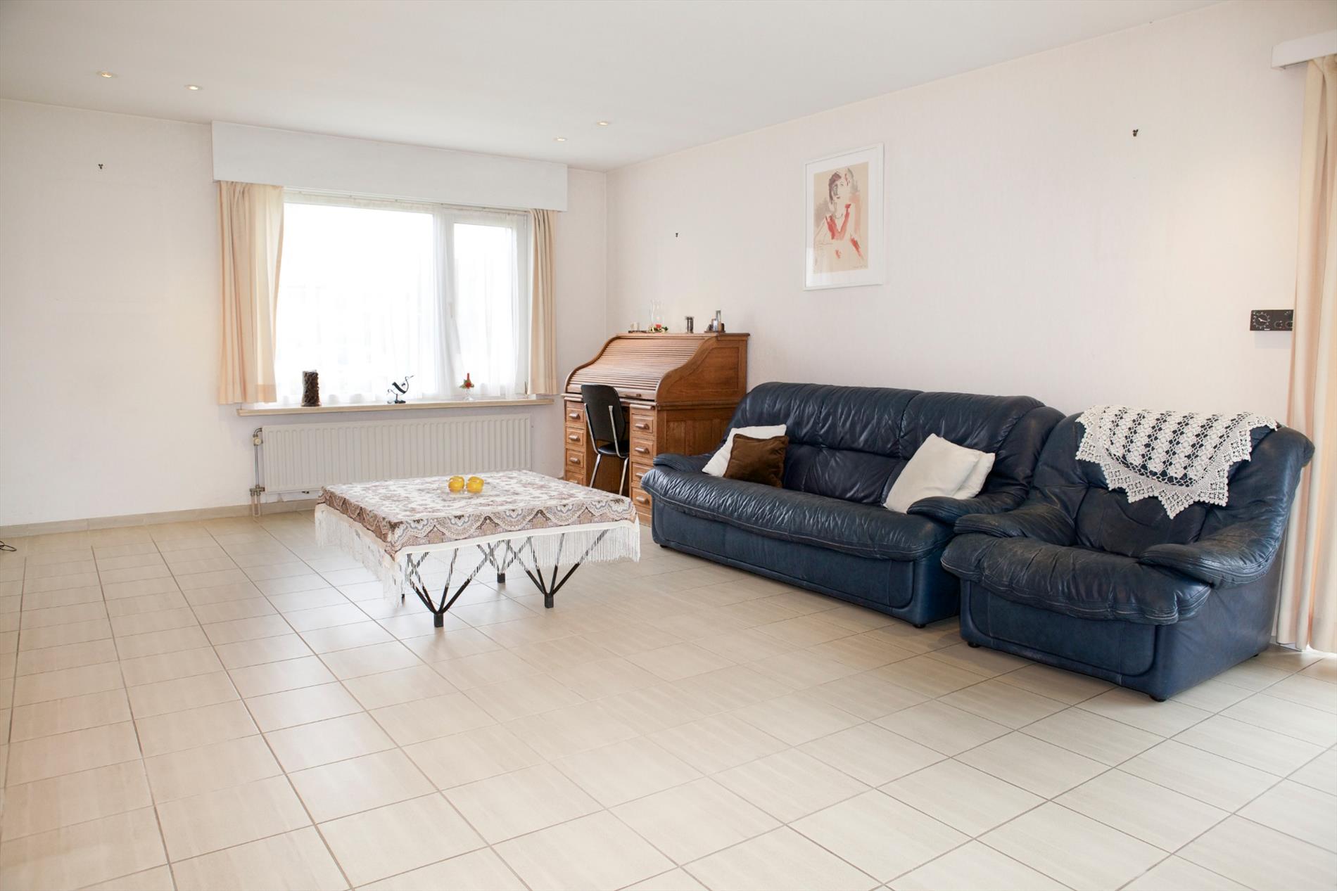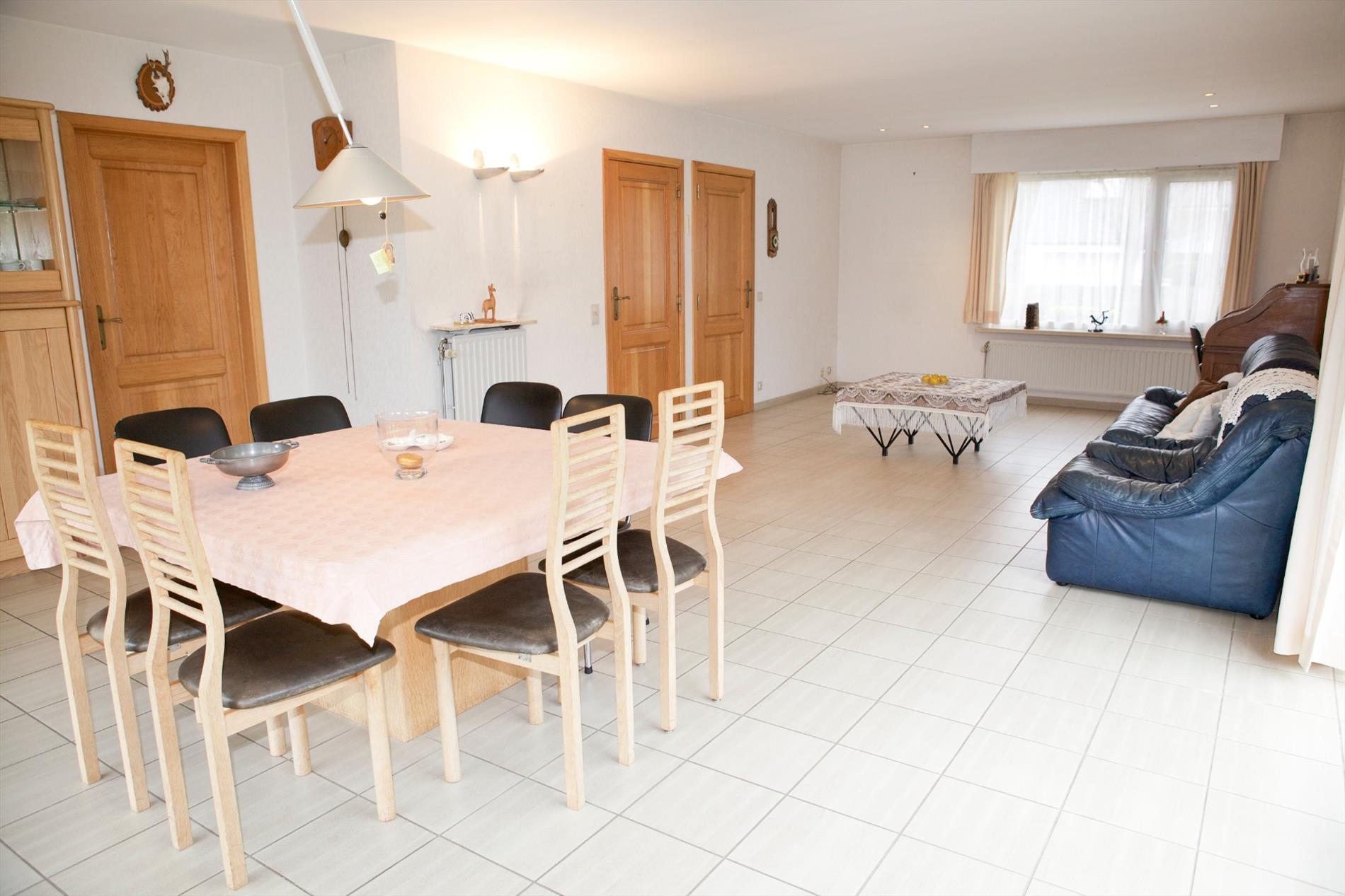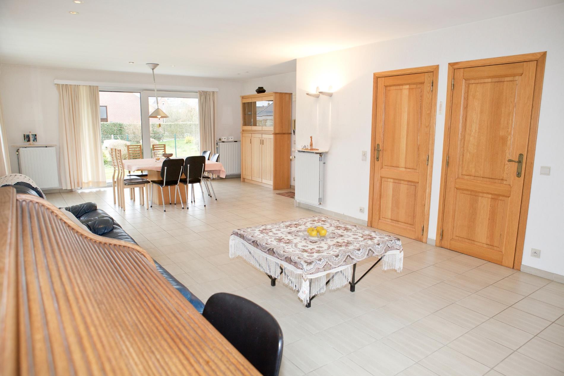 a) gelijkvloers: ruime inkom- en traphal met vestiarie en sierlijke eiken trap (+ stoellift),- w.c. + lavabo,- badkamer (1,65 x 1,40) met zitbad/douche (glazen douche-wanden * witte faience) en lavabo,- living (43 m²) met parlofoon, en terras-schuifraam,- groot zonneterras (11,10 x 2,60 * deels overdekt),- keuken (5,90 x 3,65) met terrasdeur en met 1ste keukenblok met met onder- en bovenkasten (in witte meubelplaat) + ingebouwde kookplaat, dampkap en vaatwasmachine ; en * 2de keukenblok met onder- en bovenkasten (in witte meubelplaat), + ingebouwde koelkast en oven,- wasplaats (3,90 x 2,40) met terrasdeur,- garage (5,55 x 5,30) met breedte (4,64 m.) en nieuwe elektrisch bediende sectionale poort, storkpomp (regenwater)- grote & brede oprit (5 x 4,50) met plaats voor 2 auto’s,- voor- zij- en achtertuin ;