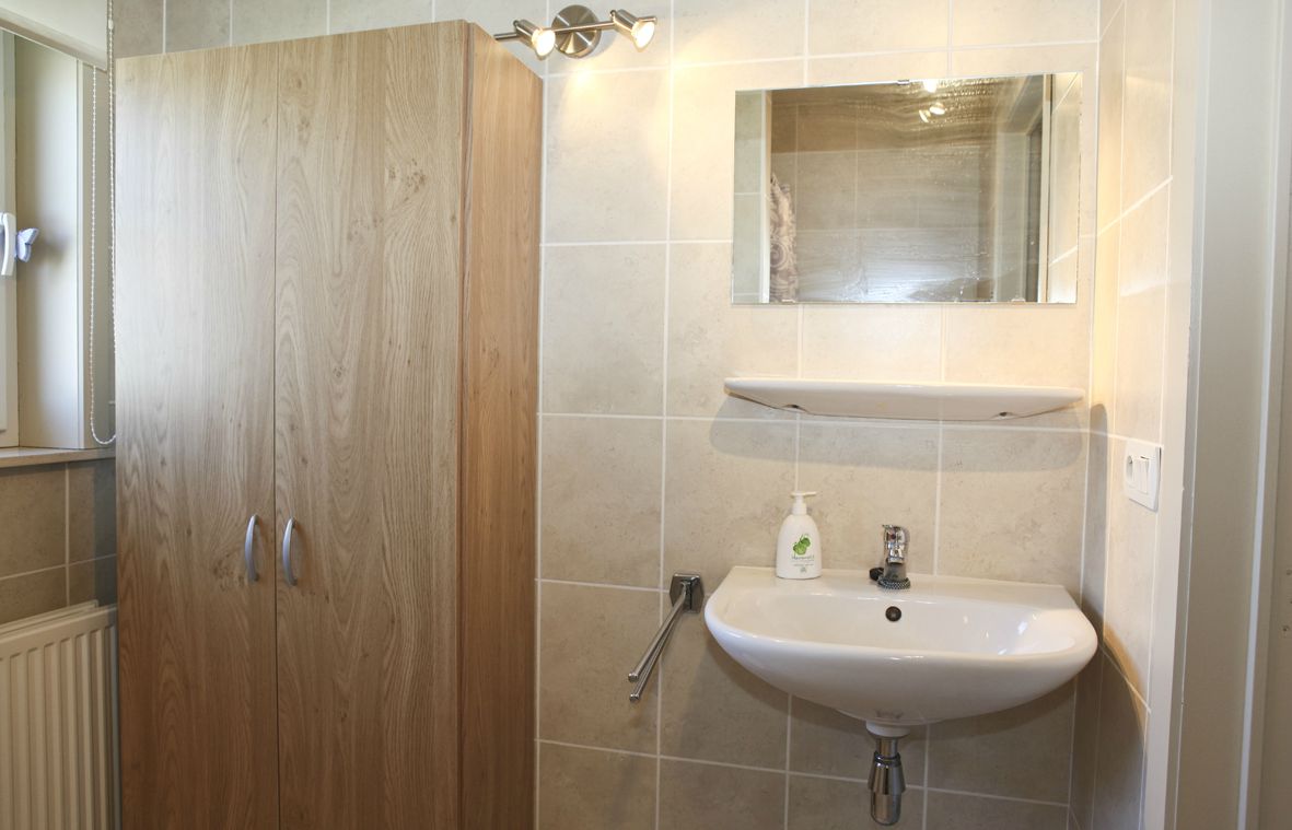 b) Eerste verdieping: overloop + zolderluik & vouwtrap,- toilet,- bureau of dressing,- voor-slaapkamer (3,70 x 2,90) + veluxraam,- achter-slaapkamer (2,90 x 2,40) + veluxraam (met mooi open landelijk zicht),- 2de achter-slaapkamer (3,75 x 2,40) + veluxraam,- en badkamer met inloopdouche, lavabo, en wc (mooie faience) ;