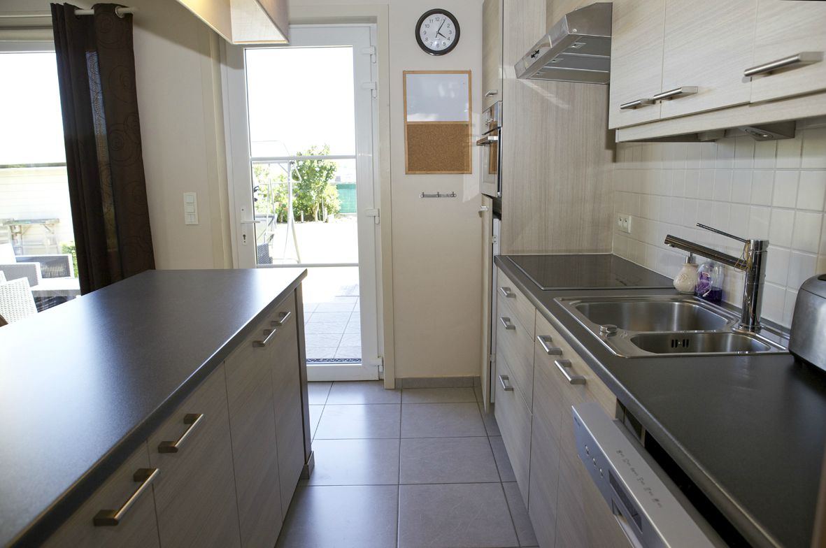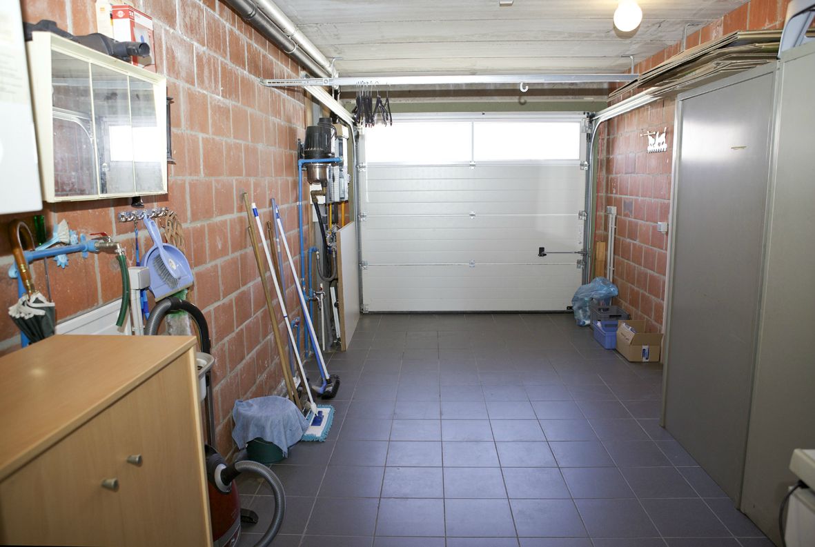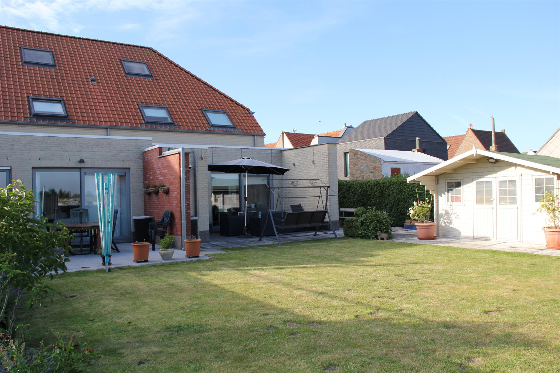 a) Gelijkvloers: inkom- & traphal (trap in beuk),- toilet met w.c. & lavabo (marmerachtige faience),- luchtige living (30 m² * met terras-schuifraam),- open keuken (2,30 x 3,40) met eetbar (met daaronder a/d kant v/d keuken: diverse onderkasten) + keukenblok met onder- en bovenkasten + ingebouwde ceramische kookplaat, dampkap, multi-functionele oven, frigo, vaatwasautomaat en dubbele inox afwasbak,- koele berging met aansluiting voor was- en droogautomaat,- garage (5,80 x 2,80) met sectionale poort, hydrofoor (regenwater), aardgas-wandgenerator (Bulex H.R.+), afgietbak en tellers van aardgas, elektriciteit (dag- en nachttarief), en water (grijze tegelvloer),- zonneterras (belegd met mooie dallen in natuursteen),- buiten-berging,- zonnige achtertuin met groot tuinhuis,- 2de zonneterras-prieel met houten plankenvloer (model: carport),- zijtuin en brede oprit ;