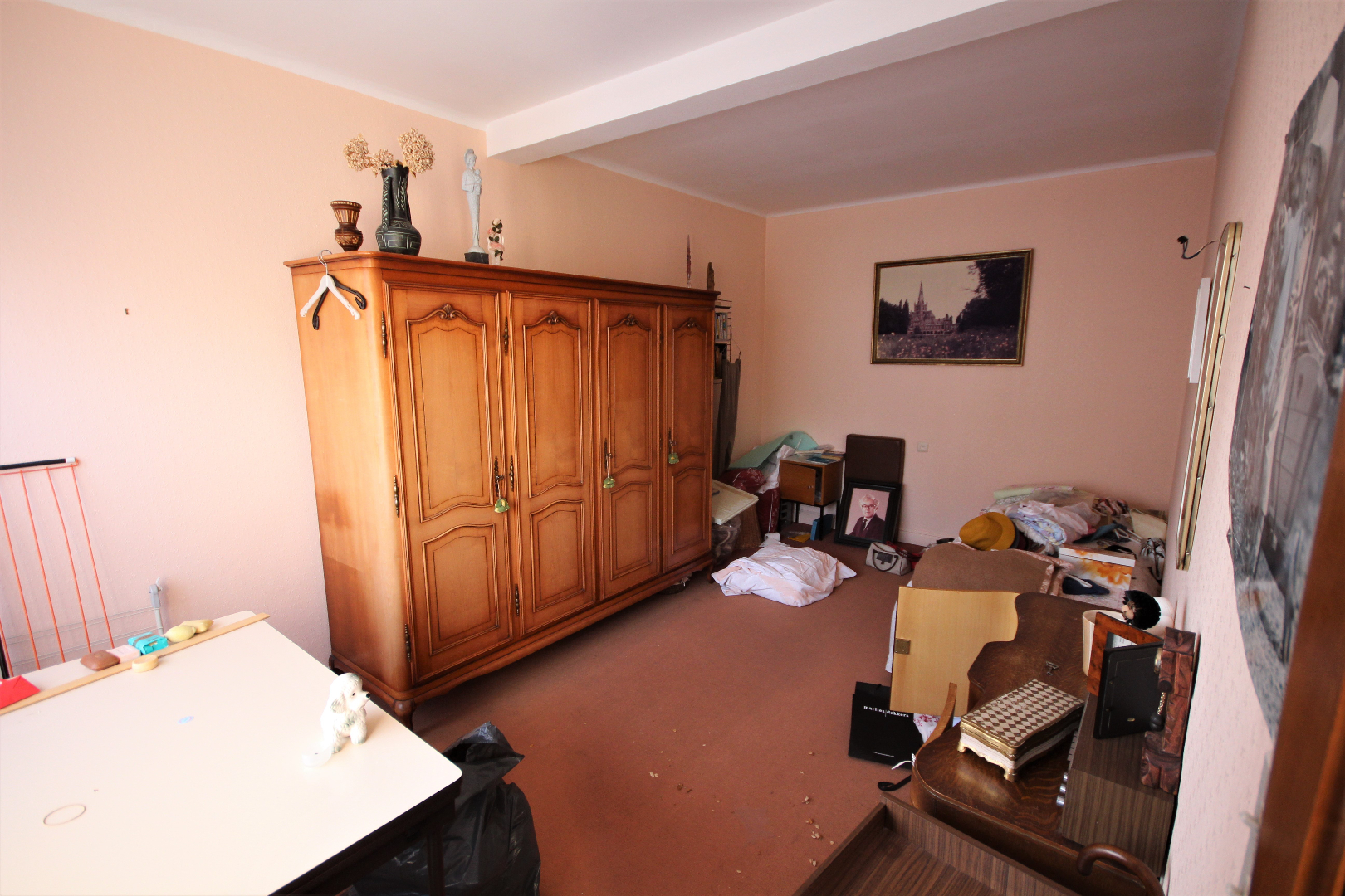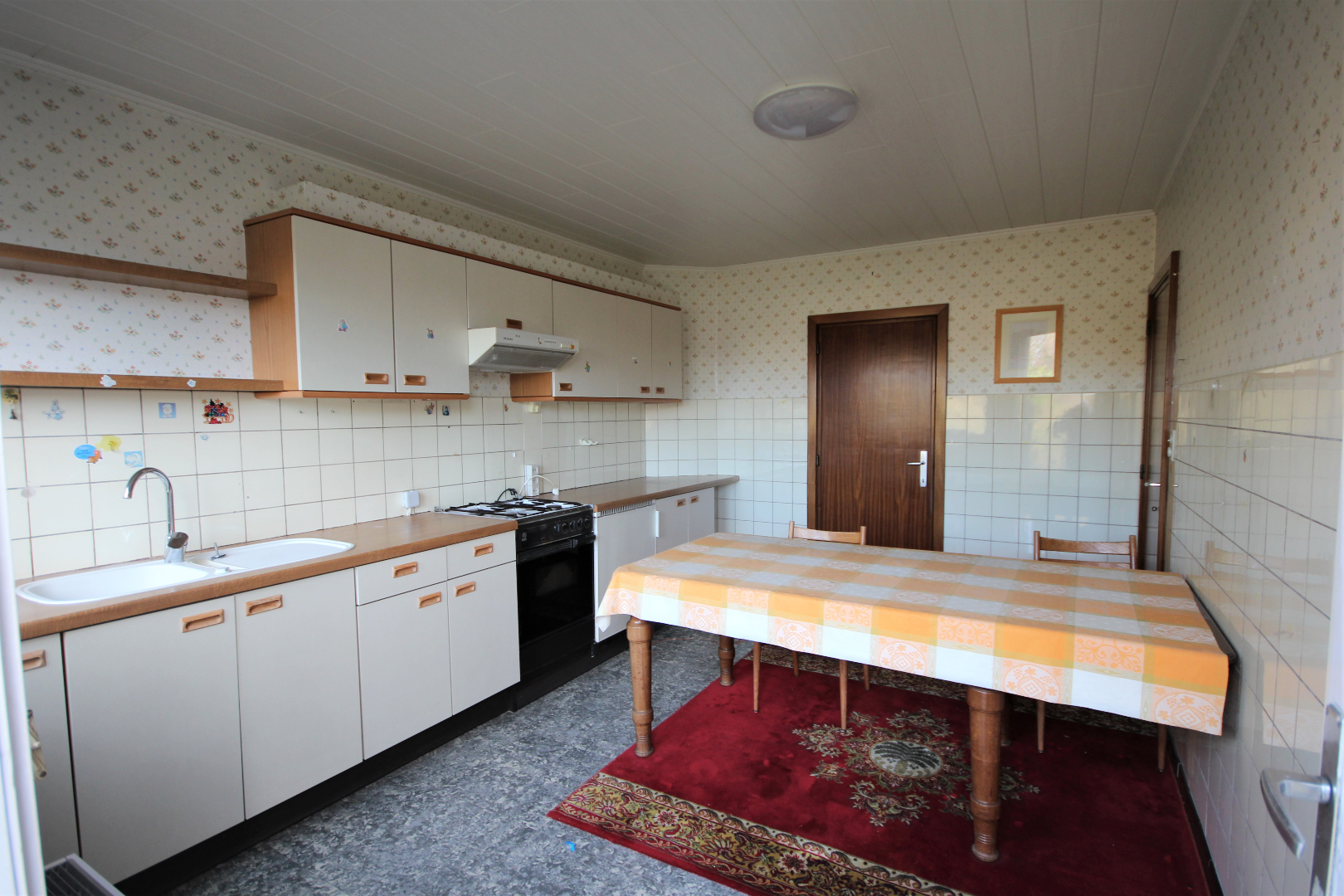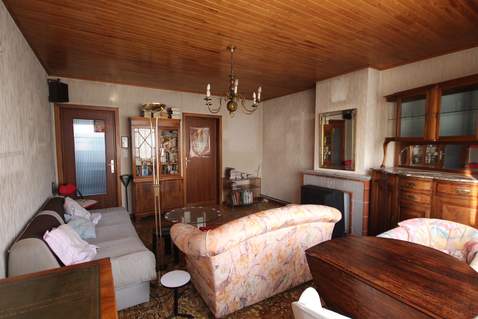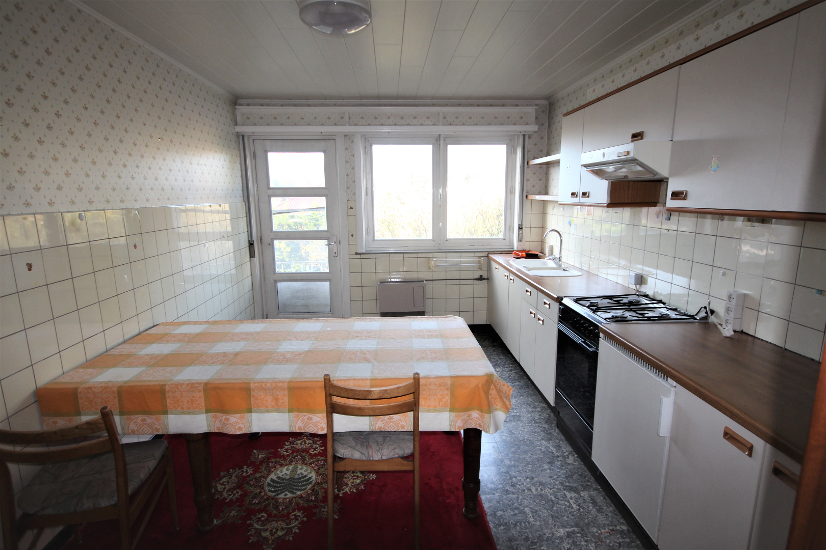 1ste & zolderverdiep: overloop + zolderluik,- kitchenette met onderkast + wit watersteen,- voor-slaapkamer (5,47 x 3),- * en appartement met hal + parlofoon,- living (4,92 x 4,27) met sierschouw + gaskachel,- keuken (4,49 x 3,19) met gaskachel en keukenblok (onder- en bovenkasten) + ingebouwde afwasbak, gasfornuis, dampkap, en frigo,- terras,- badkamer (3,27 x 2,11) met ligbad, w.c., lavabo, en gasgeiser,- en achter-slaapkamer (4,04 x 3,91),- * én grote zolderruimte (90 m²).