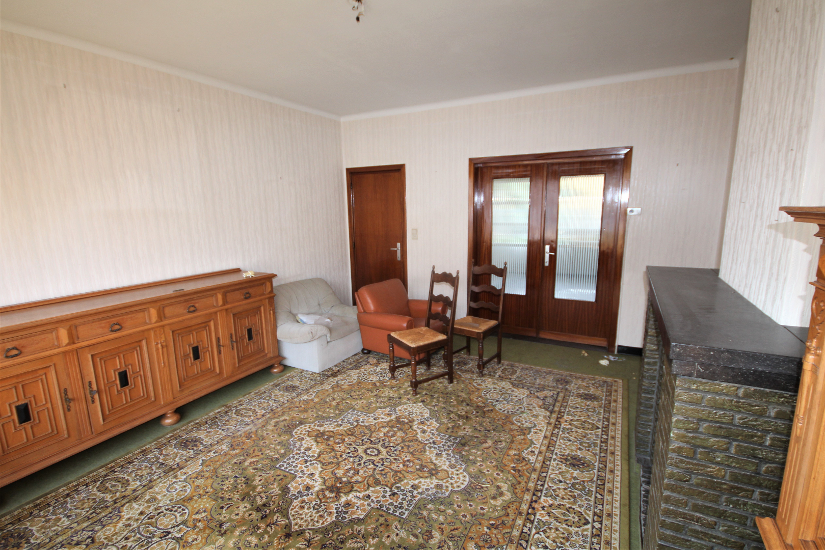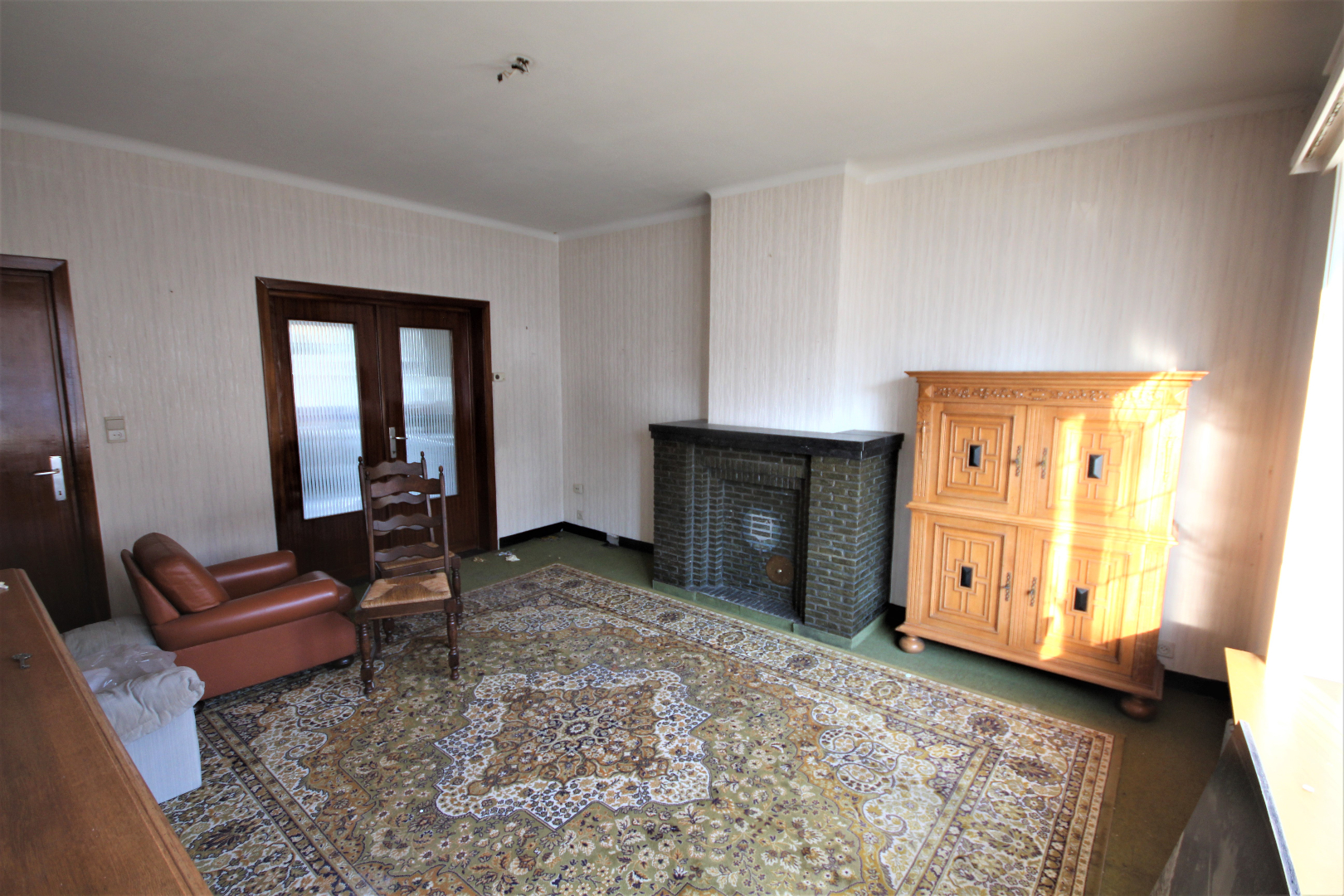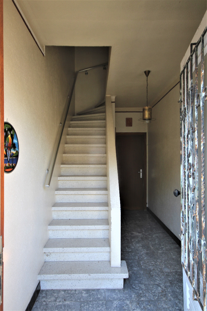 Gelijkvloers: inkom-& traphal * en appartement met hal,- living (4,88 x 4,27) + sierschouw,- keuken (4,47 x 3,17) met onder- en bovenkasten + dubbele inox afwasbak, gasfornuis, en dampkap,- badkamer (3,41 x 2,13) met ligbad, lavabo, w.c., en gasgeiser,- slaapkamer (4,02 x 3,93),- garage (5,46 x 2,99),- koer-terras (+ keldertrap) en Zuid-west-gerichte tuin ;