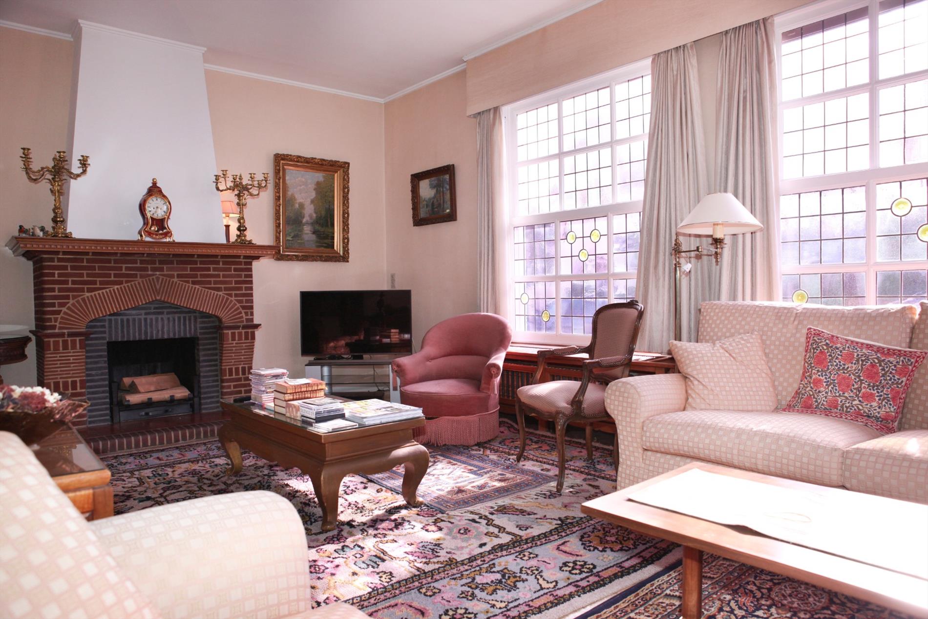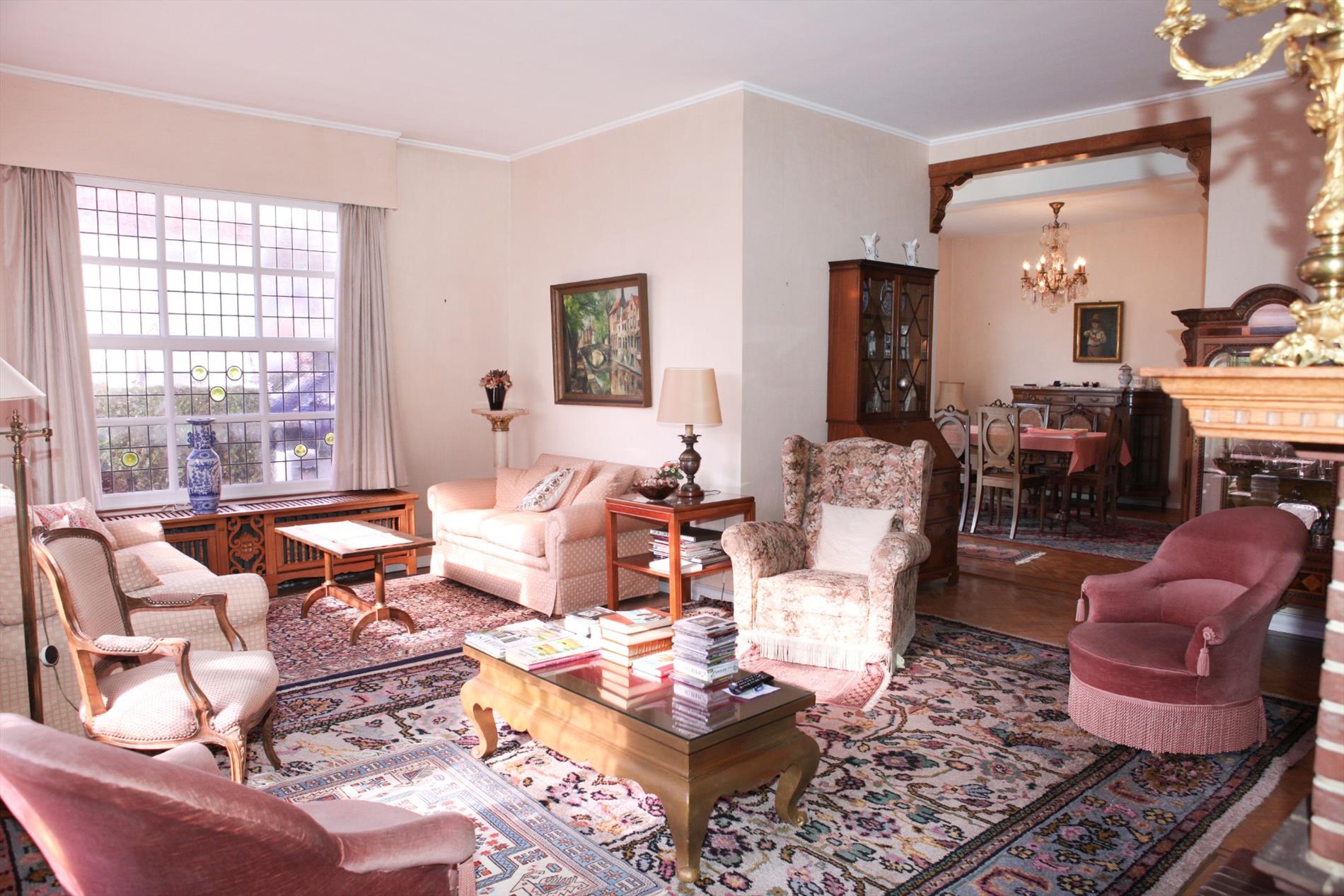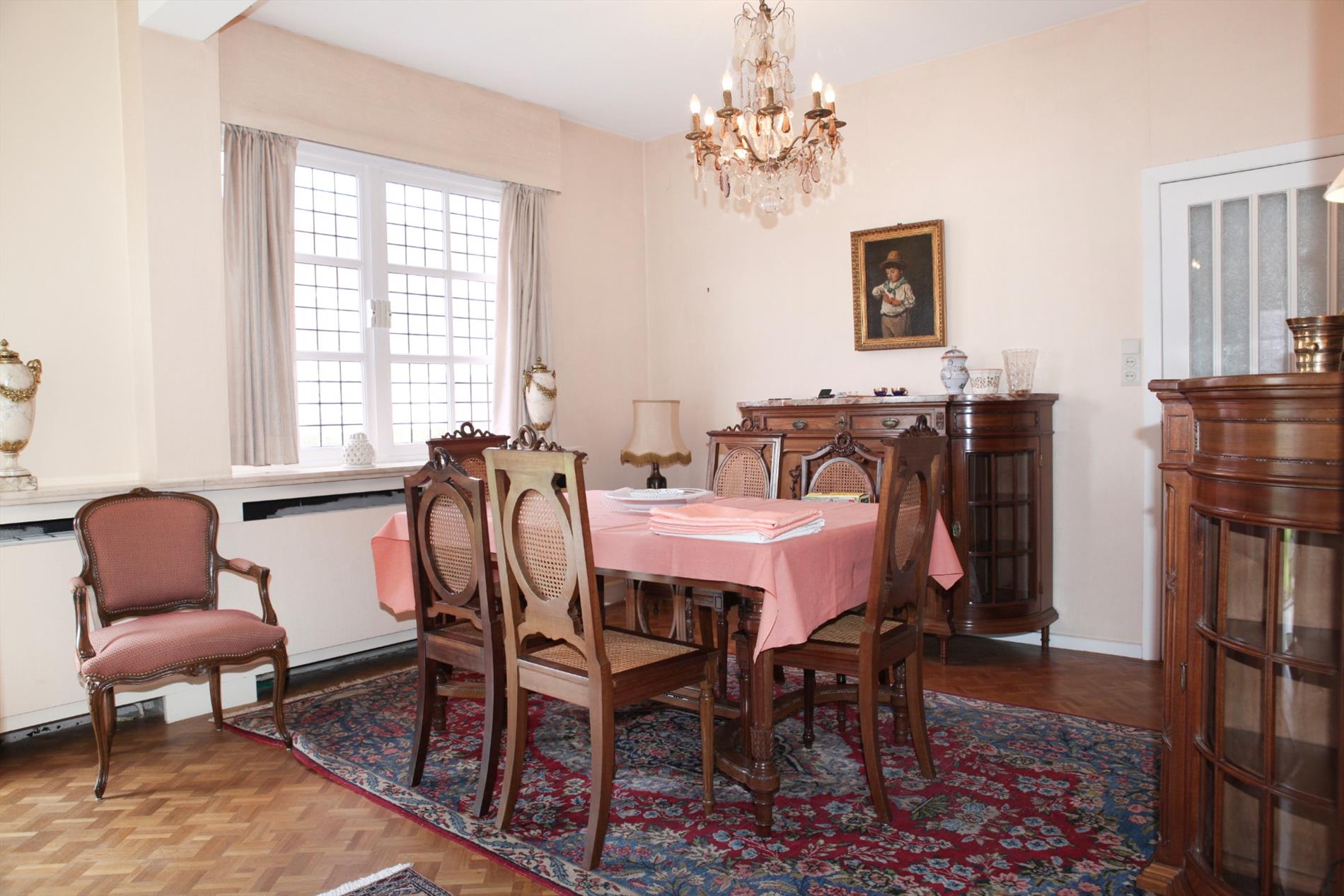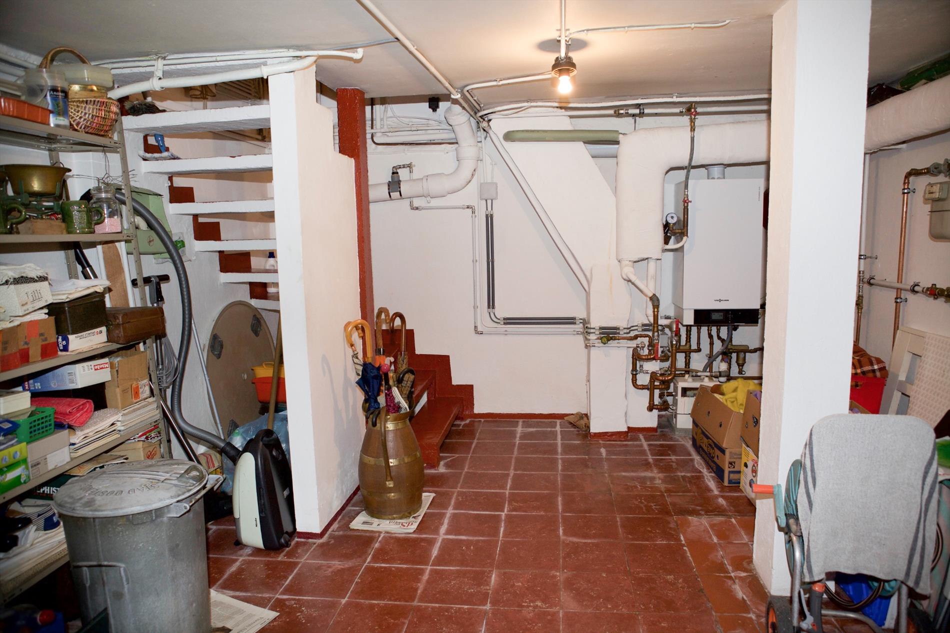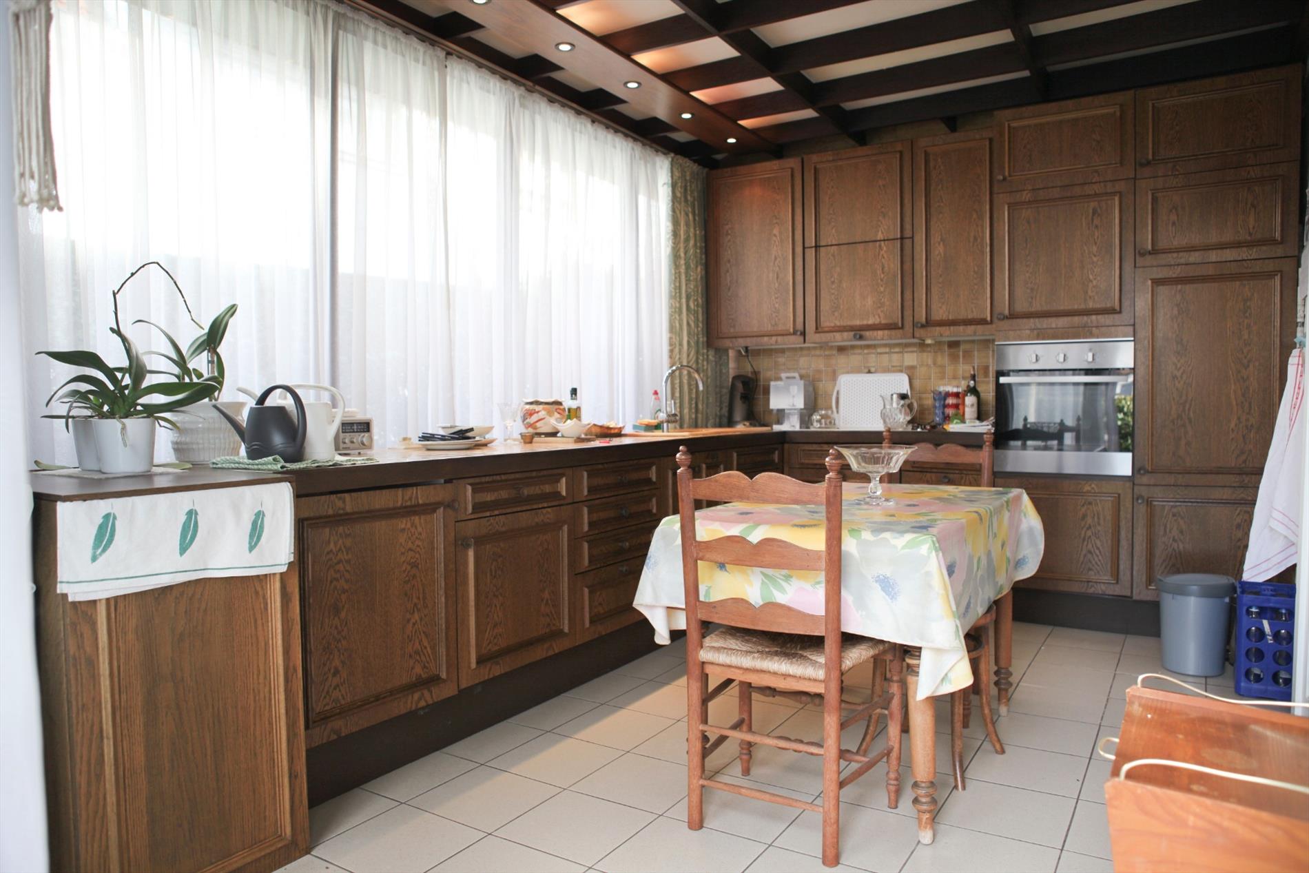 a) Gelijkvloers & kelder: ruime en luchtige woonkamer (46 m²) met half-open inkomhall, aansluitende eetplaats (4x x4), en samenvloeiende salon (28 m² * met sierschouw-openhaard in rood-metselwerk),- bar (onder de trap),- annexe-keuken (5,20 x 3,10 * met L-vormige keukenblok met eiken onder- en bovenkasten + ingebouwde ceramische kookplaat + uitschuifbare dampkap, warmeluchtoven, frigo, dubbele inox afwasbak * grijze ceramieke tegelvloer),- palier,- toilet (met w.c. + lavabo),- * én kelder : met stookplaats (3,90 x 3,70 * c.v.-wandgenerator, zekeringskast, en tellers van water, aardgas, en elektriciteit),- voorraadkelder (2,75 x 2,40),- 3de kelderplaats (2,60 x 2,40 * met buitengebruik-gestelde mazouttank ) ;