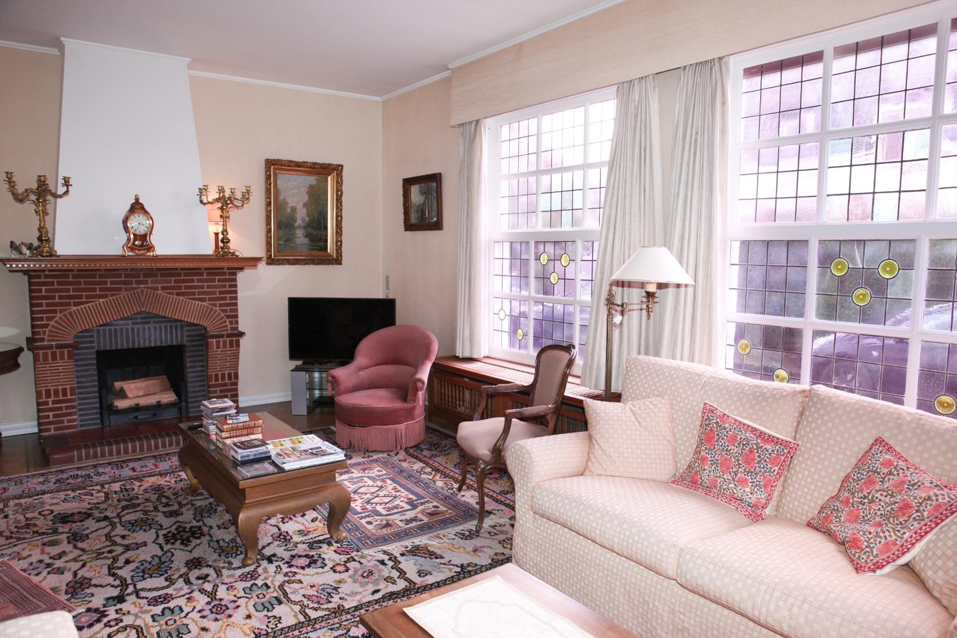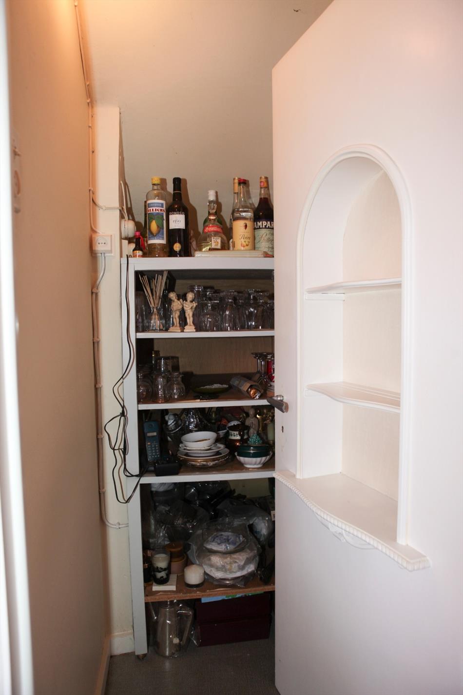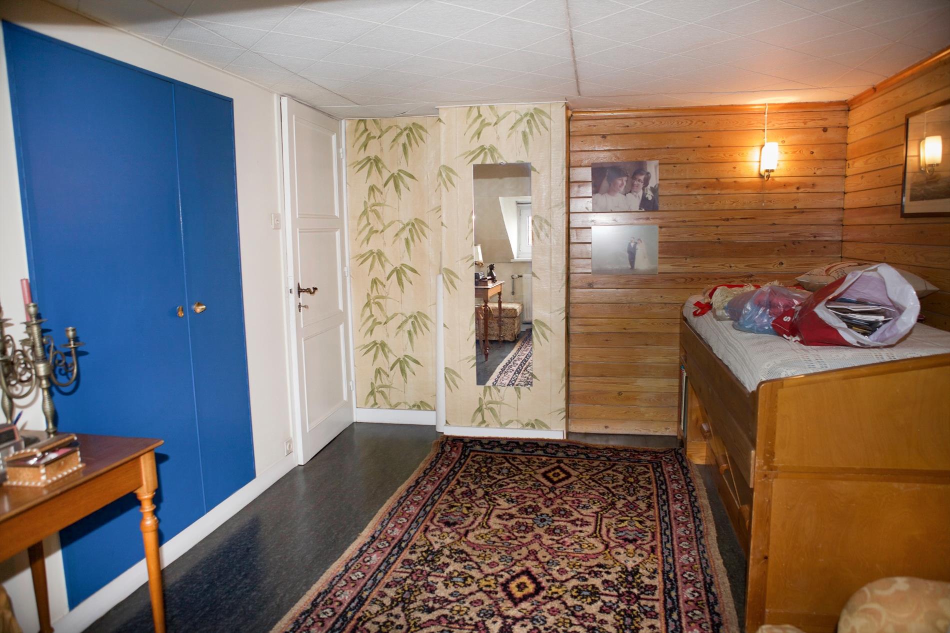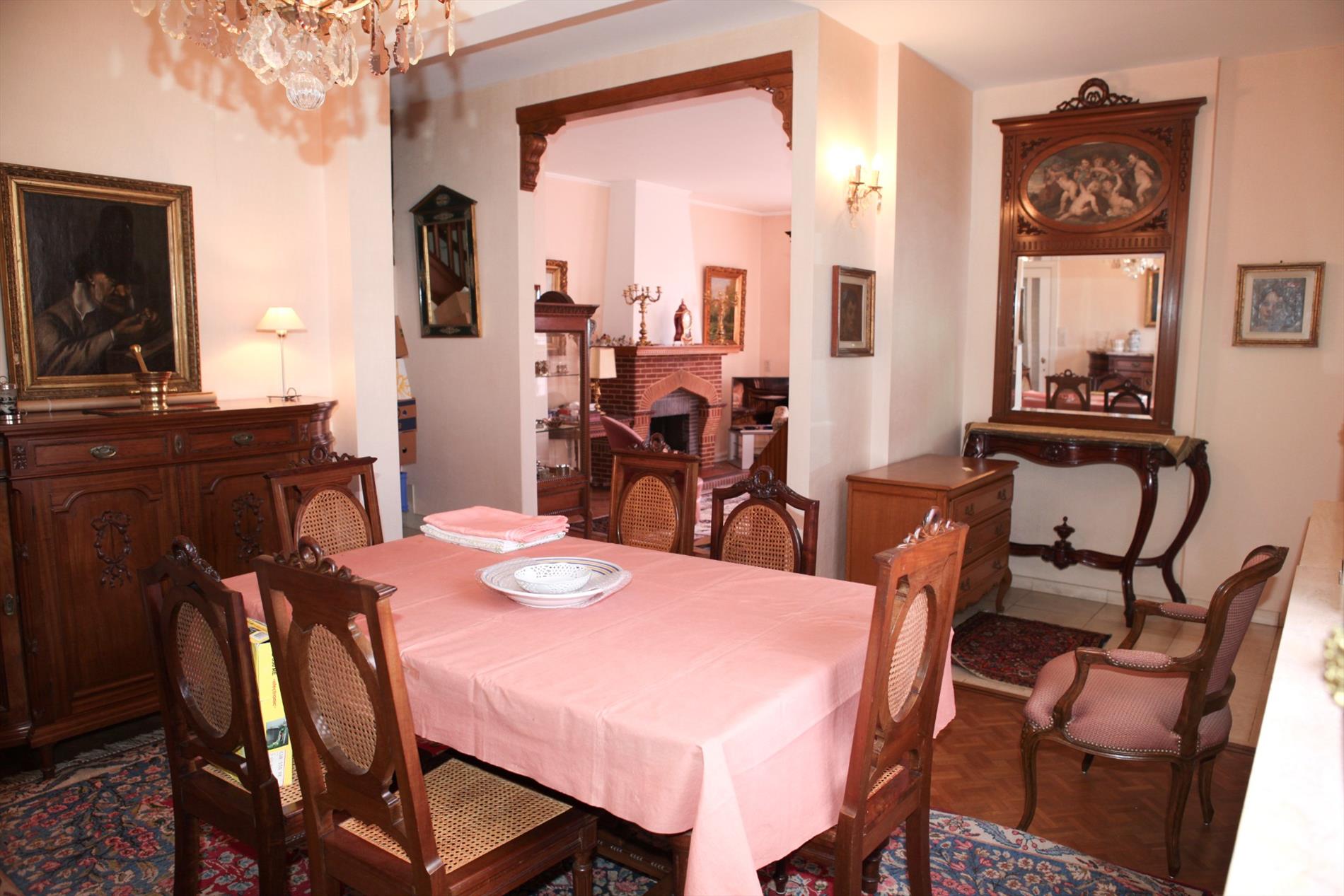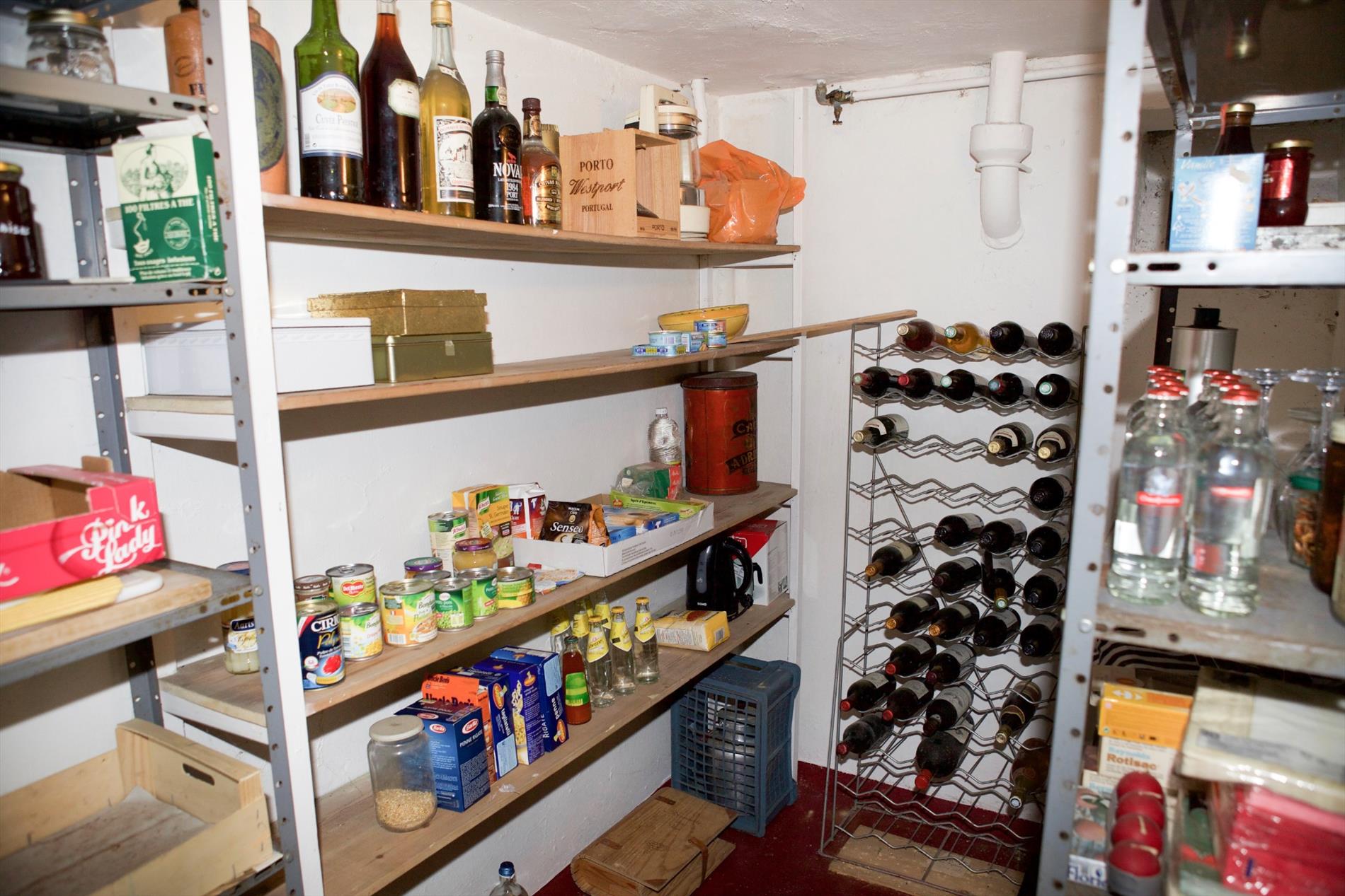 a) Gelijkvloers & kelder: ruime en luchtige woonkamer (46 m²) met half-open inkomhall, aansluitende eetplaats (4x x4), en samenvloeiende salon (28 m² * met sierschouw-openhaard in rood-metselwerk),- bar (onder de trap),- annexe-keuken (5,20 x 3,10 * met L-vormige keukenblok met eiken onder- en bovenkasten + ingebouwde ceramische kookplaat + uitschuifbare dampkap, warmeluchtoven, frigo, dubbele inox afwasbak * grijze ceramieke tegelvloer),- palier,- toilet (met w.c. + lavabo),- * én kelder : met stookplaats (3,90 x 3,70 * c.v.-wandgenerator, zekeringskast, en tellers van water, aardgas, en elektriciteit),- voorraadkelder (2,75 x 2,40),- 3de kelderplaats (2,60 x 2,40 * met buitengebruik-gestelde mazouttank ) ;
