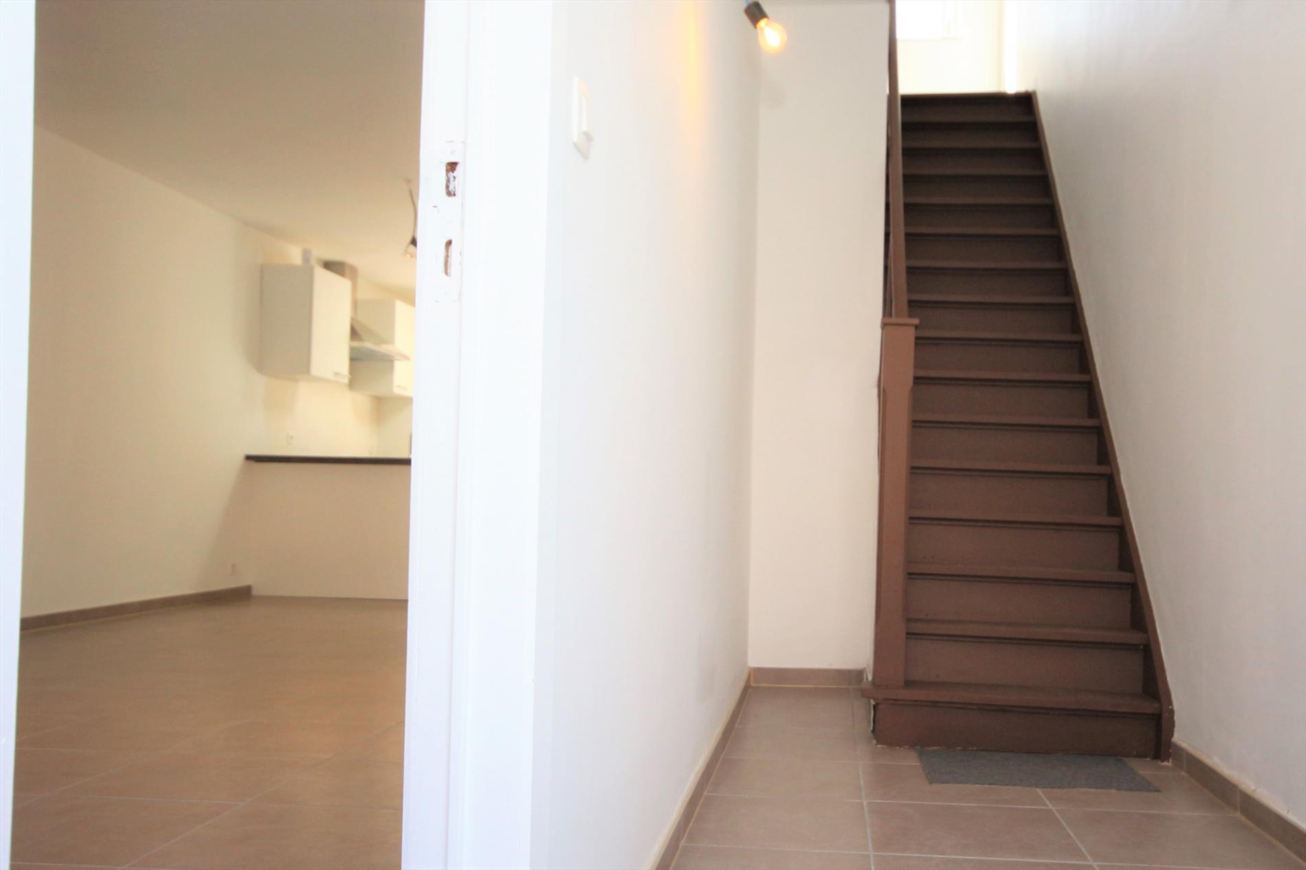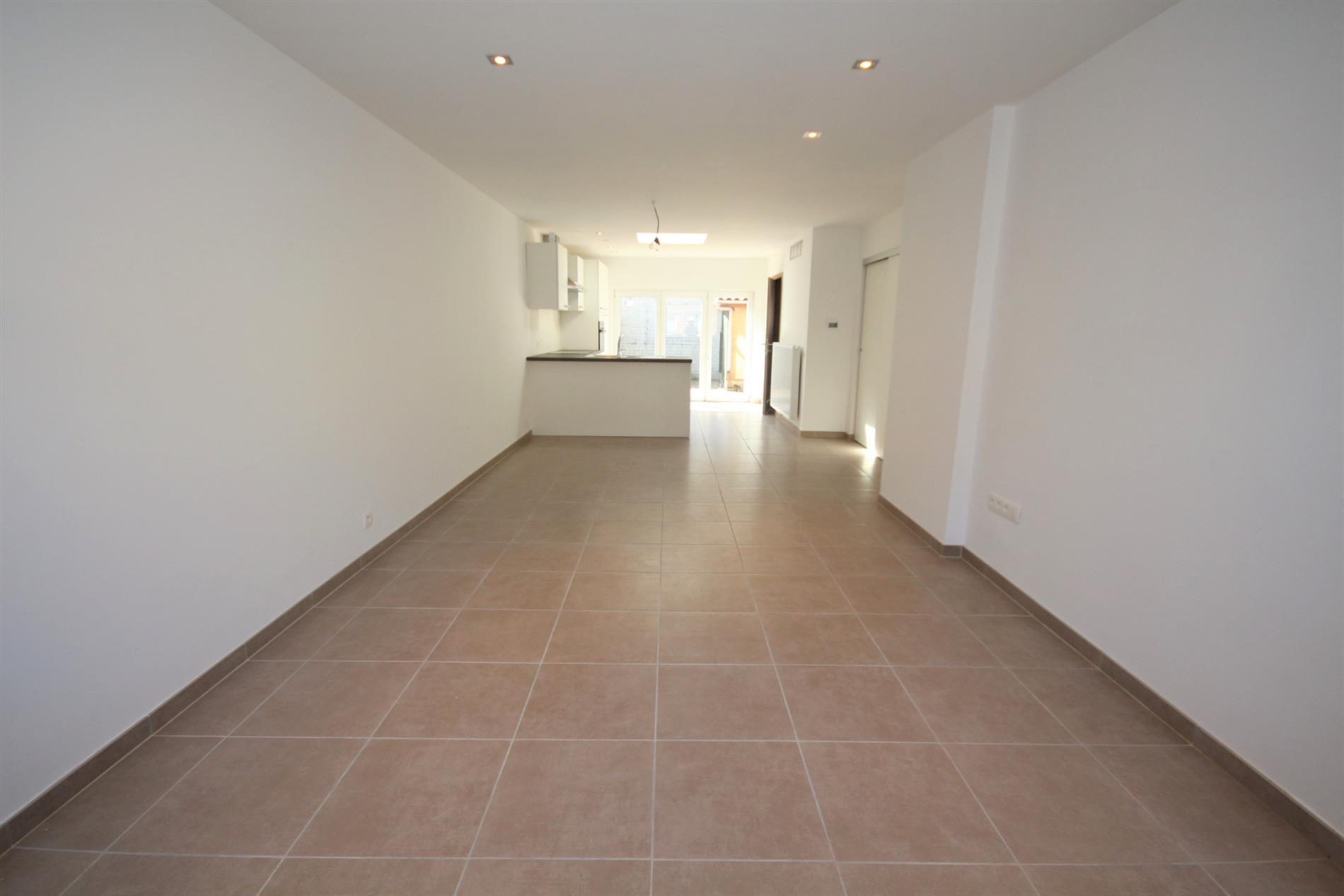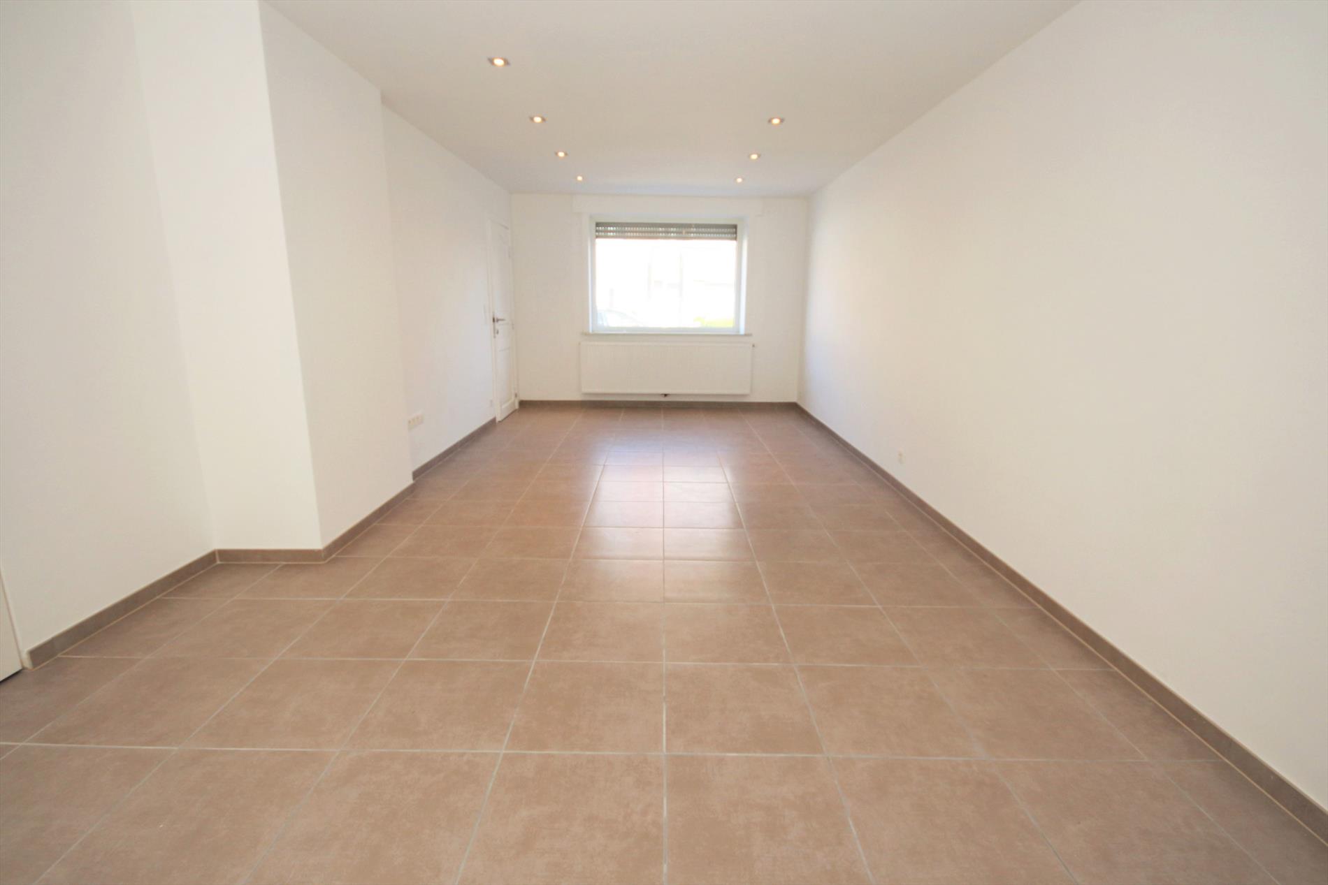 a) gelijkvloers : hall met trap en berging,- ruime lichtrijke woonkamer (4,75 x 3,35),- vernieuwde open keuken (3,65 x 3,21) voorzien van L-vormige keukenblok met kasten, keramische kookplaat, koelkast, dampkap, dubbele spoelbak,- vernieuwde badkamer (2,81 x 1,60) met inloopdouche, wasmeubel met lavabo en toilet,- stookruimte met CV en was aansluiting,- zonnige koer (4,85 x 5,30) met berging,- oprit (4,20 x 4,80);