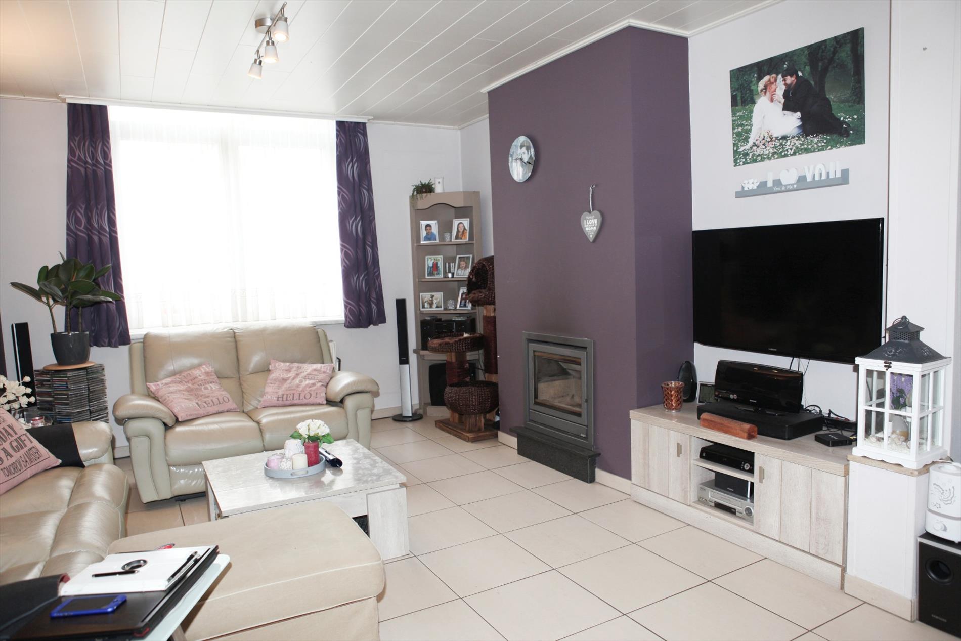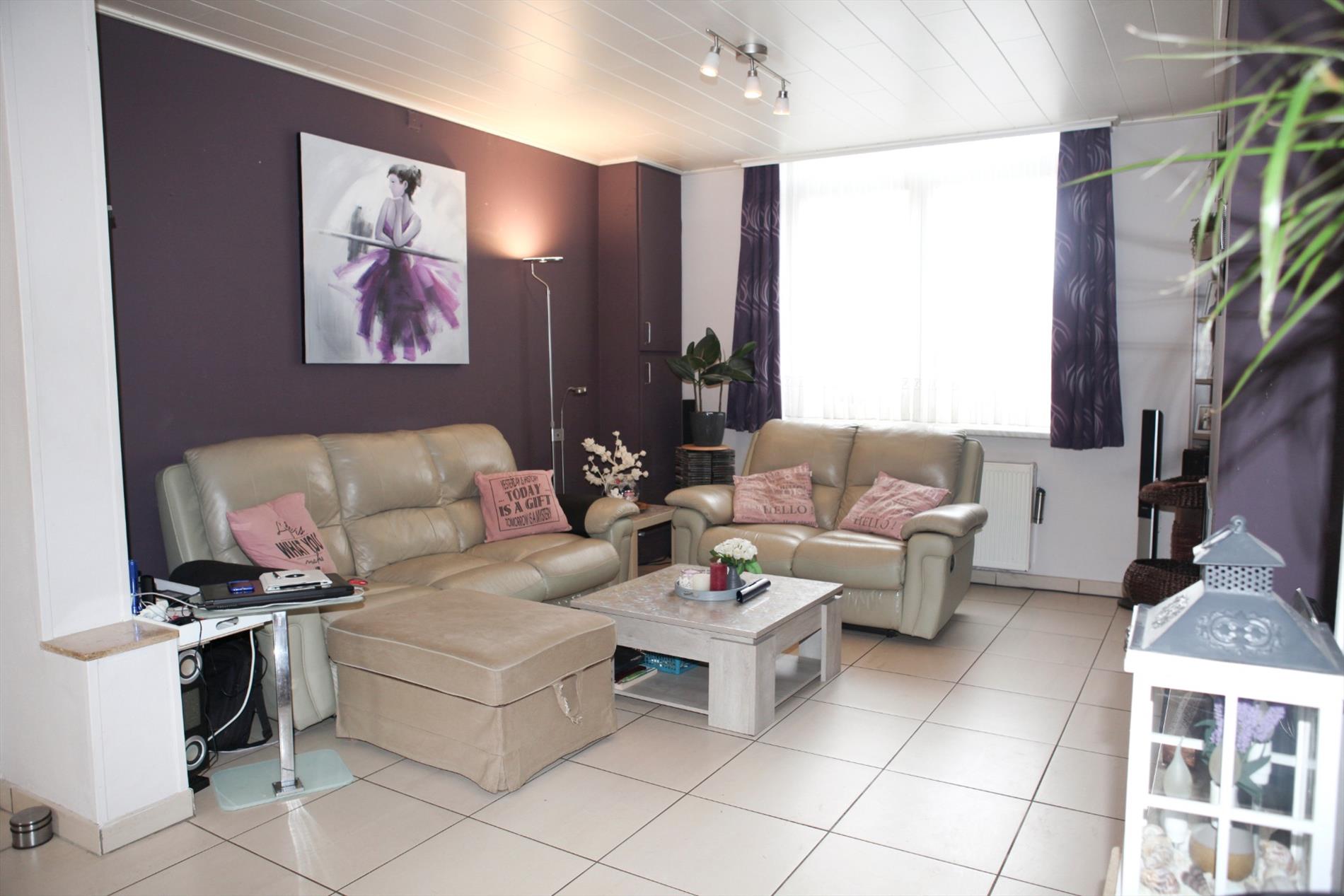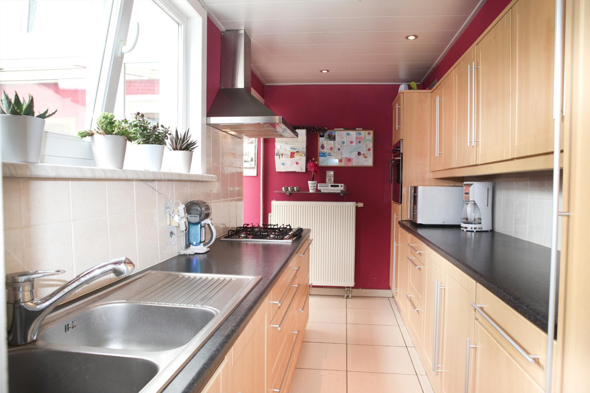 a) gelijkvloers: Hall met vestiaire (vals plafond + spots),- living (8,40 x 3,51) met hout of gas inbouwcassette (verlaagd plafond * nieuwe glazen schuifdeur),- veranda (2,20 x 3,21) met eetplaats en terrasschuifraam,- keuken (4,10 x 2) met nieuwe toestellen: oven, gaskookbekken, dampkap en koelkast (vals plafond + spots * faience),- badkamer/wasplaats (2,07 x 2,07) met hang-wc, aansluiting douche, handdoekradiator, CV-brander en aansluiting voor wasmachine,- koer met tuintje (40 m²) met tuinhuis (kunststof) en 2 fonteintjes ;