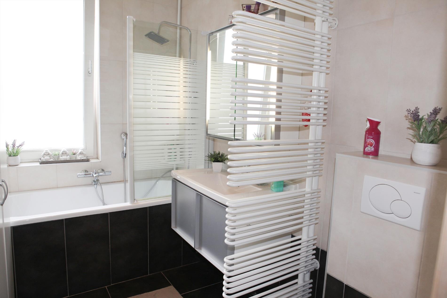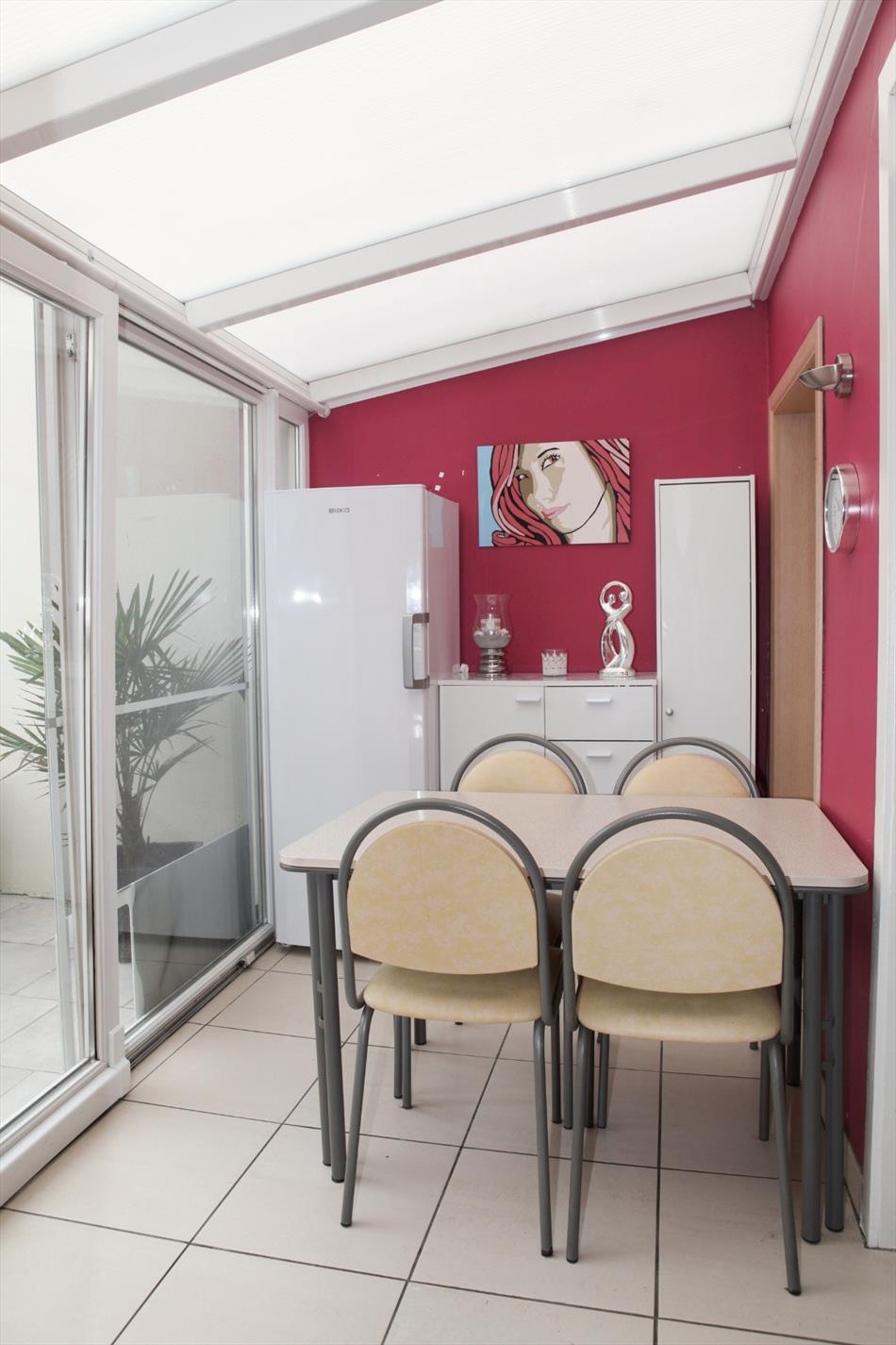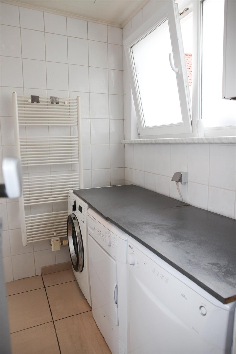 a) gelijkvloers: Hall met vestiaire (vals plafond + spots),- living (8,40 x 3,51) met hout of gas inbouwcassette (verlaagd plafond * nieuwe glazen schuifdeur),- veranda (2,20 x 3,21) met eetplaats en terrasschuifraam,- keuken (4,10 x 2) met nieuwe toestellen: oven, gaskookbekken, dampkap en koelkast (vals plafond + spots * faience),- badkamer/wasplaats (2,07 x 2,07) met hang-wc, aansluiting douche, handdoekradiator, CV-brander en aansluiting voor wasmachine,- koer met tuintje (40 m²) met tuinhuis (kunststof) en 2 fonteintjes ;