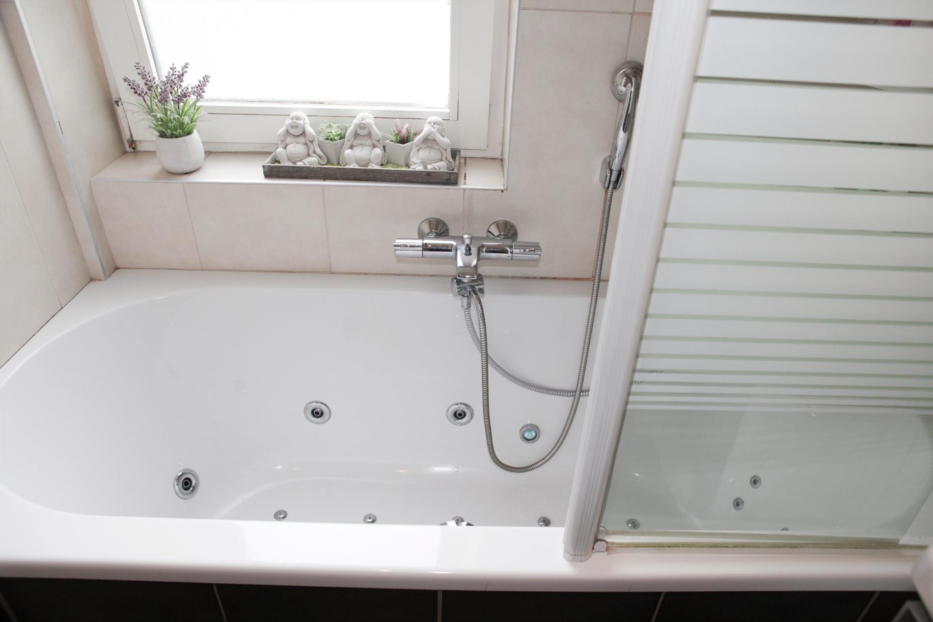 b) eerste verdieping: houten trap,- overloop,- badkamer (3,06 x 1,87) met jacuzzi + douchewand, hang-wc en toiletmeubel met lavabo (vals plafond + spots * faience),- voor-slaapkamer (4,01 x 3,30),- achter-slaapkamer (4,05 x 3,55) met distributie;