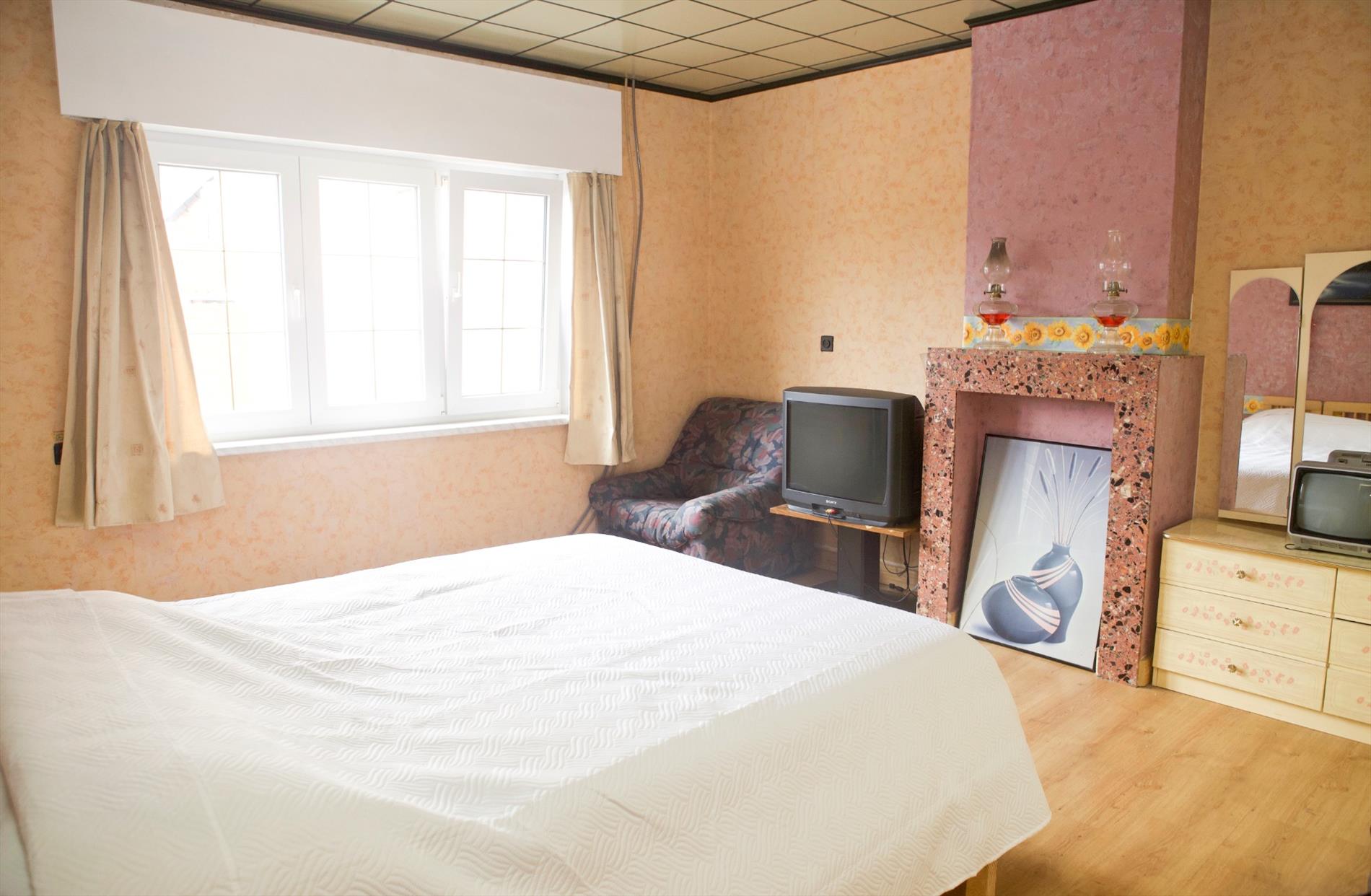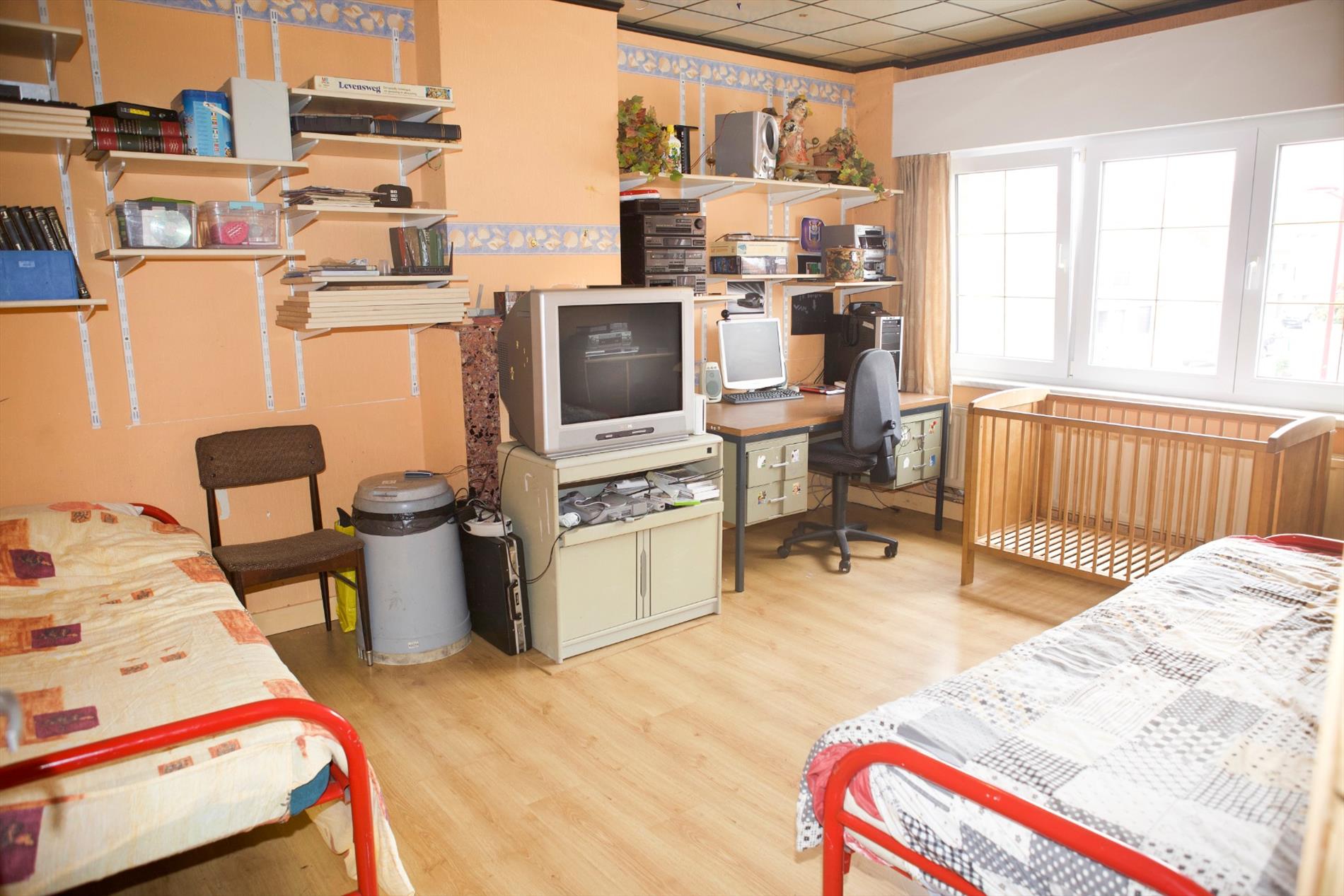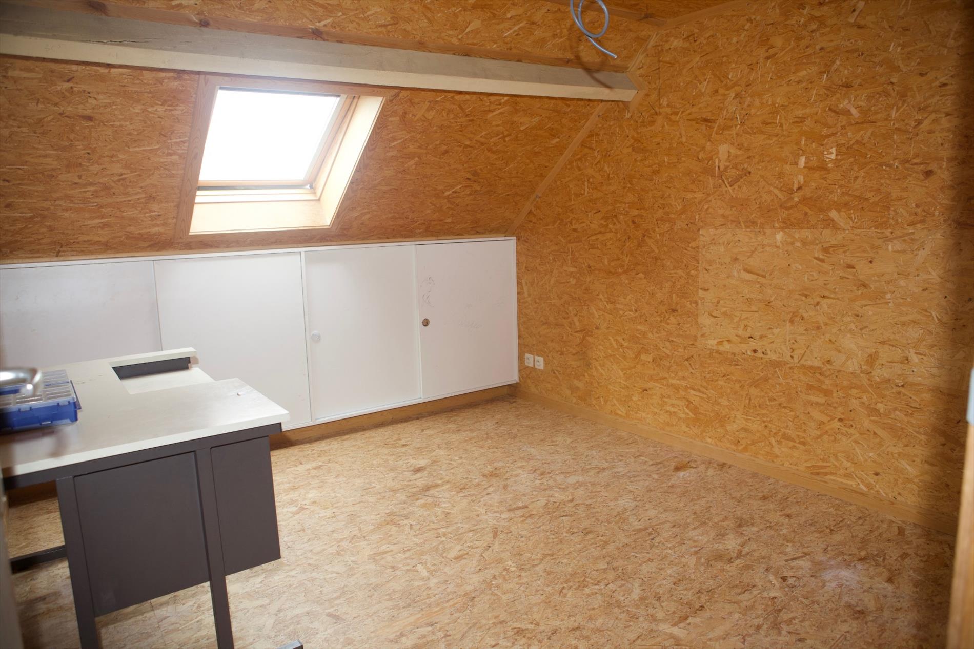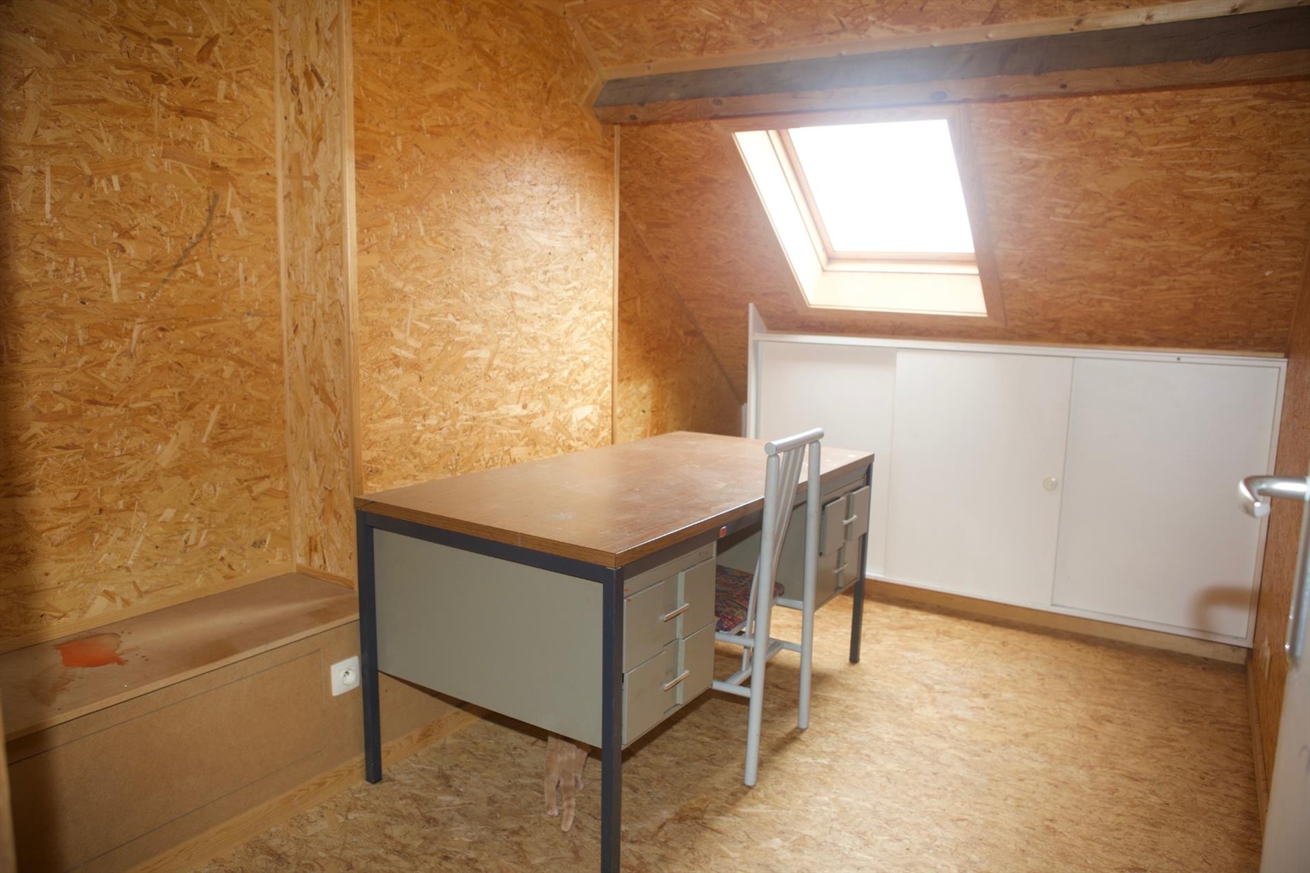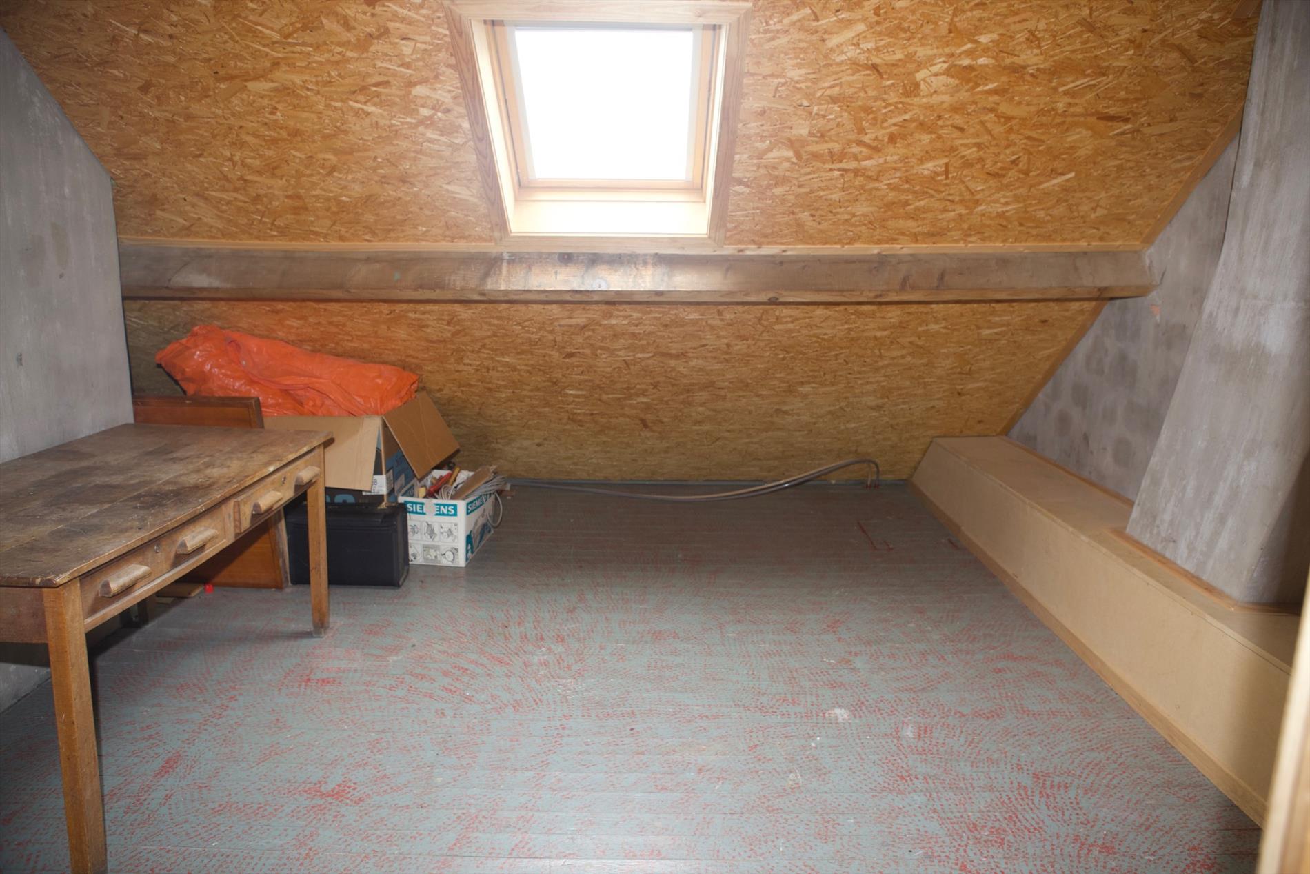b) 1-ste & zolderverdiep: overloop (laminaat) + zoldertrap (beuk),- voor-slaapkamer (4,70 x 3,60),- 2de voor-slaapkamer (3,20 x 2),- achter-slaapkamer (4,55 x 3,92),- te-renoveren badkamer,- zolder (4,20 x 3,92) + veluxraam,- 2 mansardekamer (3,50 x 2,98 en 3,50 x 2,40) met elk één veluxraam + ingemaakte kasten,- en opperzolder.