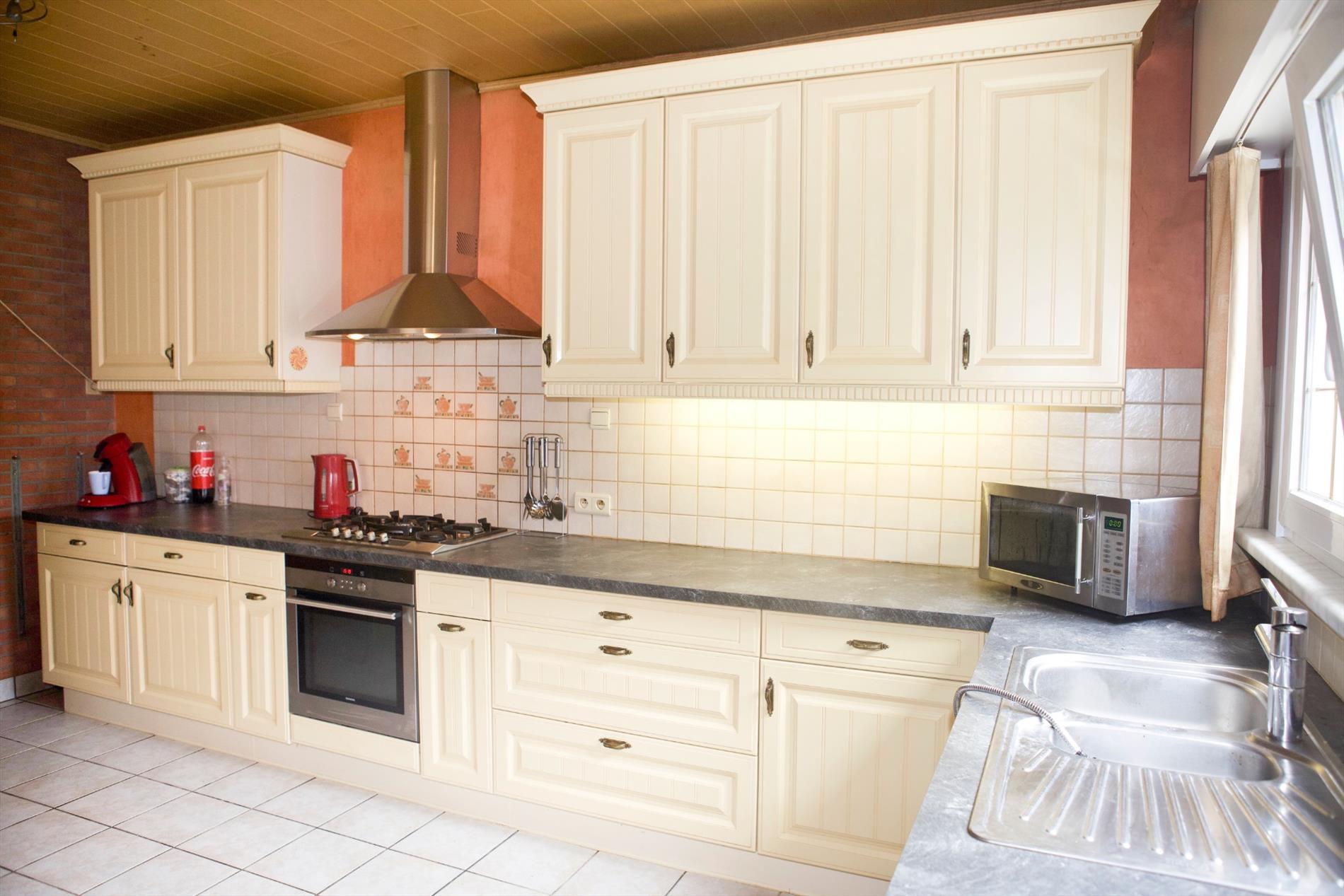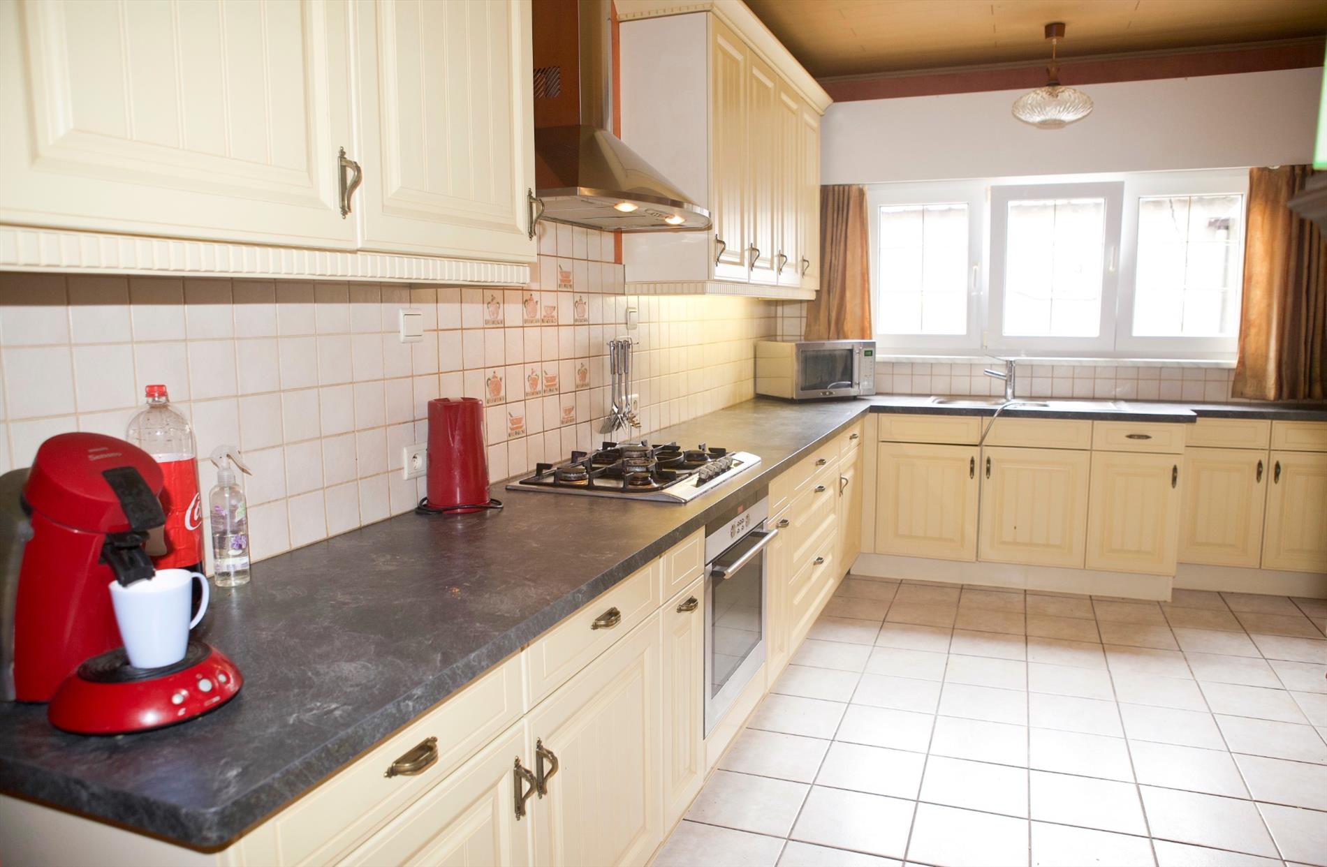 a) gelijkvloers & kelder: inkomhall (trap in granito * teller & zekeringkast),- toilet,- garage (4,78 x 3,62) met elektrisch-bediende sectionale poort, wandgenerator & gasgeiser,- woonkamer (39 m²) met salon (17,50 m²) * eetplaats (8,35 m²) met keukenblok (onder- en bovenkasten), en lichtkoepel * en keuken (13,30 m²) met L-vormige keukenblok (country style) met onder- en bovenkasten (in beige meubelplaat) + ingebouwde oven, gas-kookplaat, inox hangdampkap, en dubbele inox-afwasbak (plafond in laminaat),- zonnige koer-terrras (20 m²),- en 2 kelderplaatsen met hydrofoor, water-& gasteller, dompelpomp + aansluiting voor wasautomaat;