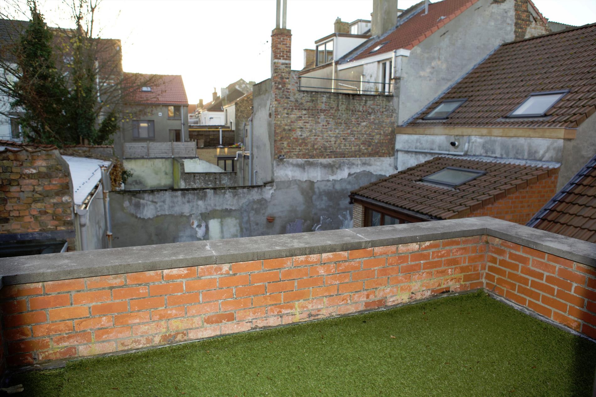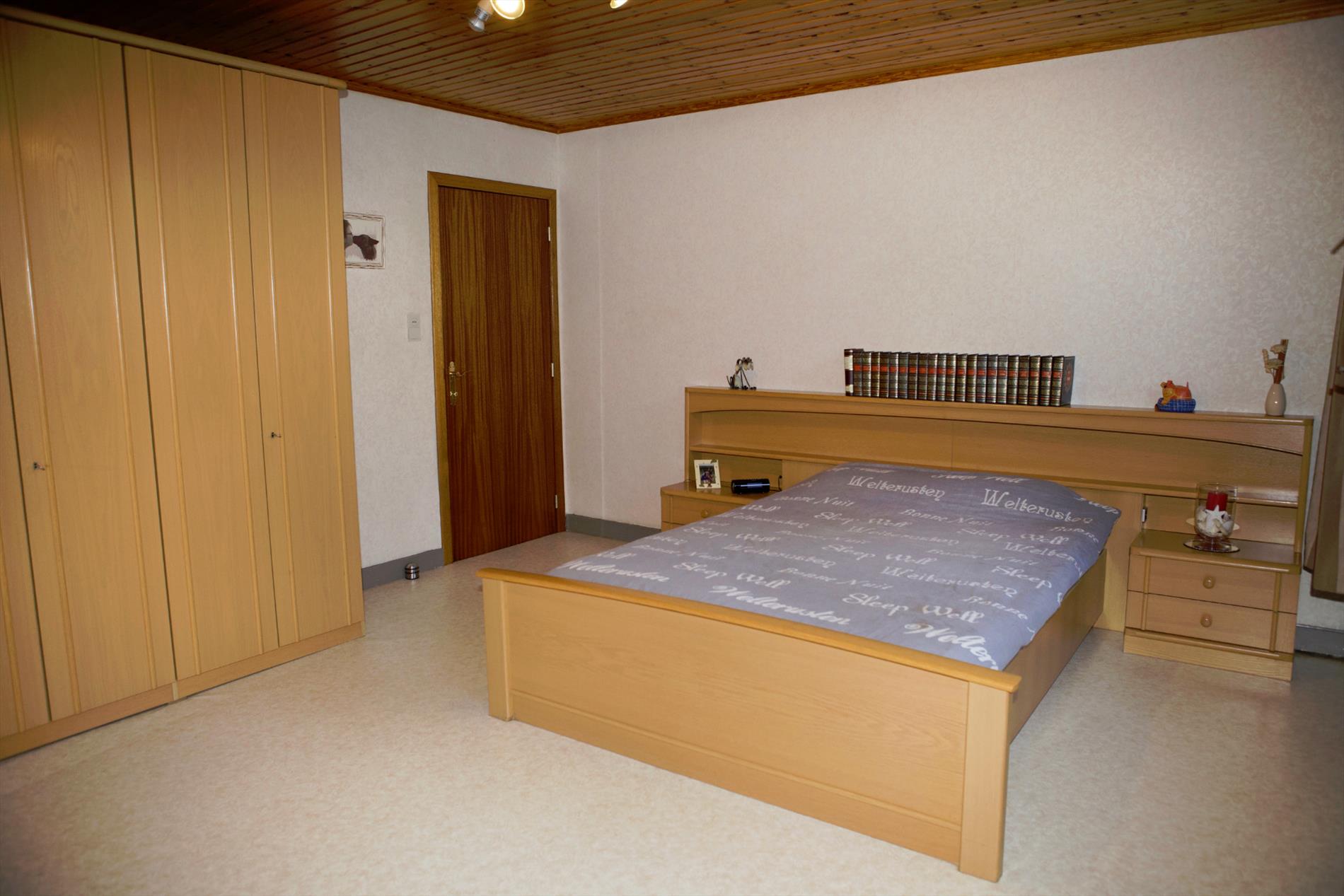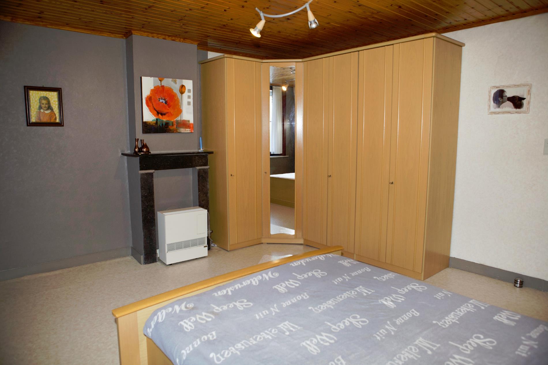 b) eerste verdieping: overloop,- grote voor-slaapkamer (4,02 x 4,53) met gaskachel (plafond in planchetten),- achter-slaapkamer (4,25 x 2,90) met schuifraam,- terras (2,01 x 3,21 - zonnekant) met nieuwe roofing + kunstgras ;