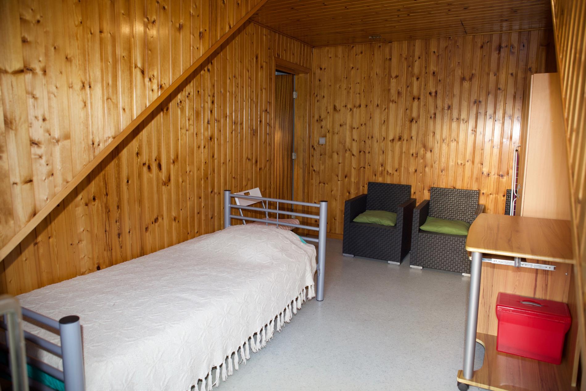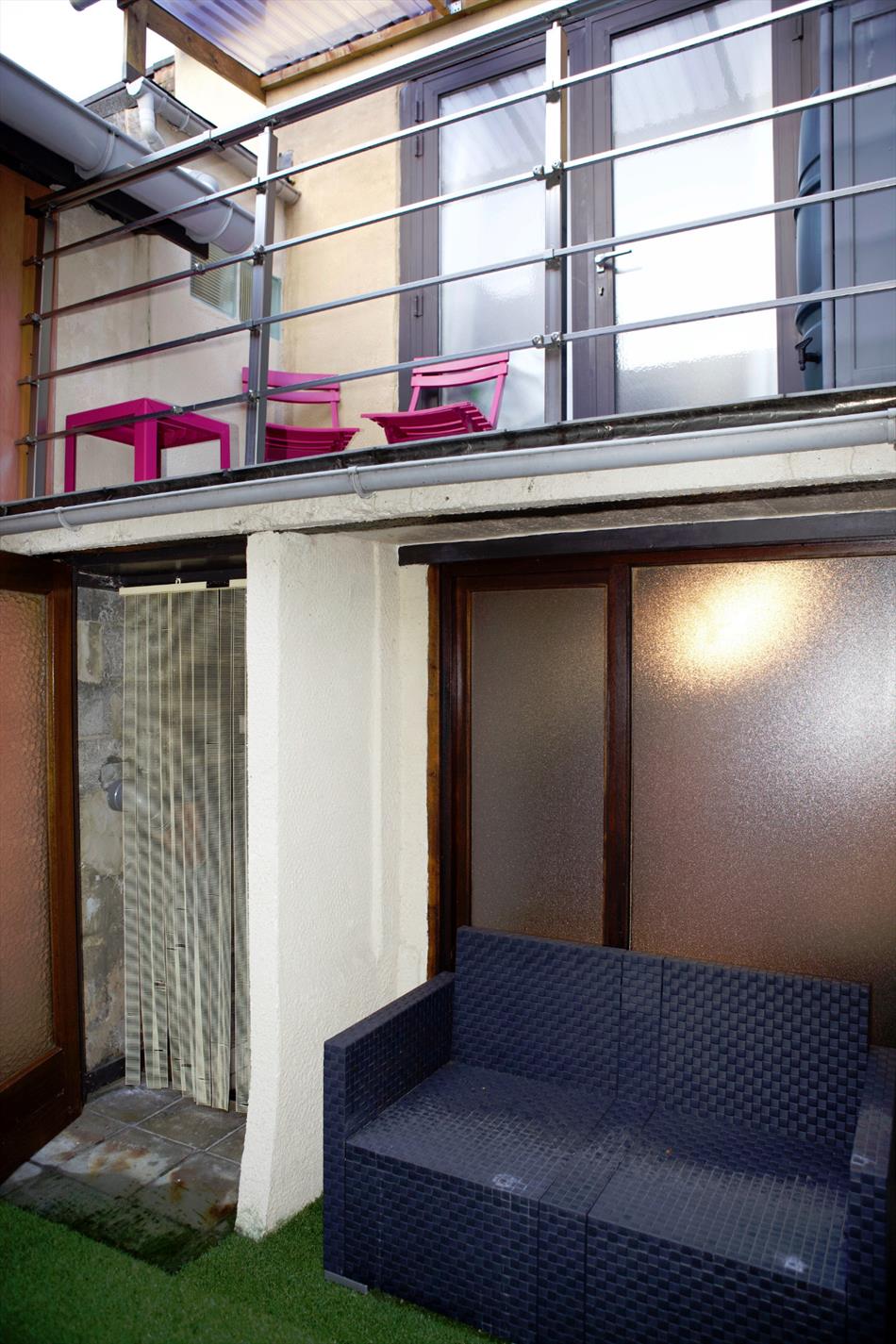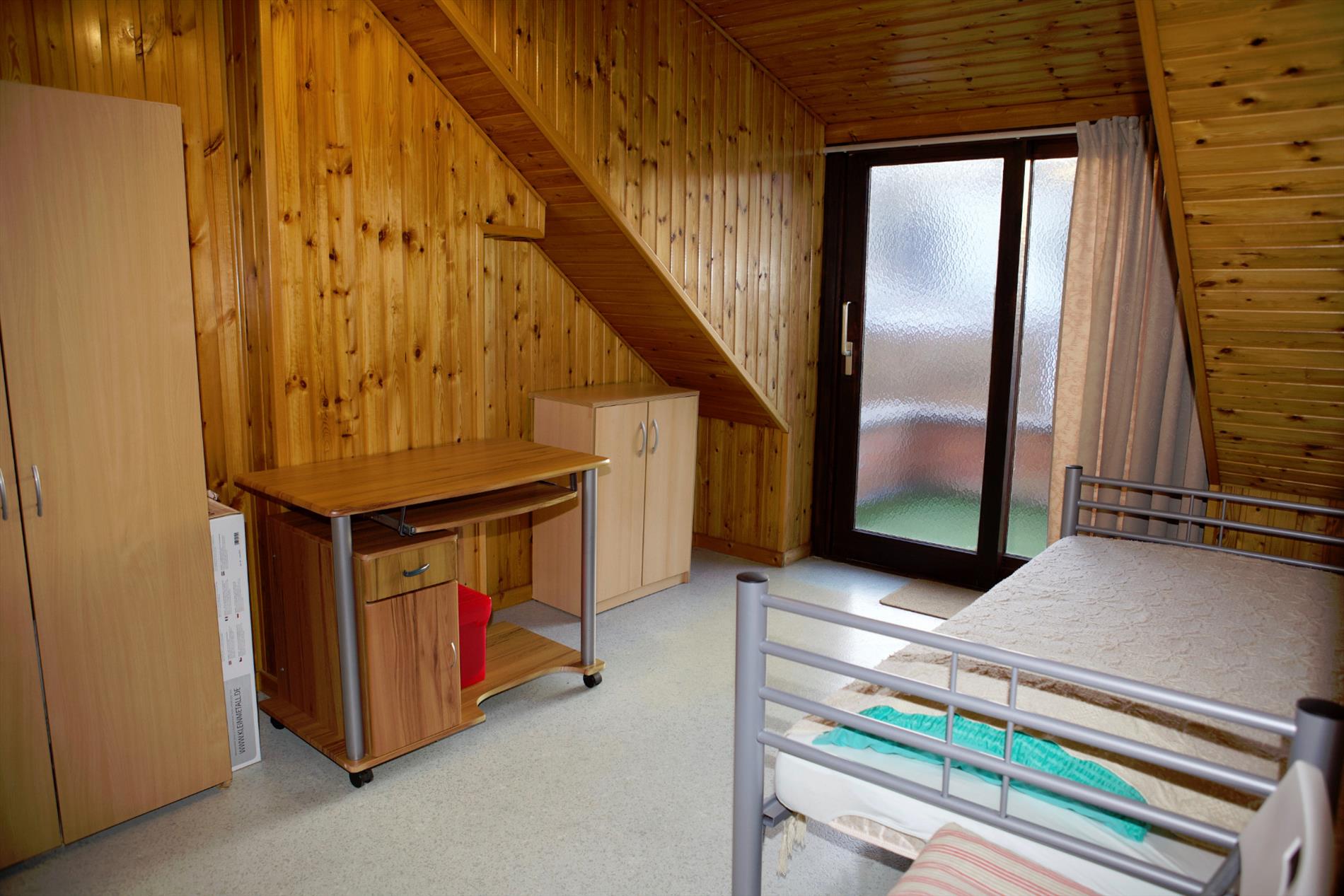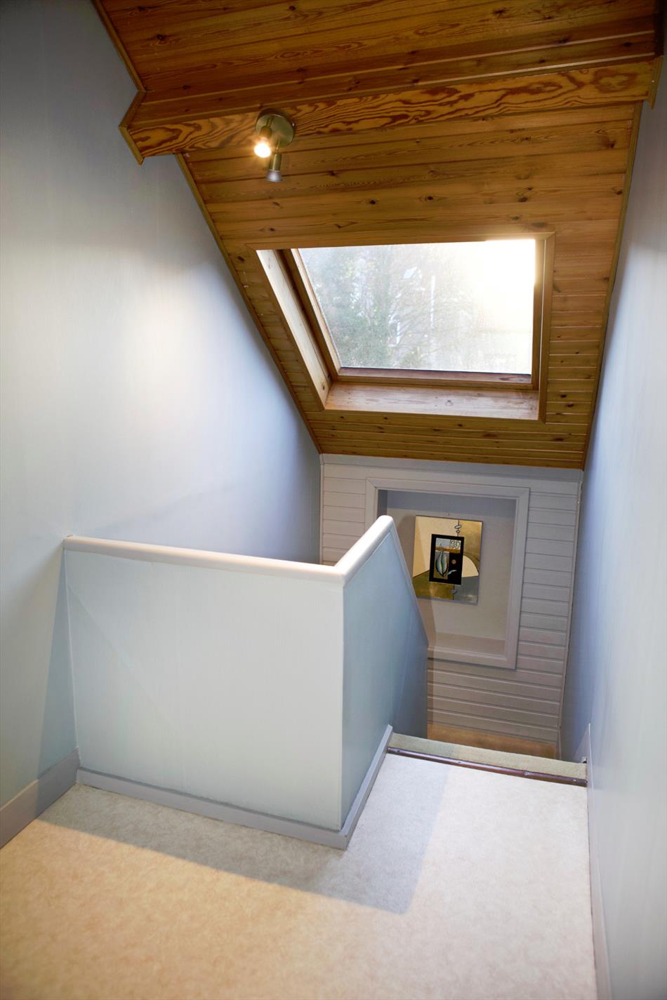 b) eerste verdieping: overloop,- grote voor-slaapkamer (4,02 x 4,53) met gaskachel (plafond in planchetten),- achter-slaapkamer (4,25 x 2,90) met schuifraam,- terras (2,01 x 3,21 - zonnekant) met nieuwe roofing + kunstgras ;
