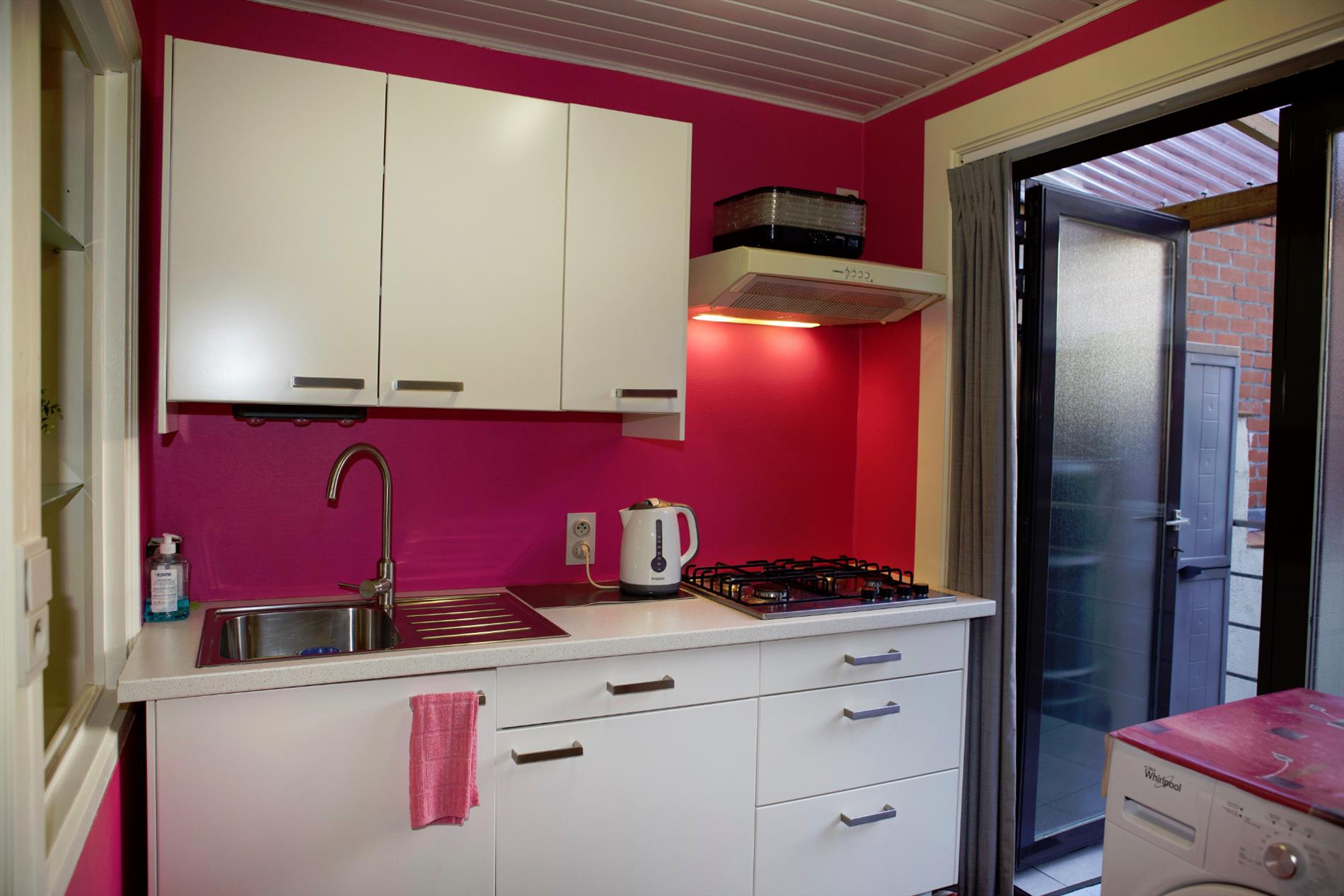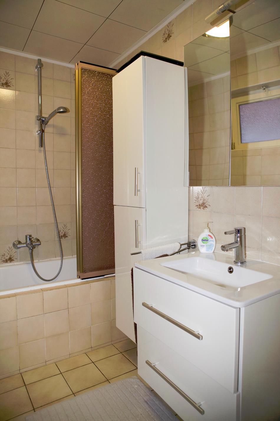 a) gelijkvloers: Inkomhal,- living (8,50 x 2,95) met eetplaats en salon met nieuwe gaskachel en tellerkast,- keuken (2,76x 1,54) met kasten, spoelbak, werkblad in kunststof, gaskookplaat en nis voor koelkast (niet inbegrepen in de prijs, dit is eigendom van de huurder),- terras (1,52 x 2,84) nieuwe balustrade + tegels,- tussenverdieping (-1) met badkamer (2,35 x 3,32) met nieuw toilet, meubel + lavabo en ligbad (faience) ;