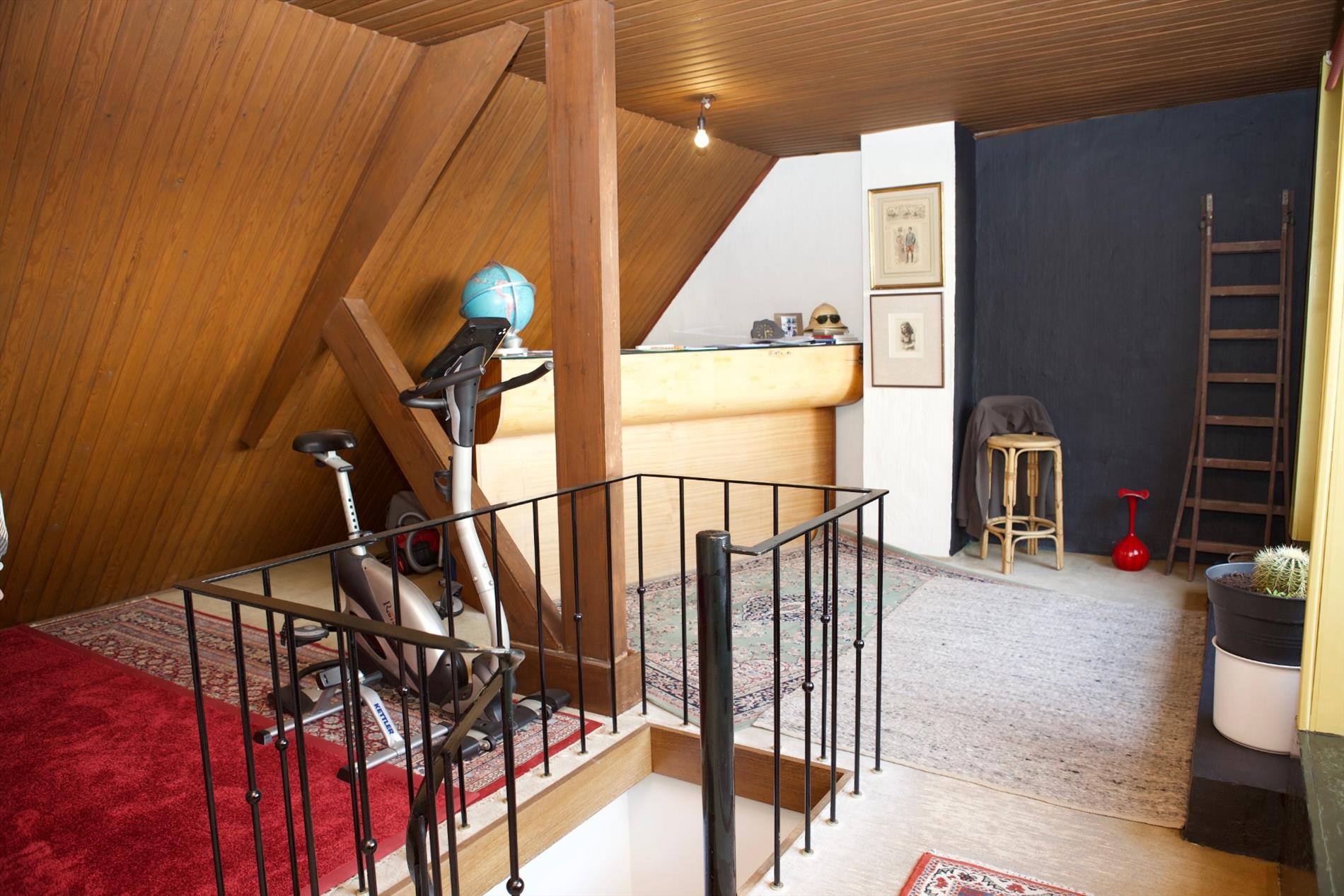Zolderverdiep: met hobby- & fitnessruimte + terrasschuifraam (geïsoleerd plafond),- en groot zonneterras.