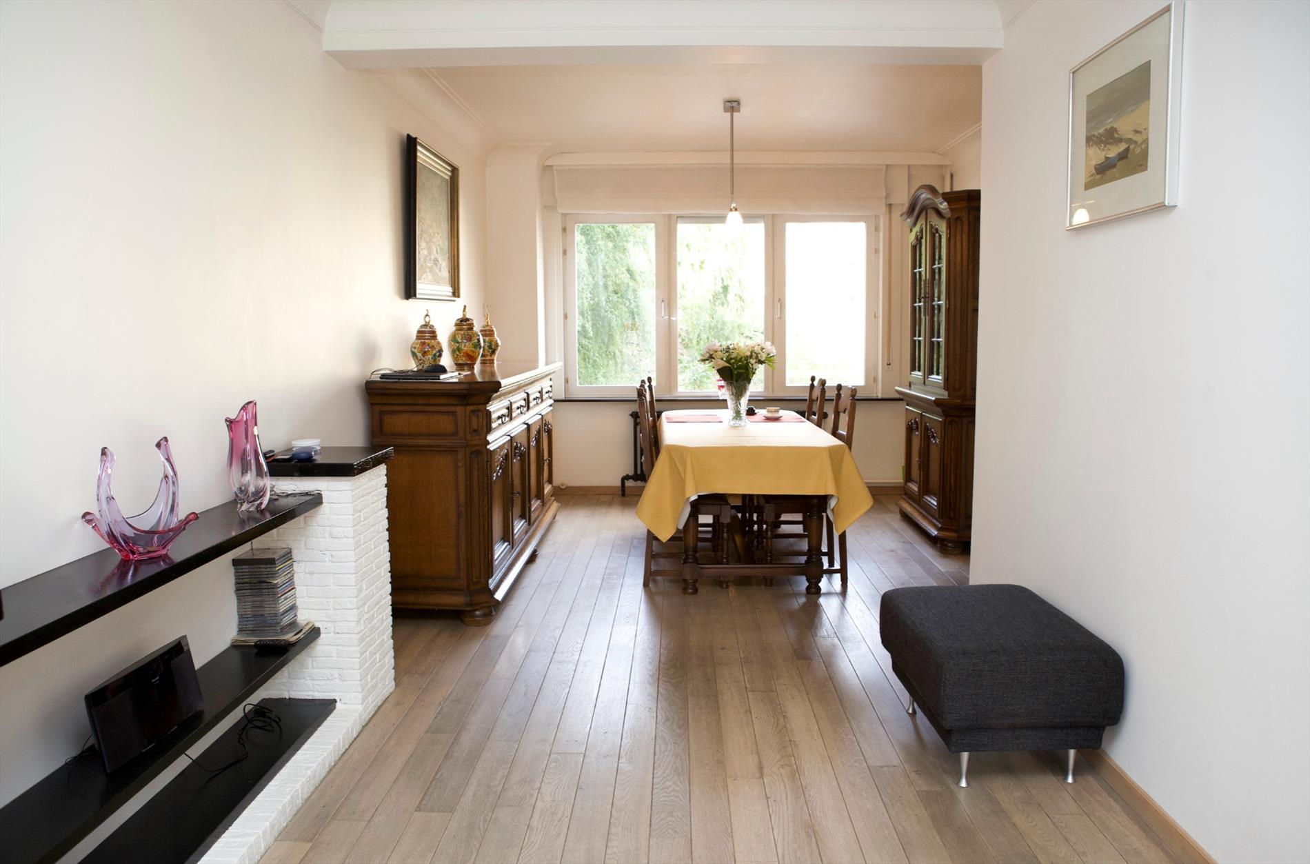 1ste verdiep: overloop & traphal (glazen deur),- woonkamer (38 m²) met sierschouw (in metselwerk) + ingebouwde gashaard (eiken parket),- keuken (3,42 x 2) met nieuwe L-vormige keukenblok (witte meubelplaat) + ingebouwde inox afwasbak, keramische kookplaat, dampkap, micro-combi-oven, en frigo ;