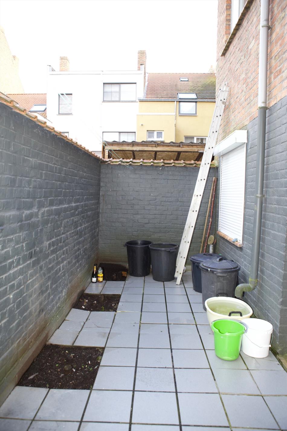 Karaktervolle “burgerswoning”, stevig en op traditionele wijze gebouwd in 1958, op een perceel bouwgrond met breedte van 6 m. en diepte van 12,34 m. Bruikbare vloeroppervlakte: 216 m² * beschermd volume: 607 m³. Stevige funderingen en geïsoleerde vloerplaten in gewapend beton op alle verdiepingen. Sierlijke voorgevel, in een paramentmetselwerk van bruine genuanceerde gevelsteen, met onderplint en deur- & vensterdorpels in harde blauwsteen. Verzorgd buitenschrijnwerk vooraan in aluminium en achteraan in PVC + dubbele beglazing. Hard zadeldak, belegd met platte Pottelbergse pannen + onderdak en isolatie. Vol-eiken parket en louverdrape (zonnewering) in de living. Tegelvloeren in de hal, garage, berging, w.c.’s, badkamer, keuken, en koer. Voorzien van stads- en regenwater, elektriciteit (dag- en nachttarief), distributie, digitale tv, internet, telefoon, riolering, en centrale verwarming (d.m.v. aardgas-wandgenerator Vaillant).