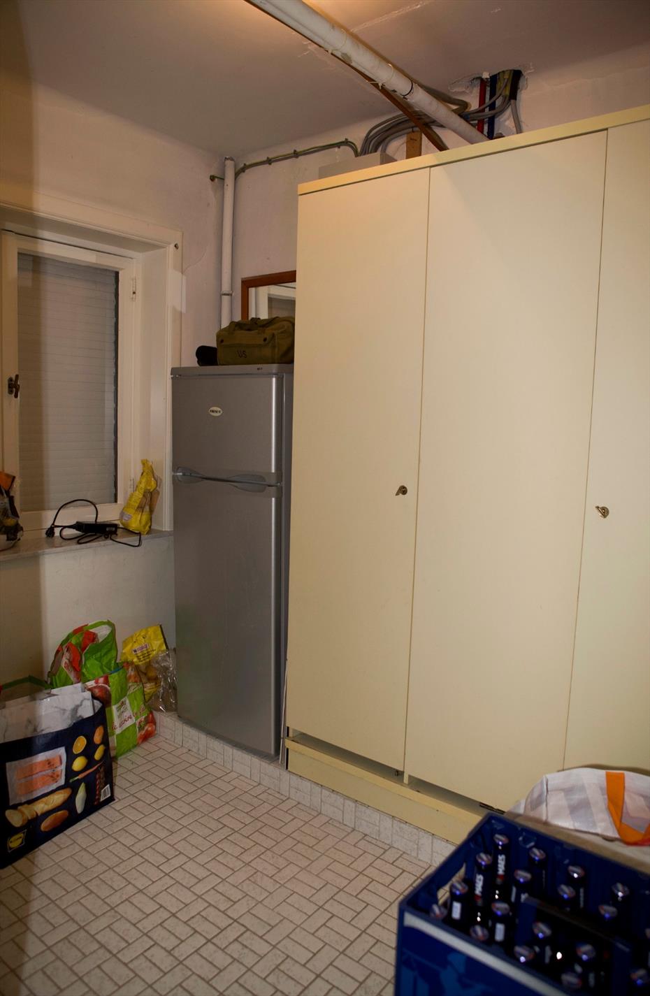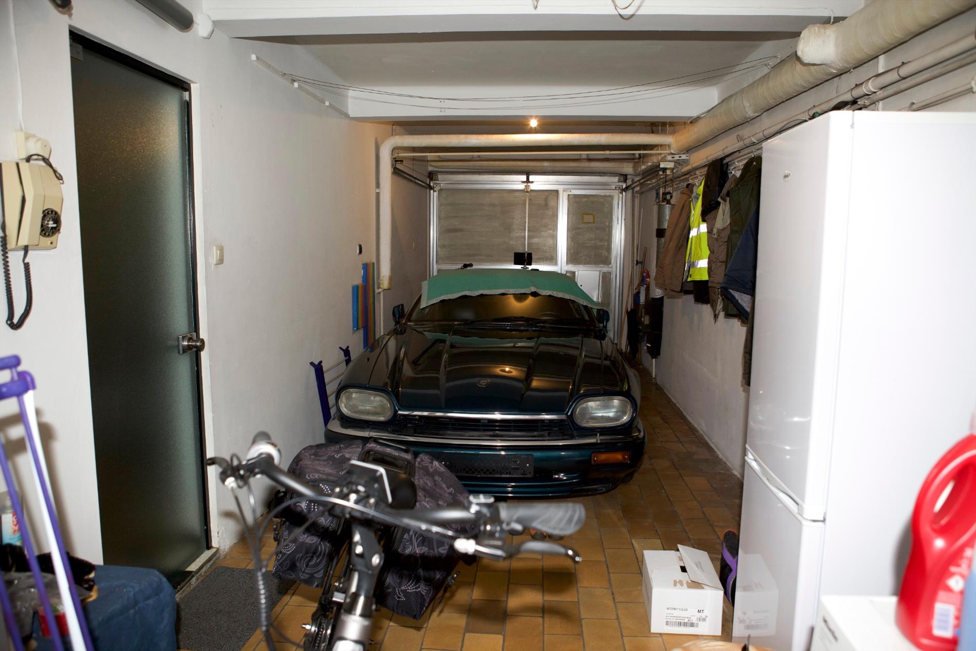 gelijkvloers: imposante inkomhal met vestiaire en metalen spiltrap + eiken treden (glazen deuren naar berging & w.c),- toilet met w.c. & lavabo,- koele berging (2,43 x 2),- garage (27,12 m²) en wasruimte (aluminium poort * aansluiting voor was- & droogautomaat * warmwatergeiser * c.v.-wandgenerator * en achterdeur (PVC),- en koer ;