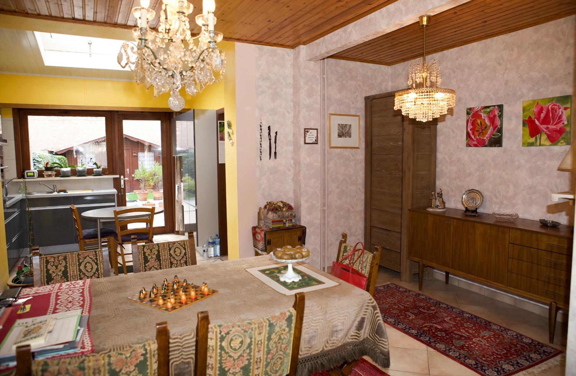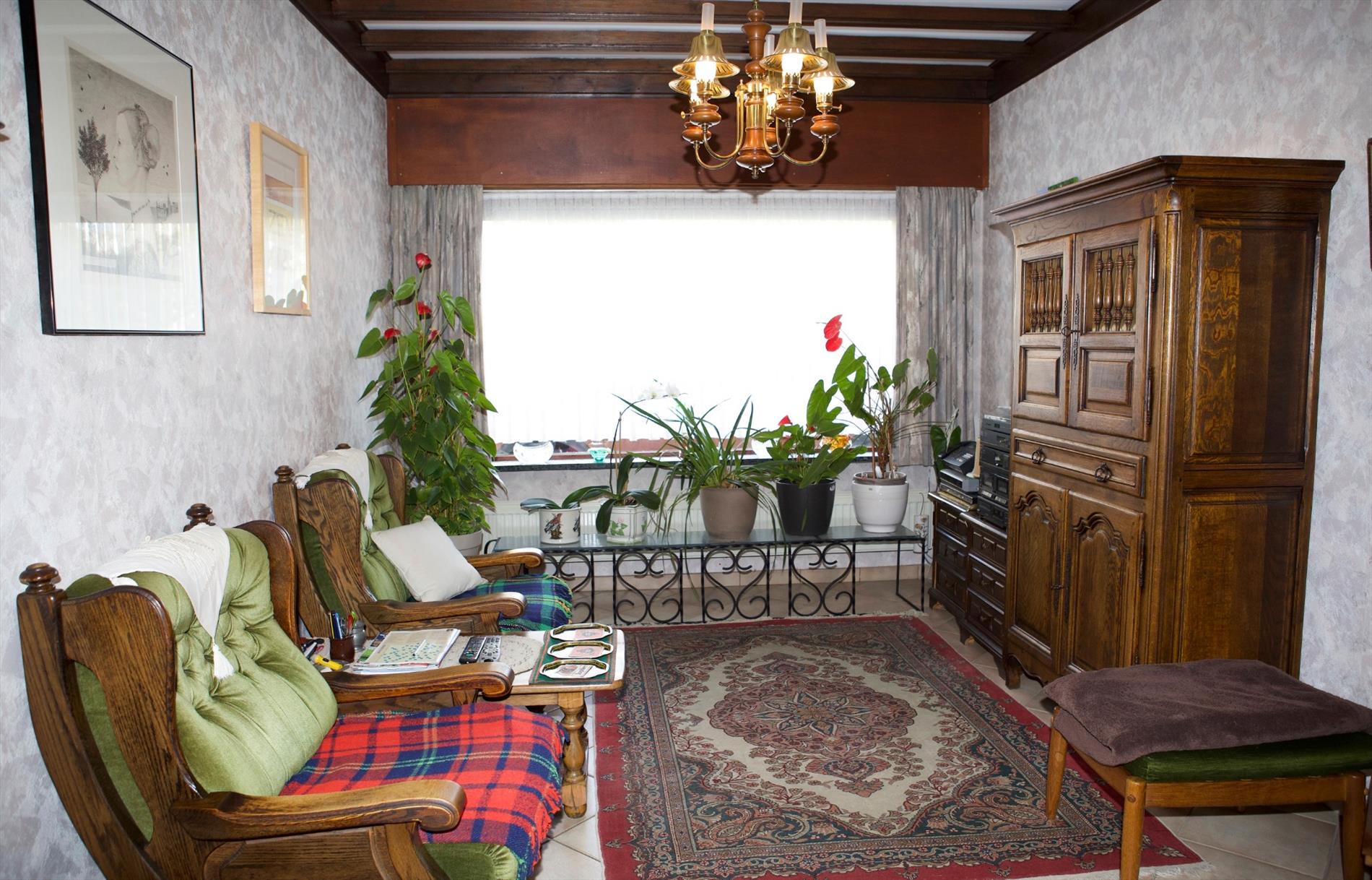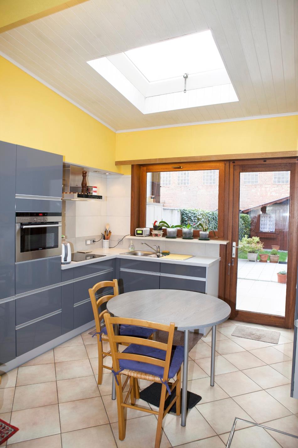 a) gelijkvloers: inkomhal met trap (gebetonneerd en afgewerkt met granitosteen) en elektriciteitsteller & zekeringskast,- toilet met w.c. (op regenwater),- woonkamer (34 m²) met salon (4,20 x 3,15 * rustiek plafond + balkjes) en eetplaats (4,20 x 4,95),- aansluitende keuken met lichtkoepel, en nieuwe L-vormige keukenblok + ingebouwde inox afwasbak, combi-microgolfoven, keramische kookplaat, vaatwasautomaat, frigo, en diepvriezer, lichtkoepel,- vernieuwde badkamer (3 x 1,60) met douche, toiletmeubel + ingebouwde lavabo, aardgasgeiser Viessman, handdoekradiator, en wasruimte met aansluiting was- & droogautomaat,- overdekte koer,- zonneterras,- zonnig en intiem tuintje met gerenoveerde houten tuinhuis (+ elektriciteit) ;