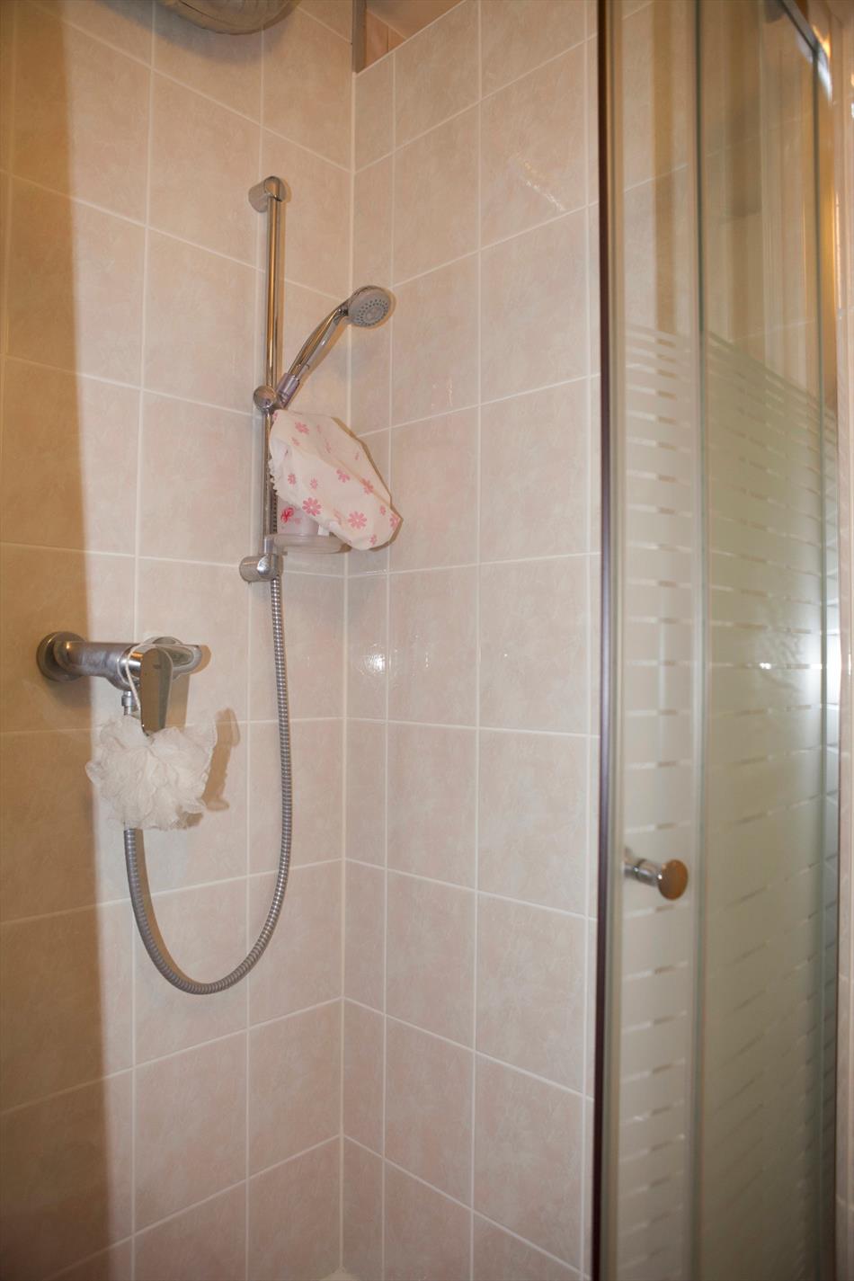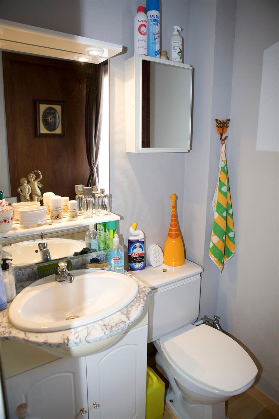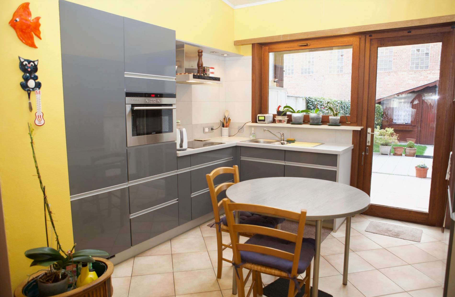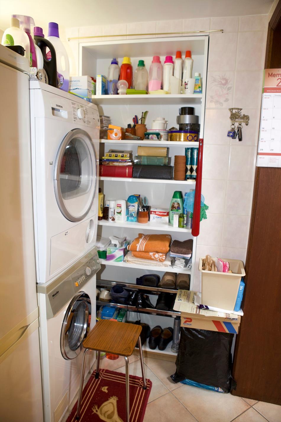 a) gelijkvloers: inkomhal met trap (gebetonneerd en afgewerkt met granitosteen) en elektriciteitsteller & zekeringskast,- toilet met w.c. (op regenwater),- woonkamer (34 m²) met salon (4,20 x 3,15 * rustiek plafond + balkjes) en eetplaats (4,20 x 4,95),- aansluitende keuken met lichtkoepel, en nieuwe L-vormige keukenblok + ingebouwde inox afwasbak, combi-microgolfoven, keramische kookplaat, vaatwasautomaat, frigo, en diepvriezer, lichtkoepel,- vernieuwde badkamer (3 x 1,60) met douche, toiletmeubel + ingebouwde lavabo, aardgasgeiser Viessman, handdoekradiator, en wasruimte met aansluiting was- & droogautomaat,- overdekte koer,- zonneterras,- zonnig en intiem tuintje met gerenoveerde houten tuinhuis (+ elektriciteit) ;