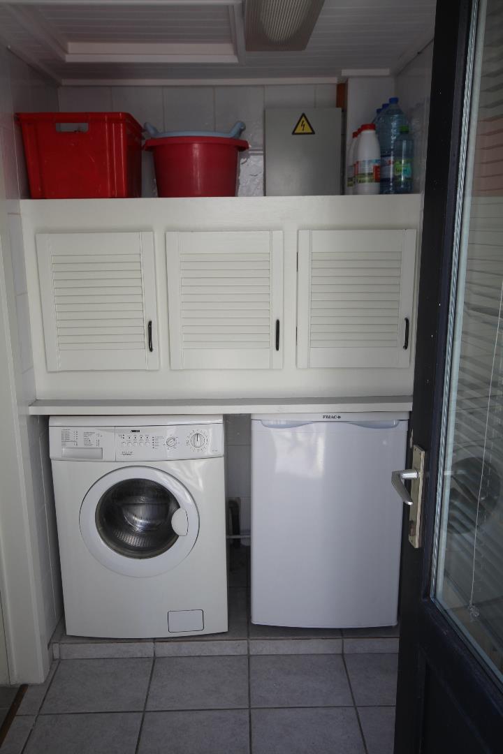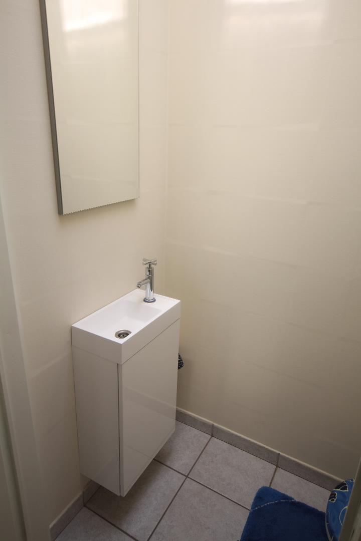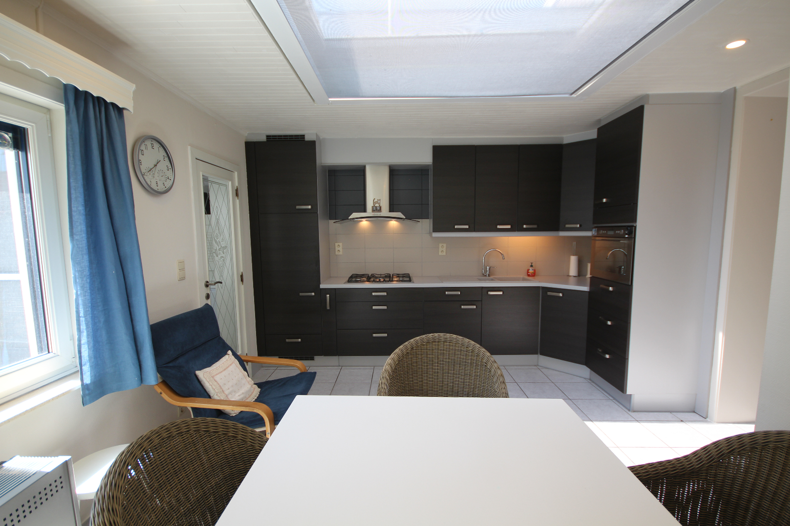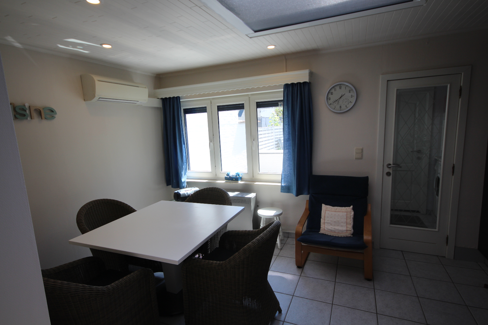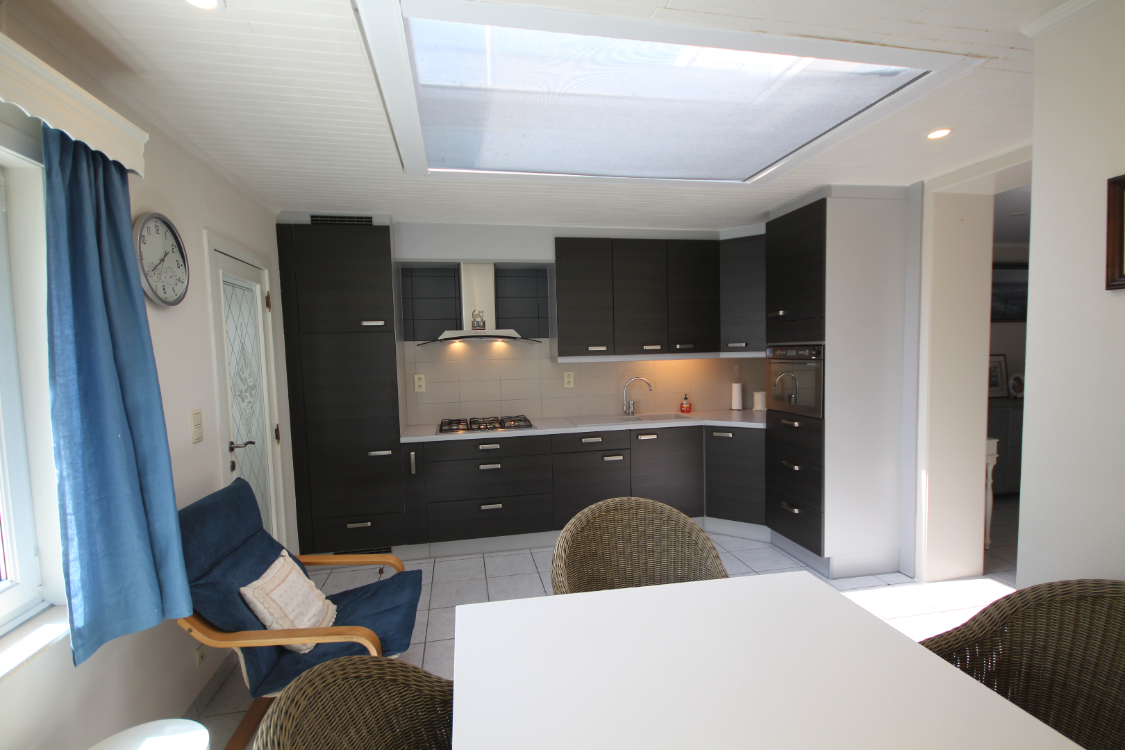 - gelijkvloers: met gang + vestiaire,- w.c. + ingemaakte kast, en meubel + lavabo (lichtkoepel),- salon (27 m²) met rustieke sierschouw + eiken balk + gashaard,- aanbouw met eetplaats-keuken (17 m²) met gaskachel & airco, grote lichtkoepel, en L-vormige keukenblok (onder- en bovenkasten in donker-grijze meubelplaat) + ingebouwde gas-kookplaat, hang-dampkap in inox, micro-combi-oven, frigo, en dubbele afwasbak in kunststof,- sas met zekeringkast, SMA-Solar netgekoppelde omvormer (zonnepanelen), ingebouwde kast, koerdeur, zolderluik, en aansluiting voor was- & droogautomaat,- zolderberging (boven de annexe),- badkamer met regendouche, w.c., L-vormige toiletmeubel + ingebouwde lavabo + spiegelkast, en kast met hydrofoor + gasgeiser,- zonnige koer (4,25 x 2,25),- zonneterras (4,68 x 4) + kiesel-tuintje (10,40 x 4,68) + fontein,- en achtergebouw (25,30 m²) met garage + elektrische sectionale poort en werkplaats,- en oprit in betonnen klinkers ;