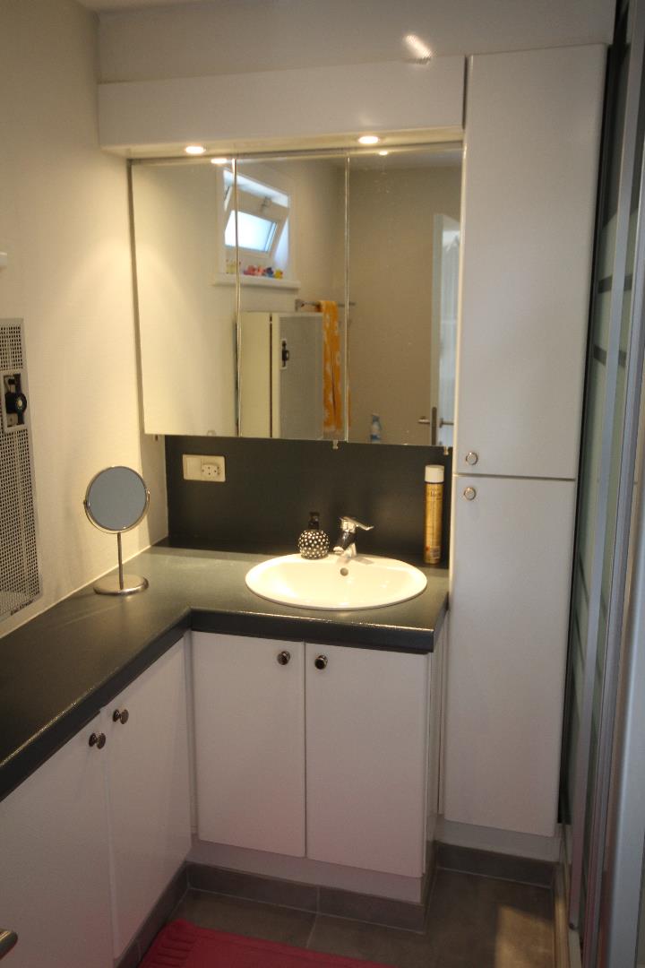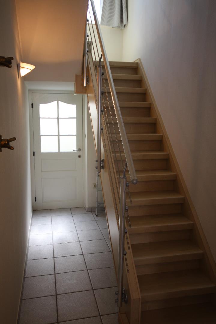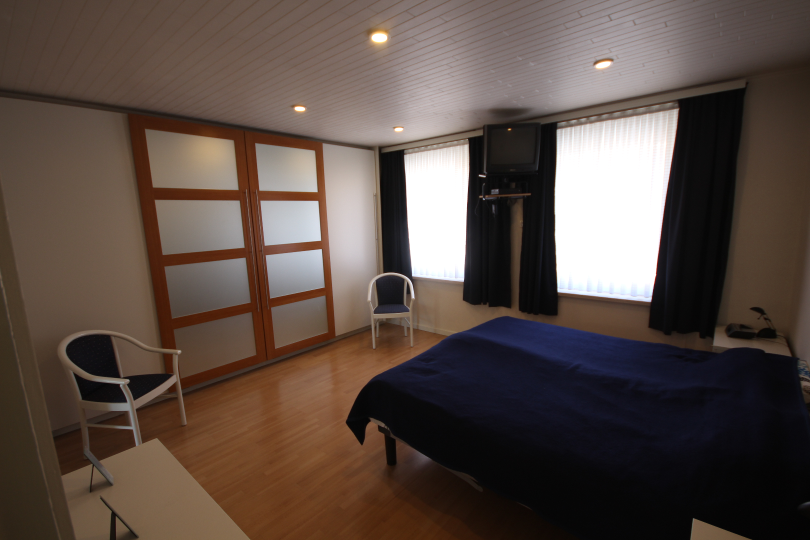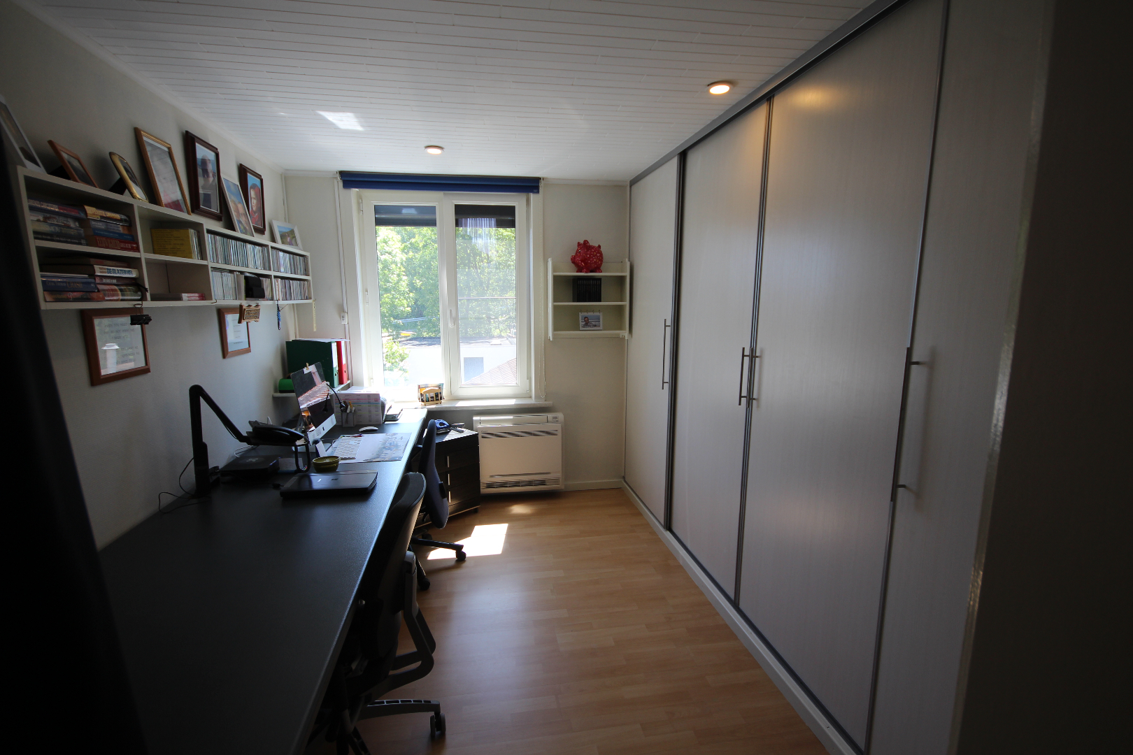 - 1ste verdiep: overloop + zoldertrap,- voor-slaapkamer (4,75 x 3,92) met aanbouw-dressingskasten,- en achter-slaapkamer (3,91 x 3,07 * ingericht als bureau) + aanbouwkasten, en airco ;
