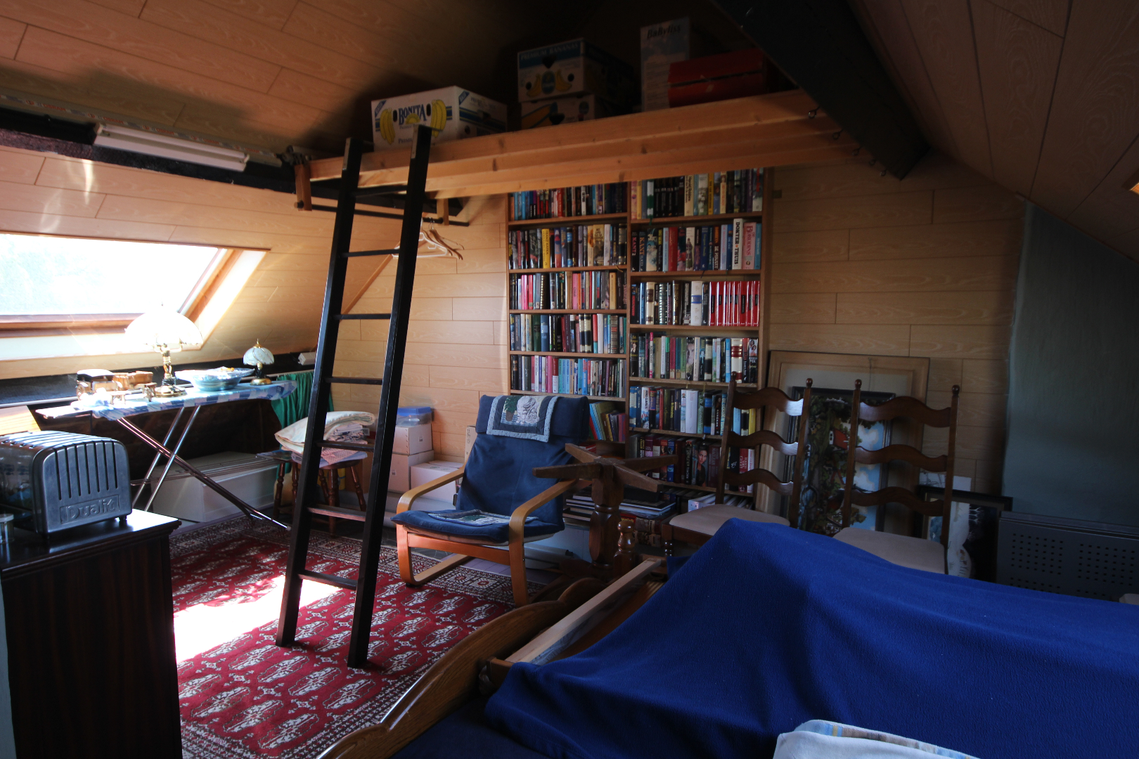 - zolderverdiep: met overloop + bergkast,- en gezellig-ingerichte mansardekamer (28,50 m²) + bibliotheekkasten, 2 grote vlakdakramen, en opperzolder.