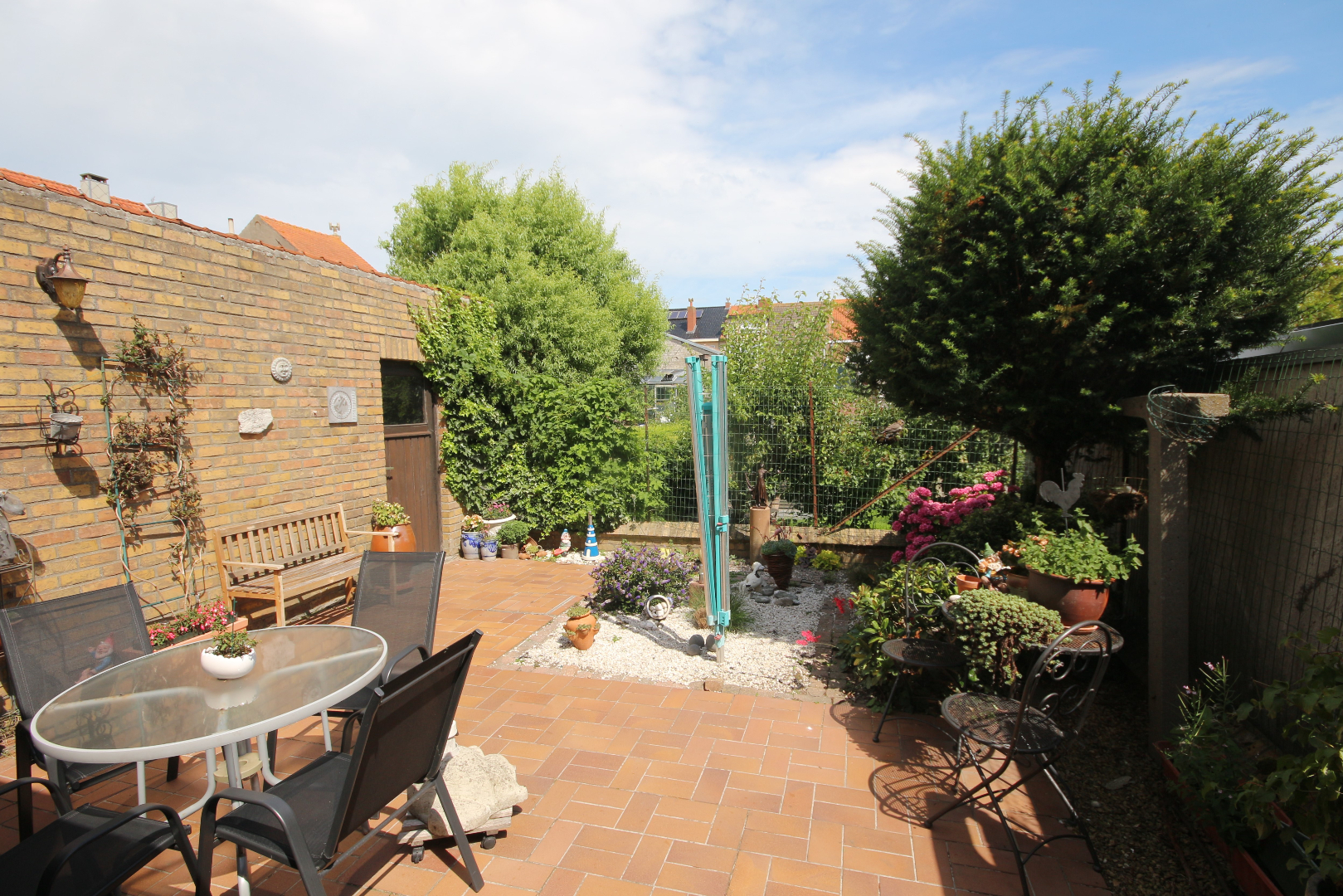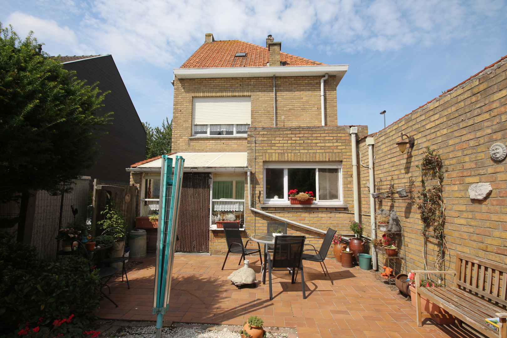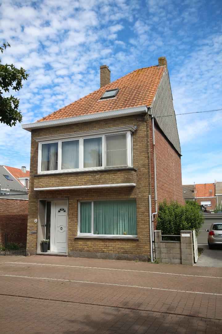 Alleenstaande ééngezinswoning (6,10 x 11,50) met zonnige koer & tuintje, en achterliggende garagegebouw (6,30 x 3,20) + oprit-parking in dallen (10,60 x 3) + opendraaiende smeedijzeren hekken. Gelegen vlak voor een speel- en basketpleintje + aanpalende groenzone (geen vis-à-vis). Stevig en op traditionele wijze opgetrokken in 1963, op een perceel bouwgrond van 157 m² (breedte: 9 m.* diepte: 18 m.). Bebouwde oppervlakte: 90,31 m², * Bruikbare vloeroppervlakte: 113 m², * Beschermd volume: 344 m³. Verzorgde buitengevels (+ spouw) in een paramentmetselwerk van licht kreemkleurige gevelsteen + onderplint in leisteen. Voorgevel met loggia + kroonlijst op de verdieping. Deur- en vensterdorpels in harde blauwsteen. Hard drie-vlakken-dak belegd met rode platte Pottelbergse pannen + veluxraam, en rotswol-isolatie. Zinken dakgoten + witte PVC-bekleding. Verzorgd buitenschrijnwerk, grotendeels in geschilderd hout (enkel glas) + PVC-rolluiken. Voordeur en ramen in de voor-slaapkamer zijn in PVC + dubbele beglazing. PVC-rolluik a/d garage. Tegelvloeren in de living, keuken, veranda, garage, hal, w.c., en badkamer. Binnendeuren in sapoli-hout. De tuin & koer-terras zijn oost-zuid gericht (praktisch gans de dag zon). Mogelijkheid om 2 slaapkamer te maken op de zolder (vaste trap kan gestoken worden in de bergplaats). Mooi zicht op het pleintje vanuit de living en de voor-slaapkamer. Voorzien van stads- en regenwater (citerne van 6 m³), elektriciteit, teledistributie, telefoon, centrale verwarming met stookolie-brander, en riolering (aardgas ligt in de straat).