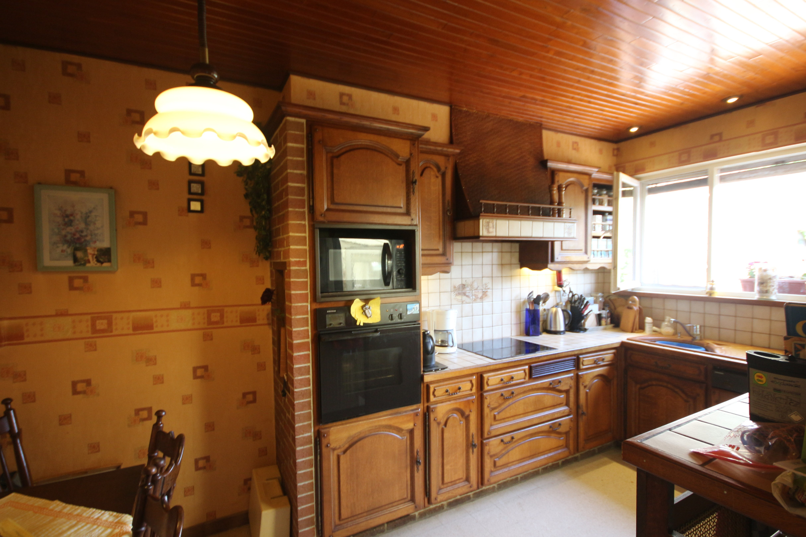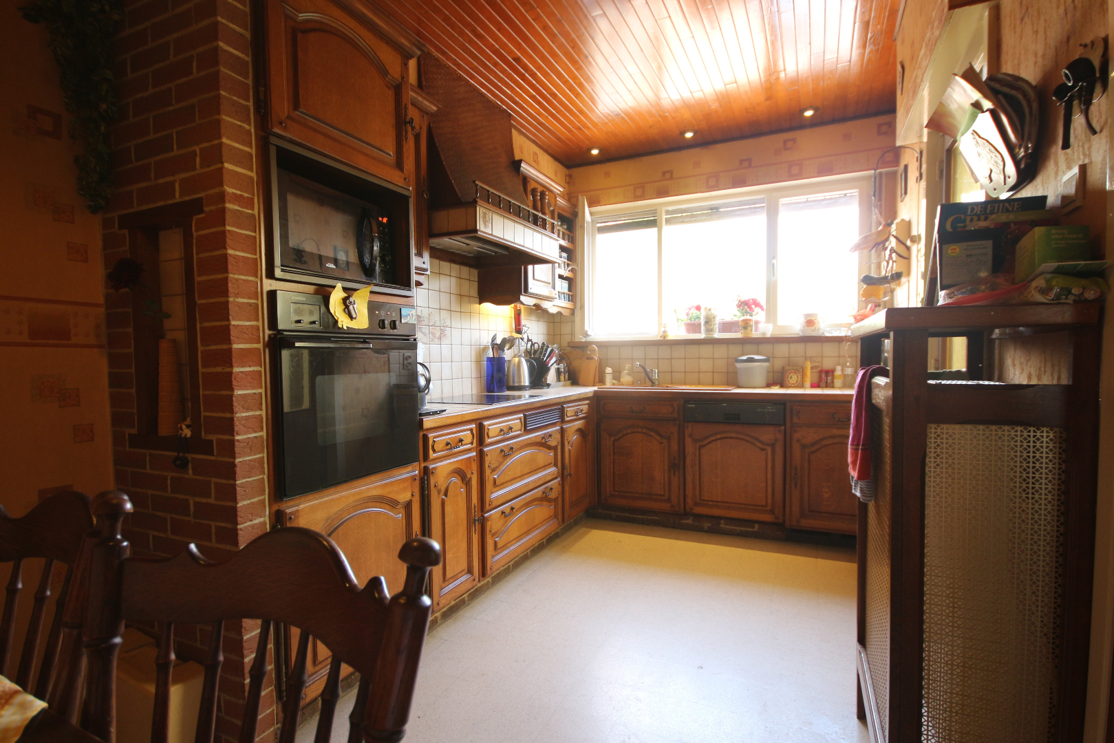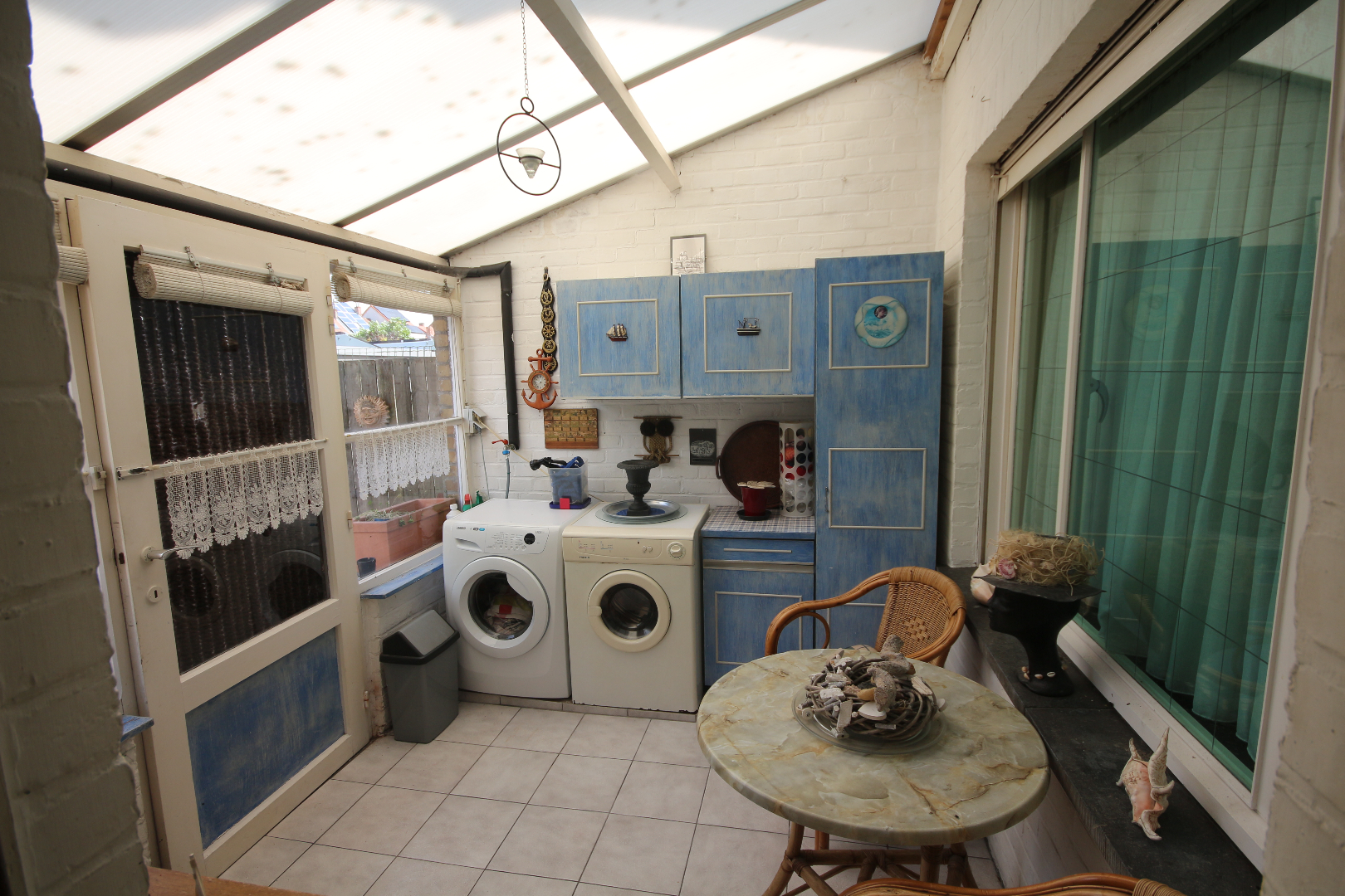 - gelijkvloers en kelder: inkom- & traphal + vestiairekast en trap + granitosteen + smeedijzeren balustrade en stoellift,- toilet met w.c. + lavabo,- kelder met voorraadplaats en stookplaats,- living (30 m²) + marmeren sierschouw,- annexekeuken (4,55 x 2,45) met L-vormige keukenblok (vol-eiken onder- en bovenkasten) + ingebouwde keramische kookplaat, rustieke dampkap, warmeluchtoven, microgolfoven, vaatwasautomaat, en frigo (plafond in eiken planchetten + inbouwspotjes),- veranda (3 x 2,60) + aansluiting was- en droogautomaat,- zonnige koer-terras en stadstuintje (34 m²),- en garage (6 x 2,90) met PVC-rolluik en afgietbak + inox regenwaterpomp (plafond in PVC).