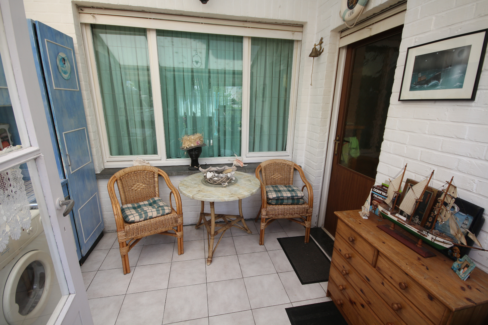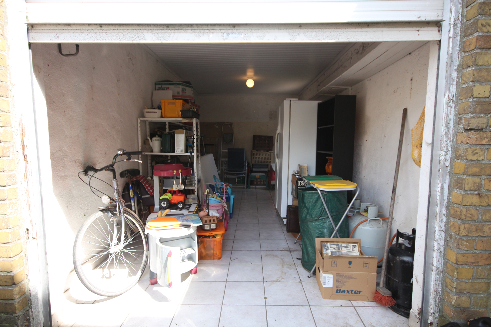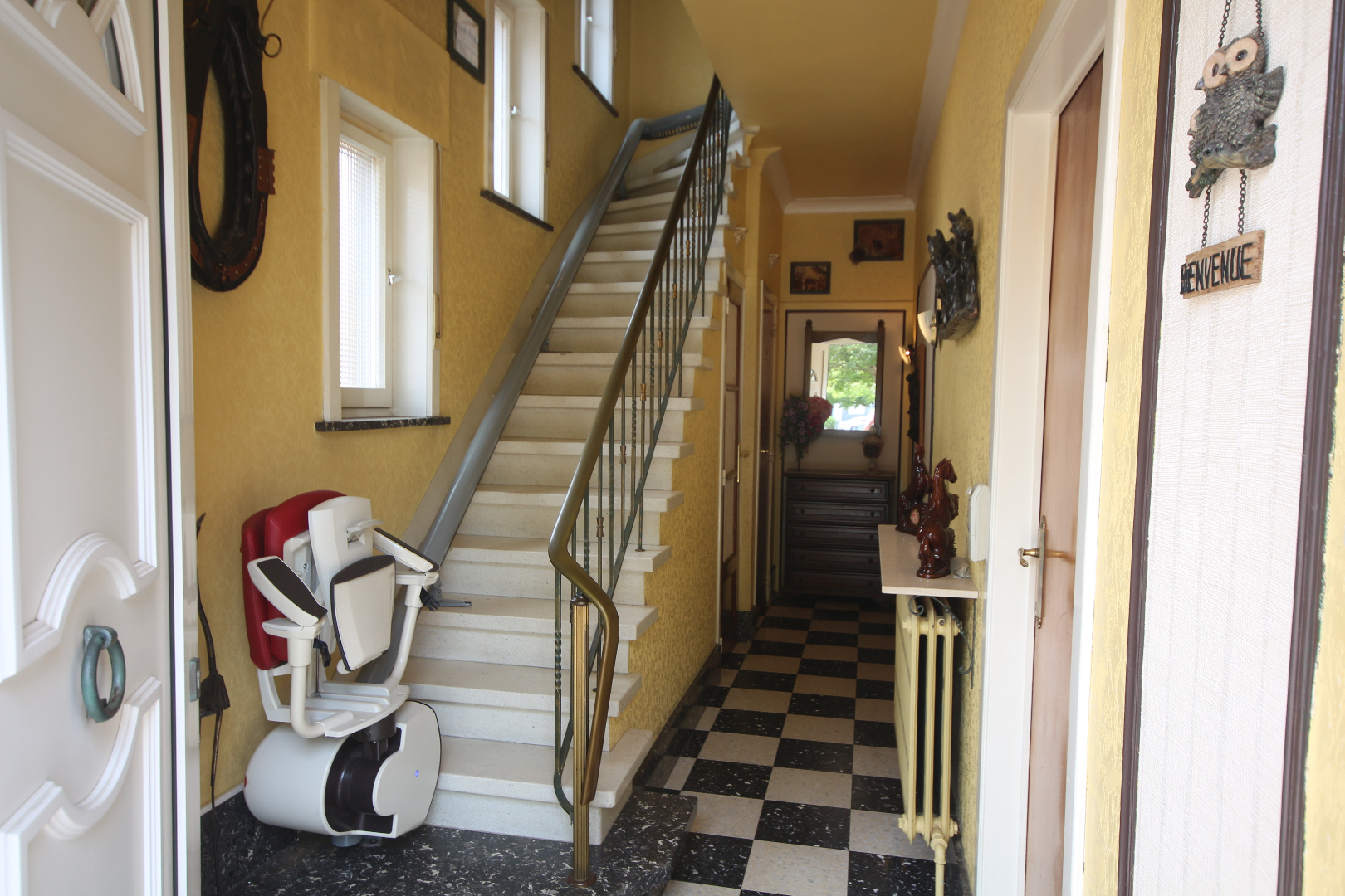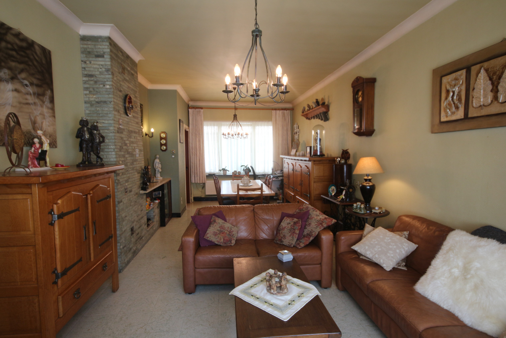 - gelijkvloers en kelder: inkom- & traphal + vestiairekast en trap + granitosteen + smeedijzeren balustrade en stoellift,- toilet met w.c. + lavabo,- kelder met voorraadplaats en stookplaats,- living (30 m²) + marmeren sierschouw,- annexekeuken (4,55 x 2,45) met L-vormige keukenblok (vol-eiken onder- en bovenkasten) + ingebouwde keramische kookplaat, rustieke dampkap, warmeluchtoven, microgolfoven, vaatwasautomaat, en frigo (plafond in eiken planchetten + inbouwspotjes),- veranda (3 x 2,60) + aansluiting was- en droogautomaat,- zonnige koer-terras en stadstuintje (34 m²),- en garage (6 x 2,90) met PVC-rolluik en afgietbak + inox regenwaterpomp (plafond in PVC).